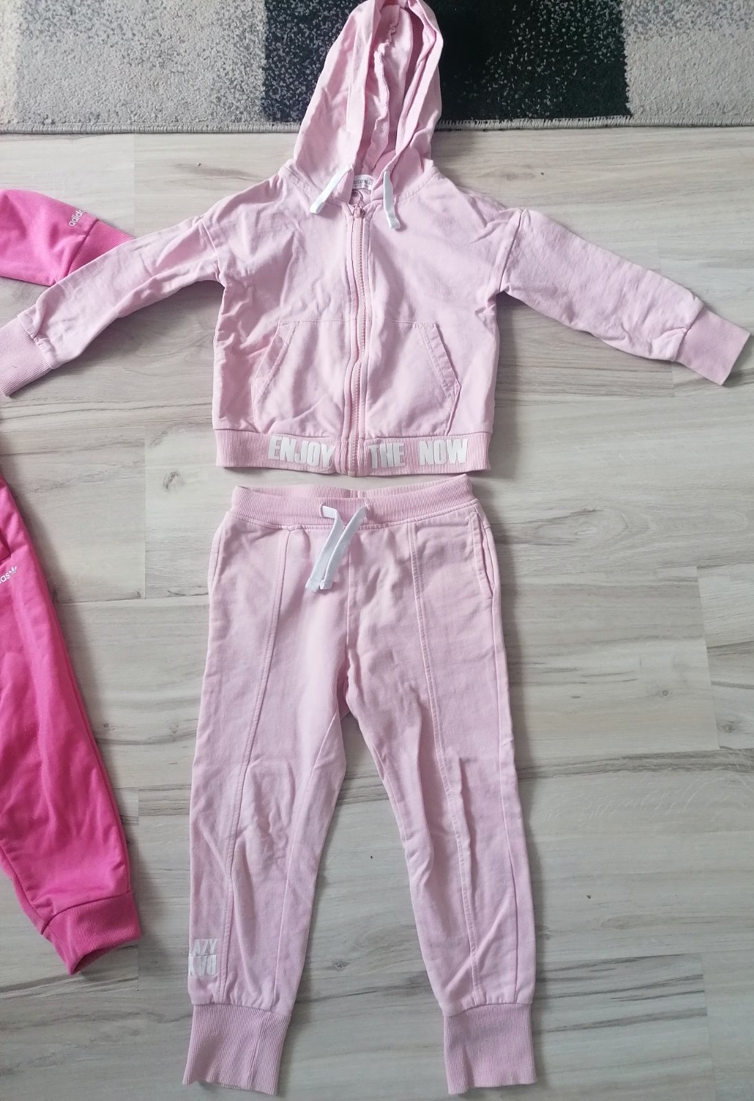 Malo nosena, bez poskodeni, pevne patenty, napisy neosuchane. dlzka teplakov vnutorna 43, celkova 56, pas 2x 23-32. bunda rukav 43 cm.