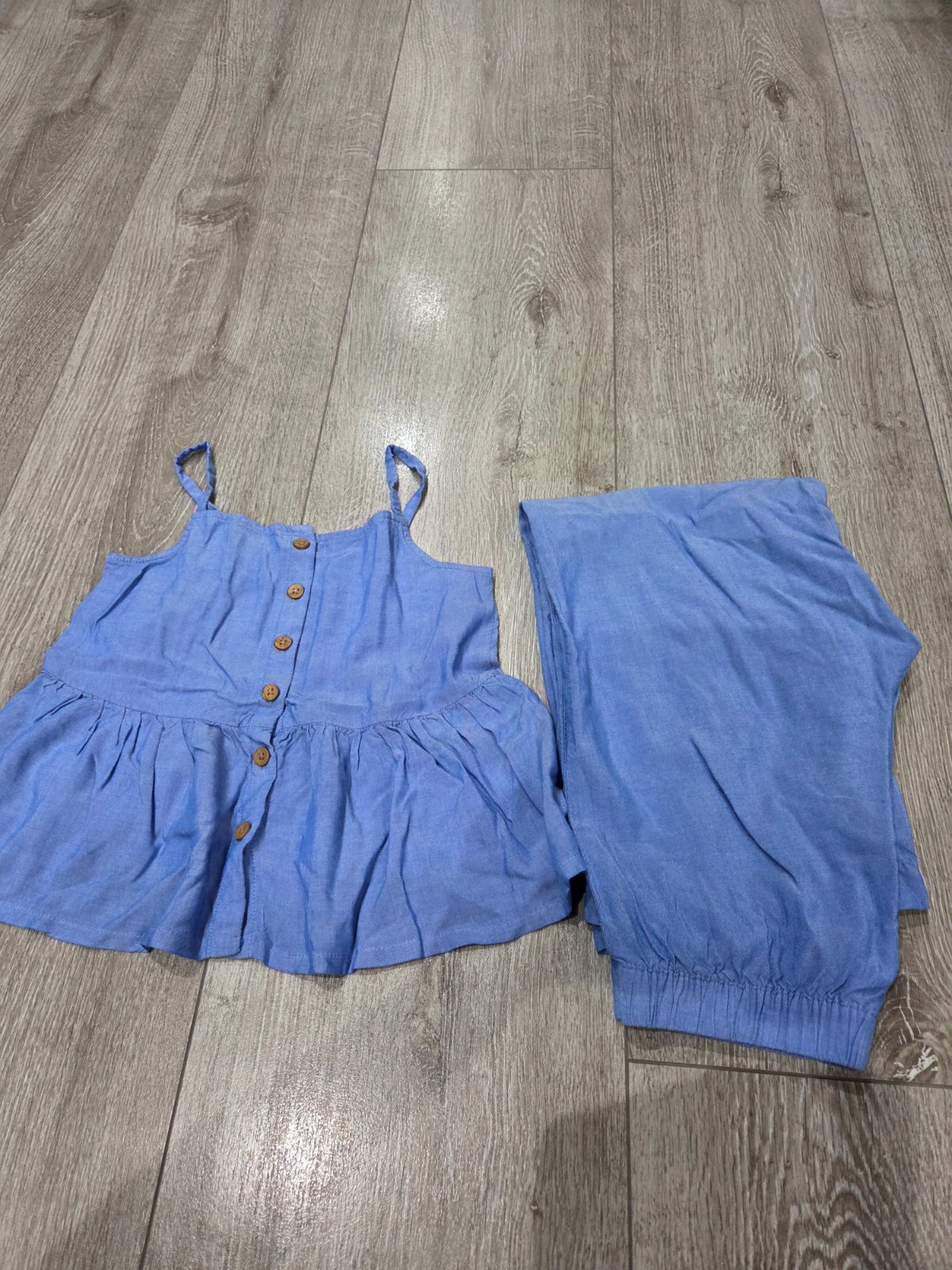 Krásny setík na leto. Pekne to ladí. Nohavice boli skracované na 3/4 a tým pádom sa dajú nosiť dlhšie. Šírka v páse 30 cm. Veľkosť nohavic 128,tričká 8-10 ale podľa mna skôr menšie. Šírka 35 cm, dĺ...