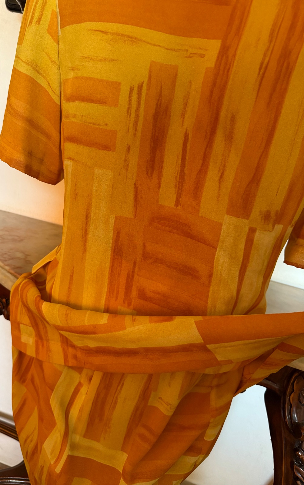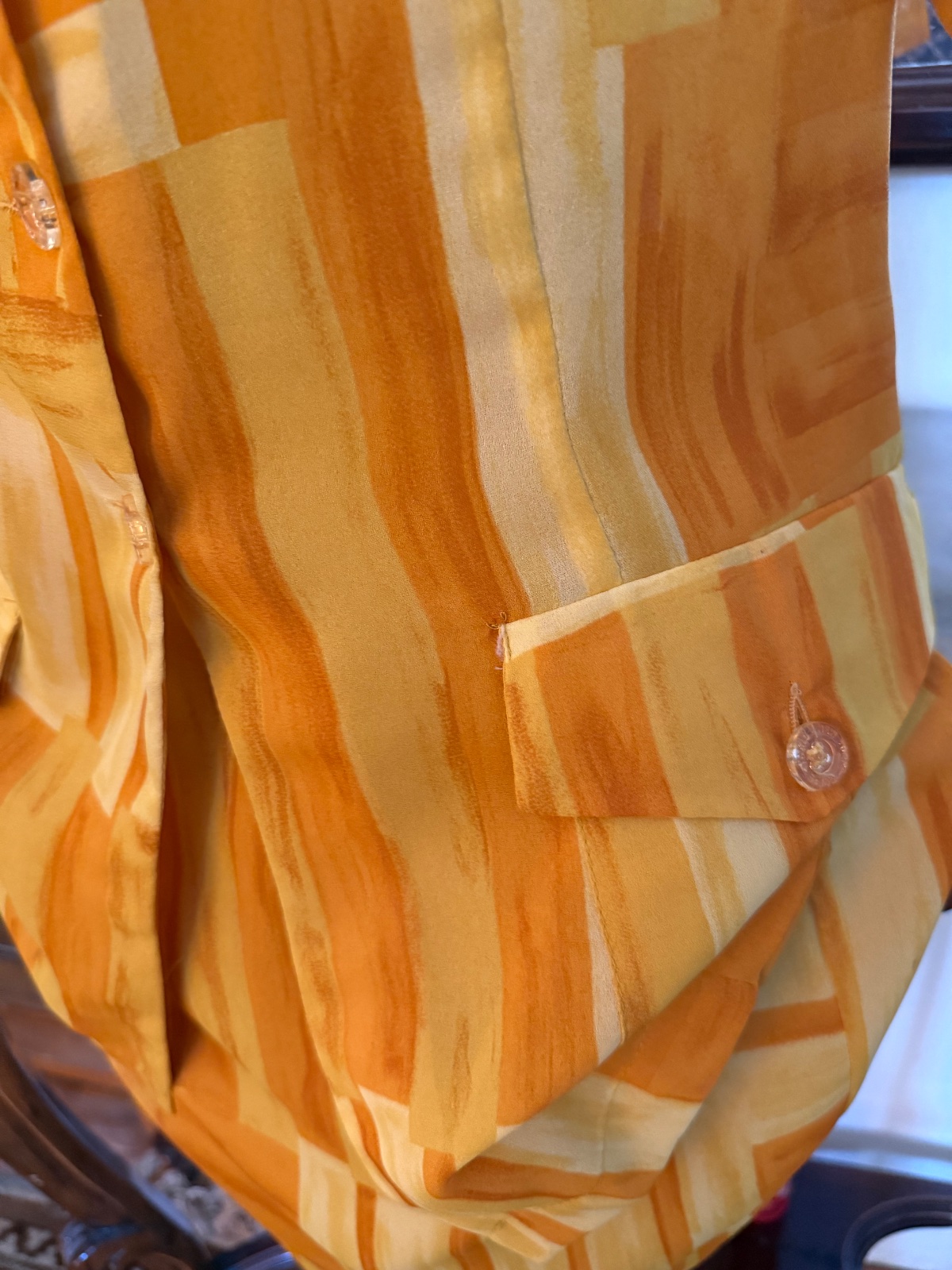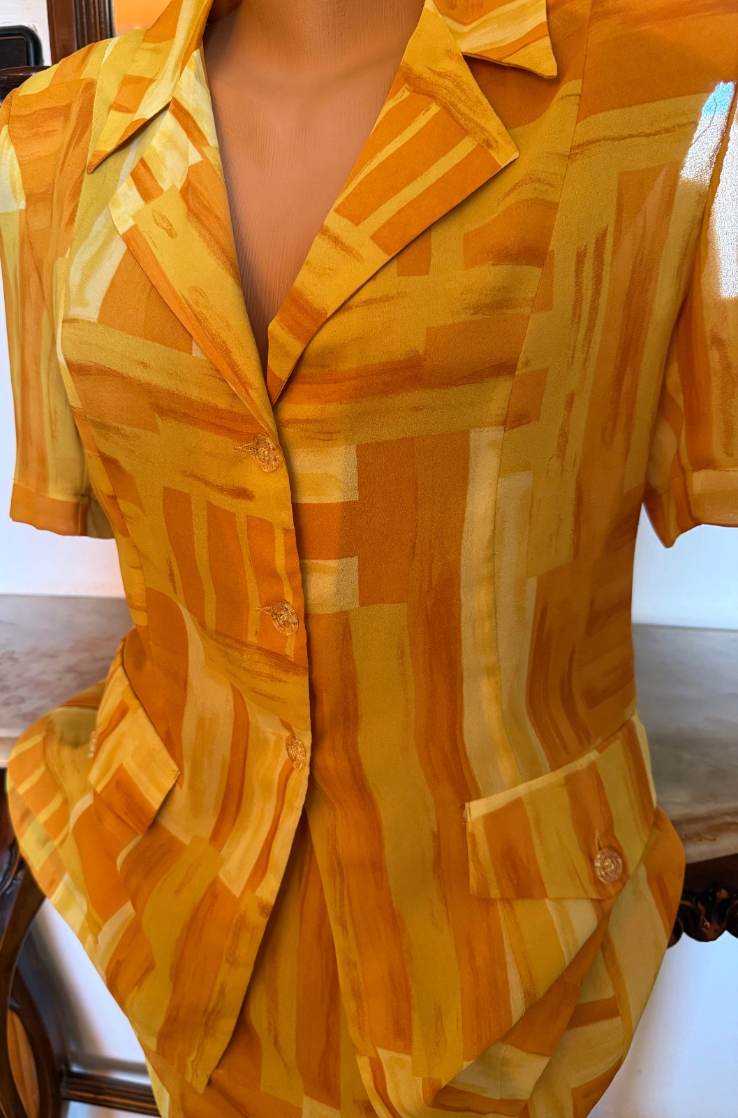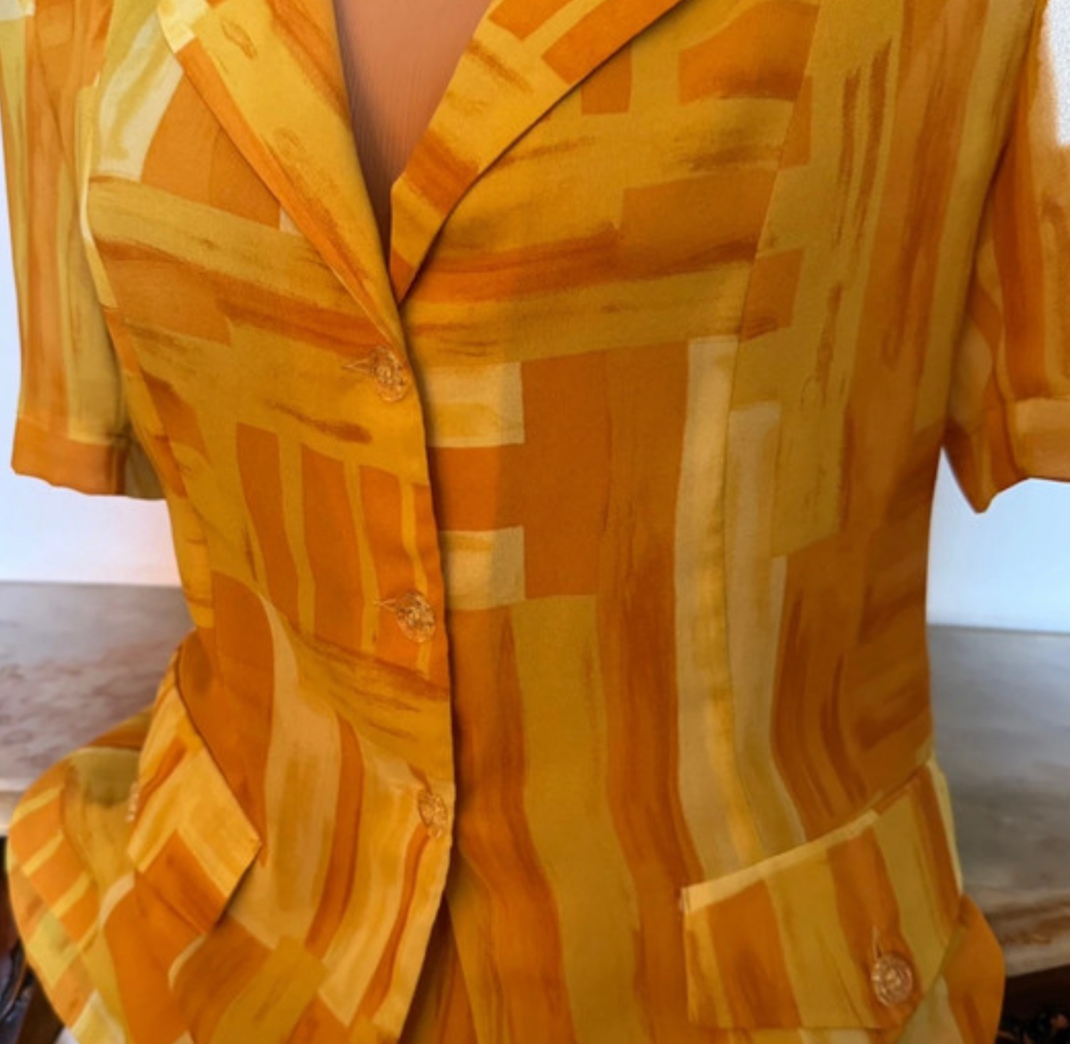 Kvalitný sukňový kostým, sukňa a top so zapínaním, podšitá, sukňa so zapínaním na zips vzadu, materiál 55% bavlna, 45% polyester, farba zlta- oranzeva,super stav.