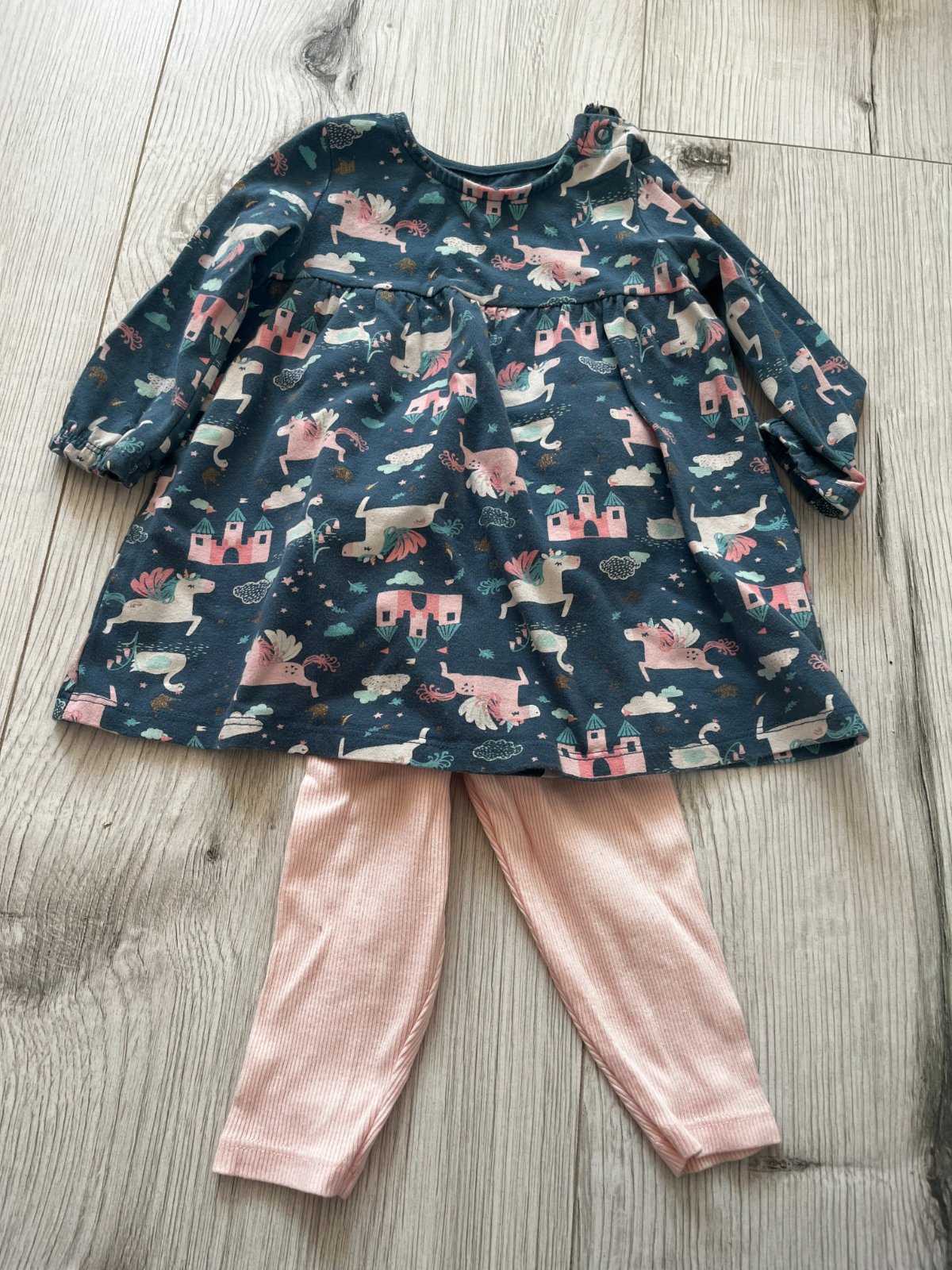 Predám súpravu šiat s dlhým rukávom s obrázkami jednorožcov a ružových vrúbkovaných legín značky F&F, veľkosť: 74