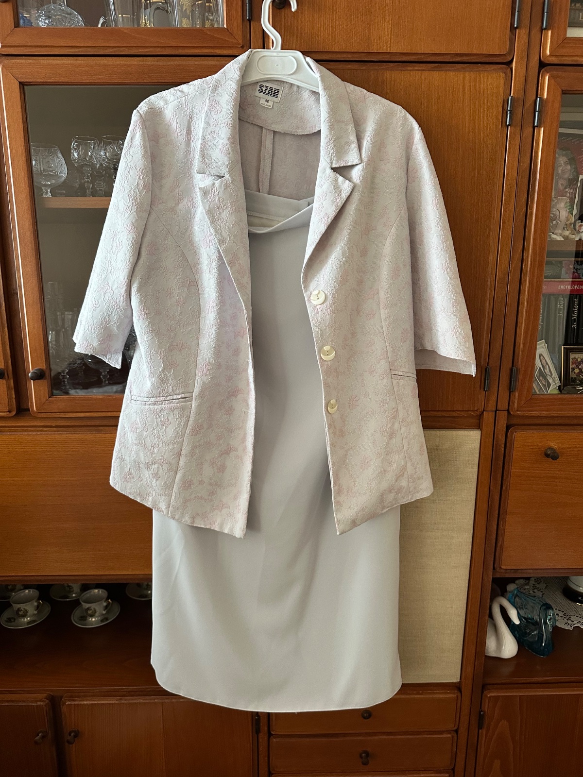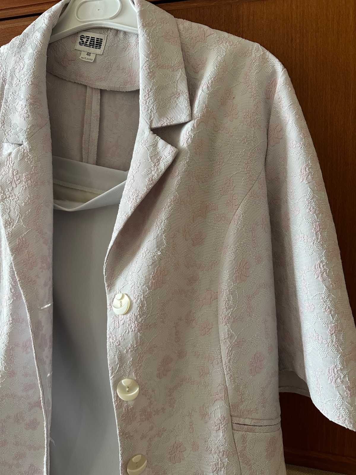 Predám pekný kostým šitý krajčírkou.Rozmery nohavice dĺžka 102 cm pás 2x55 boky 2x69.Rozmery vrch dĺžka 71 cm cez prsia2x63 v páse 2x62 nižšie 2x 69 dĺžka rukáva od pleca 59 cm.PLUS POŠTOVNÉ!