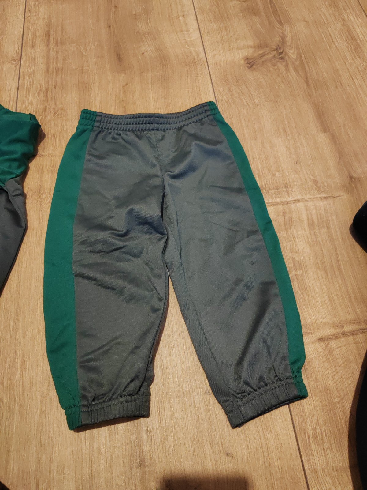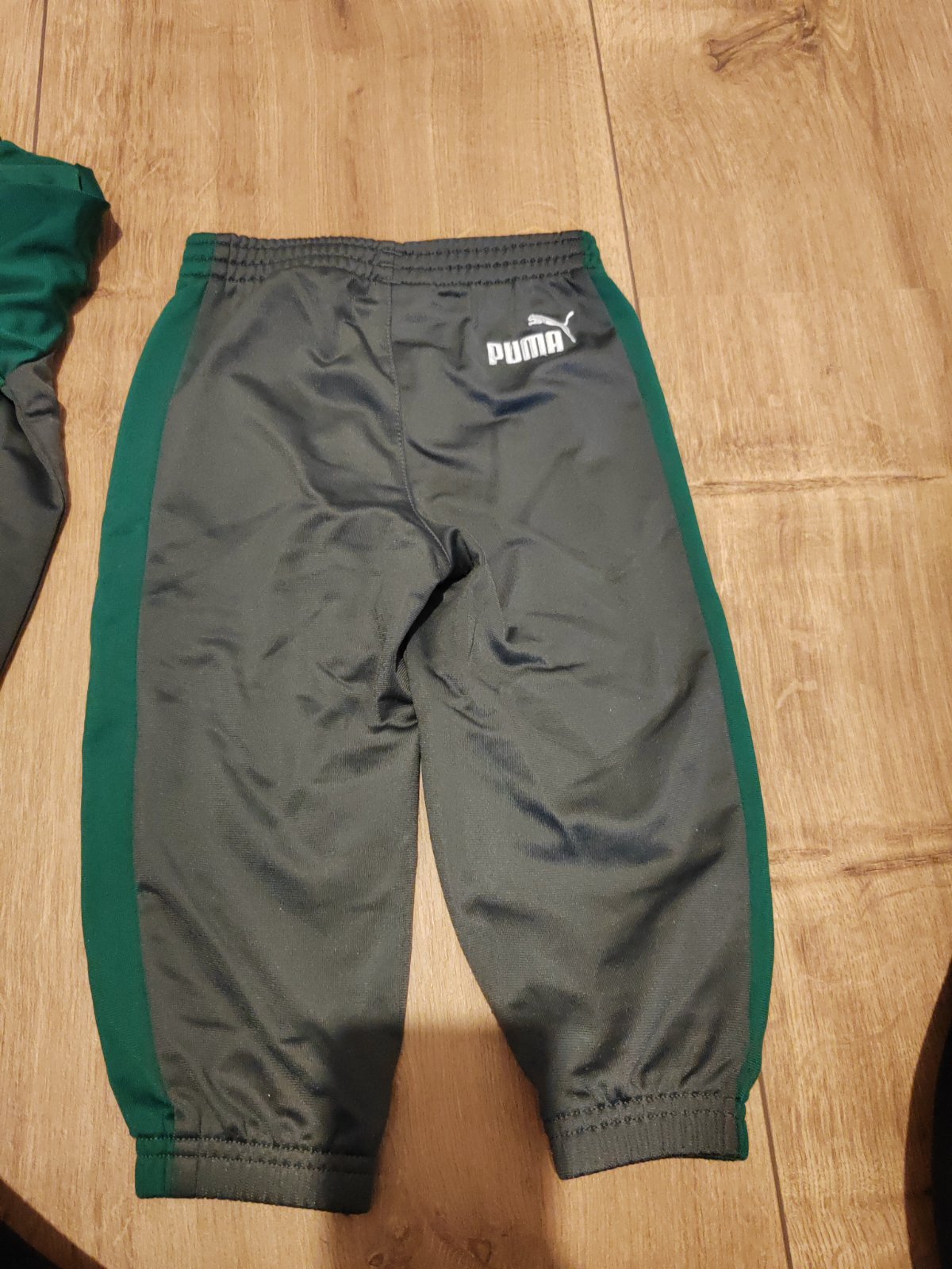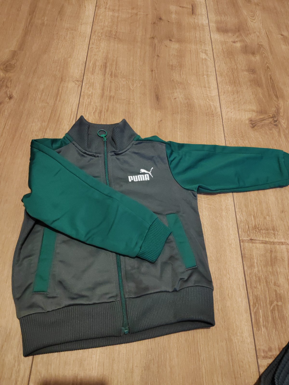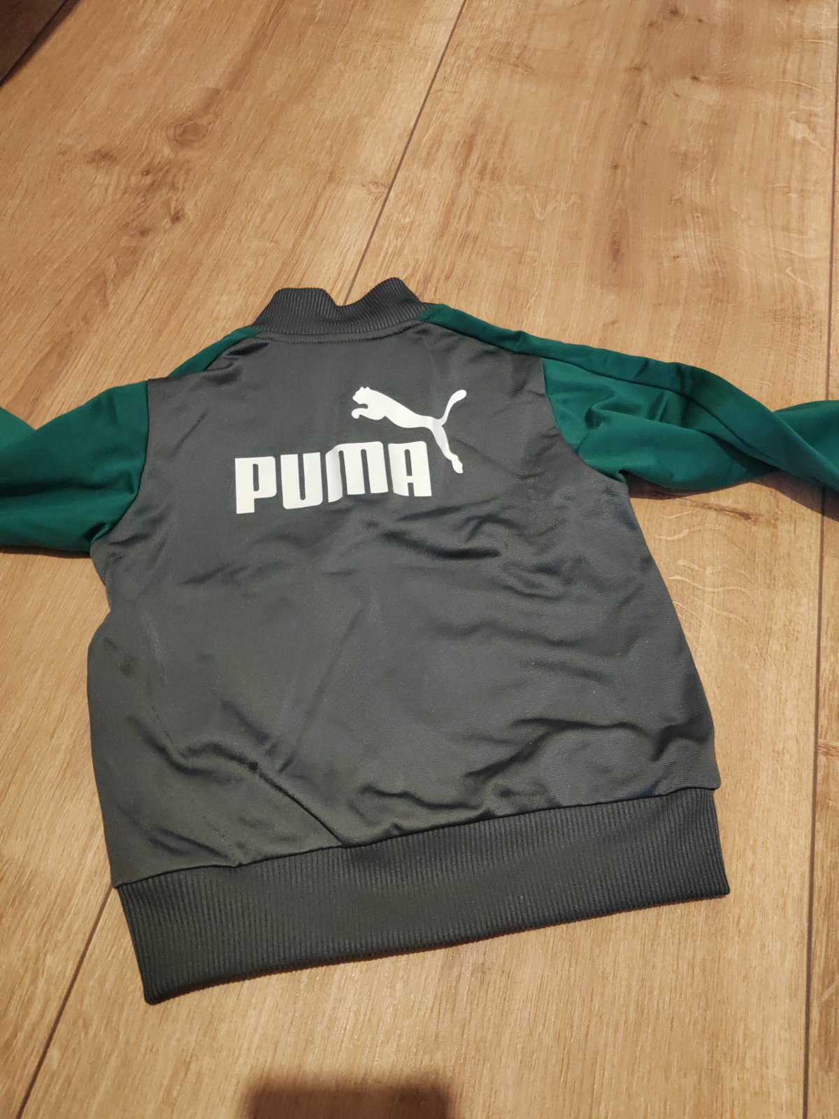 Nádherná teplakova súprava Puma v tip top stave, je to originál dovoz z USA. Farba je tmavošedá s tmavozelenou. Materiál je tenší, takže kľudne na leto alebo teplú jar/jeseň. Môj syn veľmi rýchlo rástol, takze sme ju mali maximálne 2krat oblečenú na návštevu, takze žiadny ani minizmolok, ani fľak, úplne ako nová