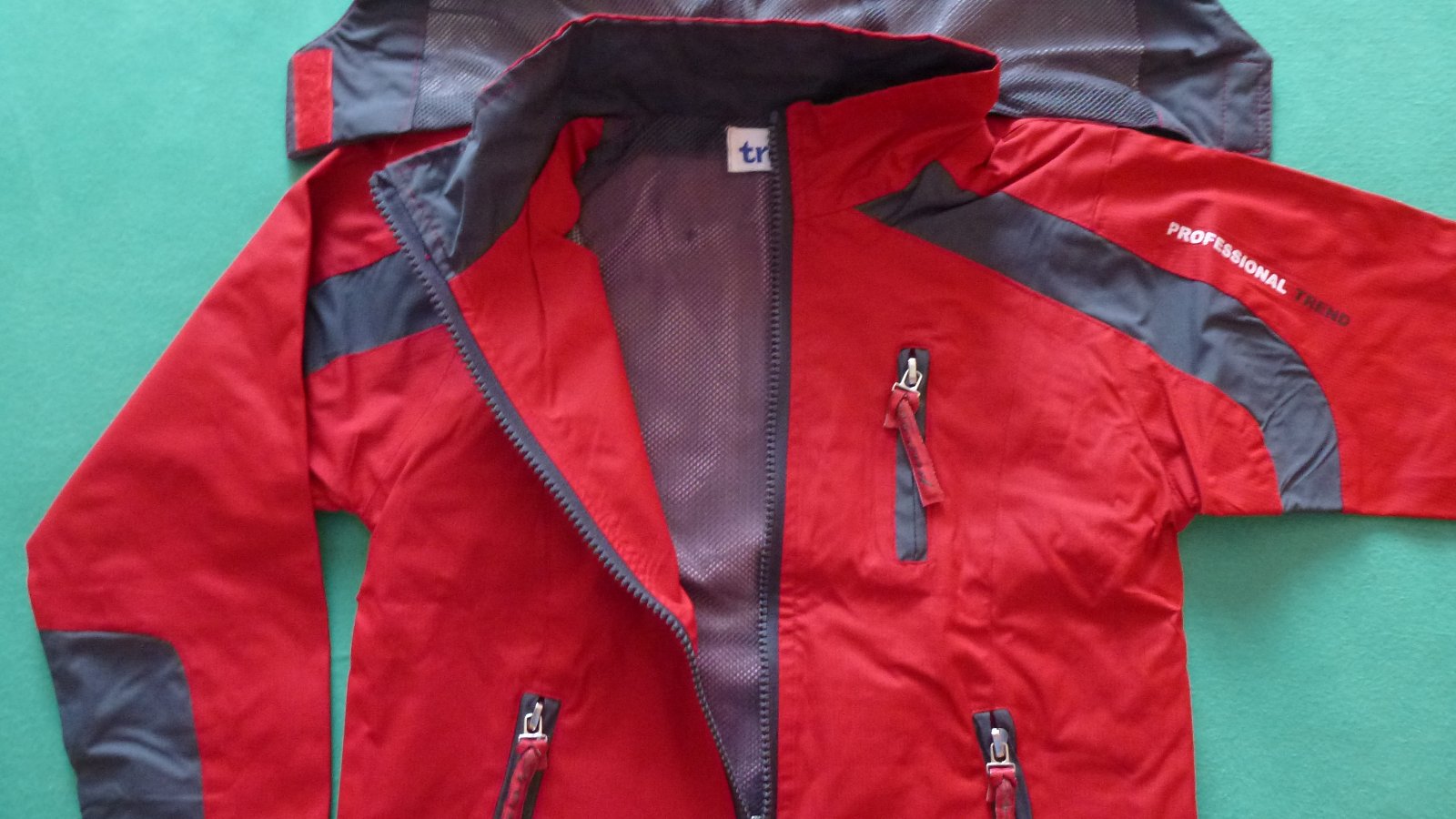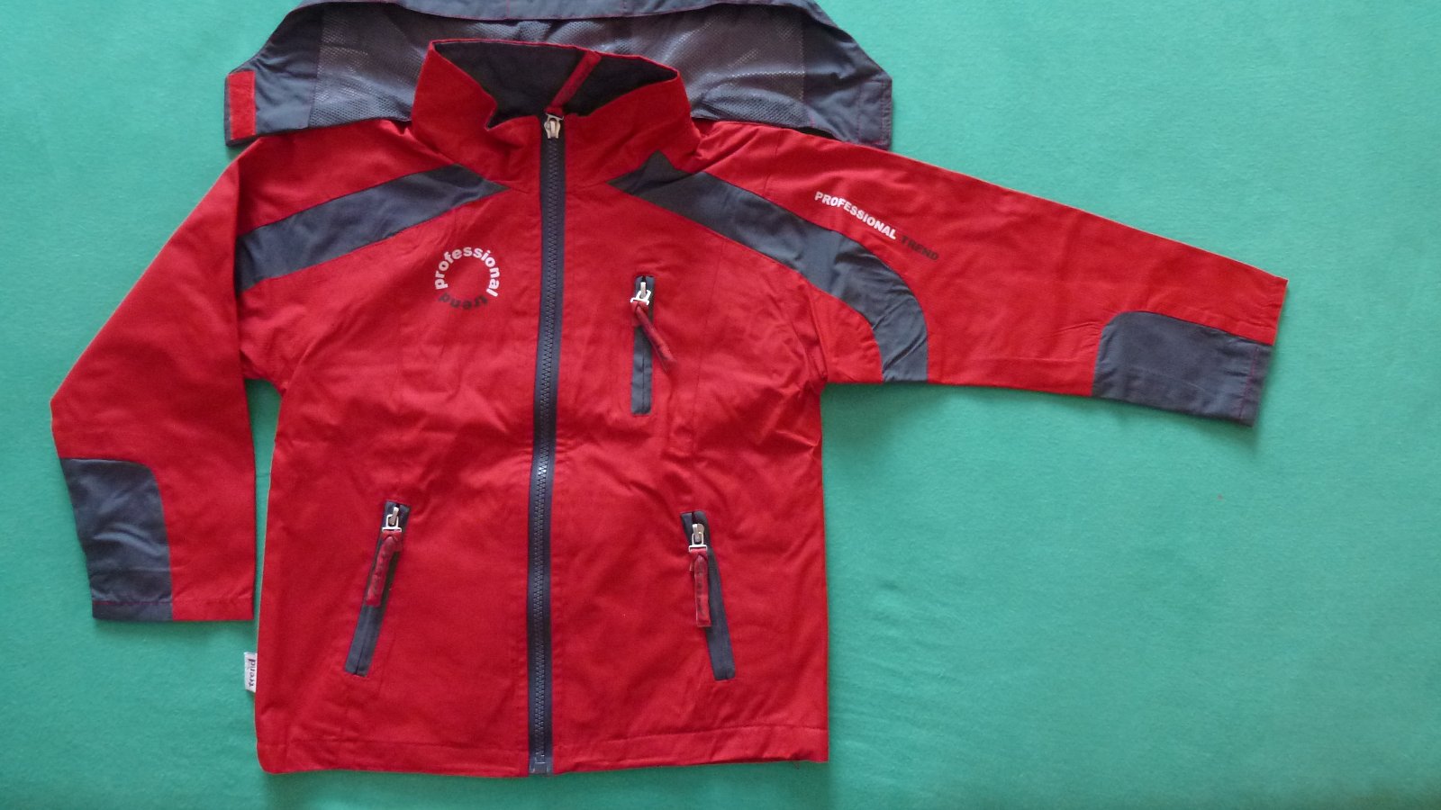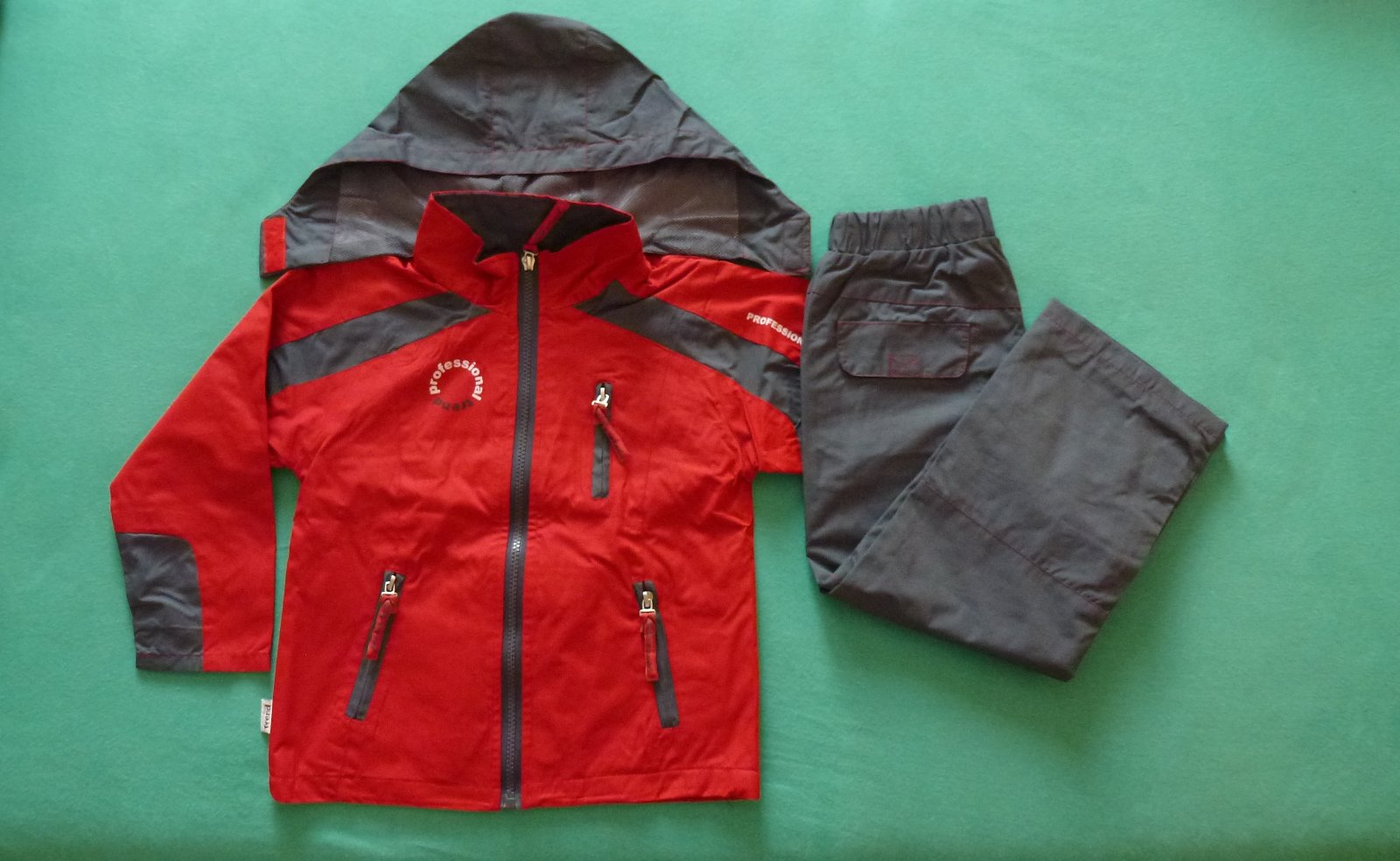 parádny komplet - bunda červená a nohavice šedé - oboje vo veľmi peknom nosenom stave, bez poškodenia