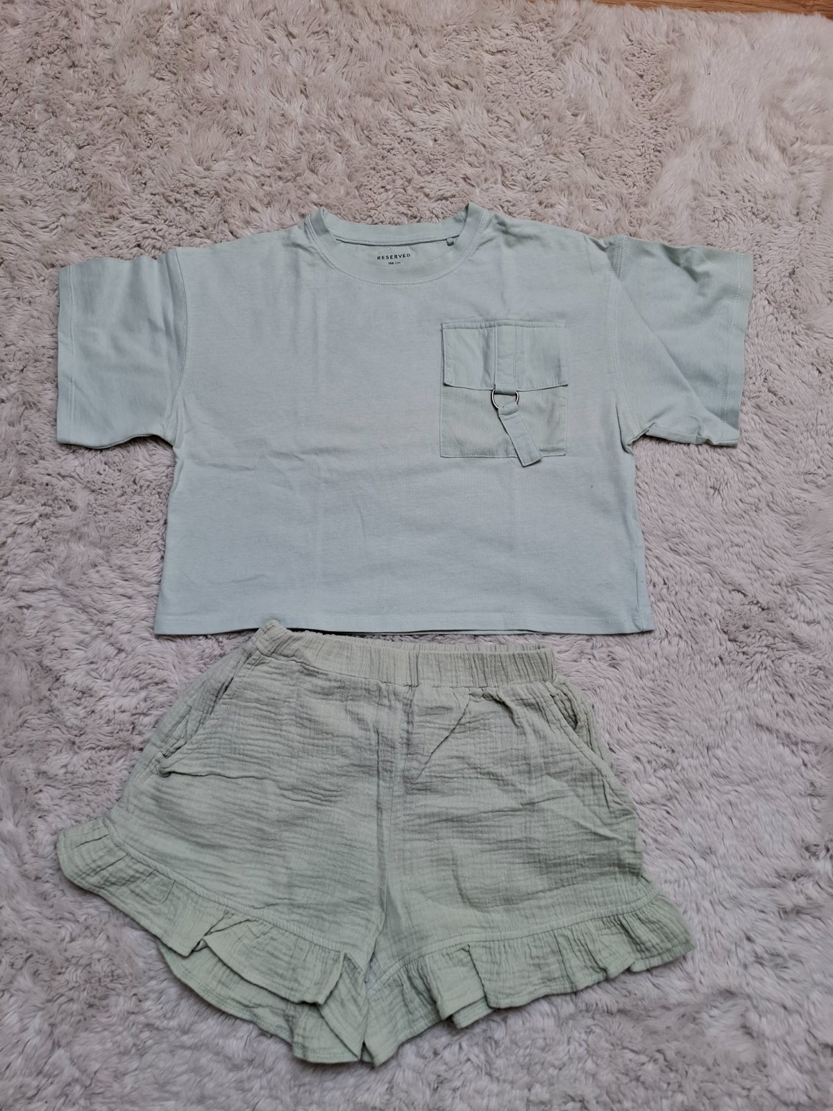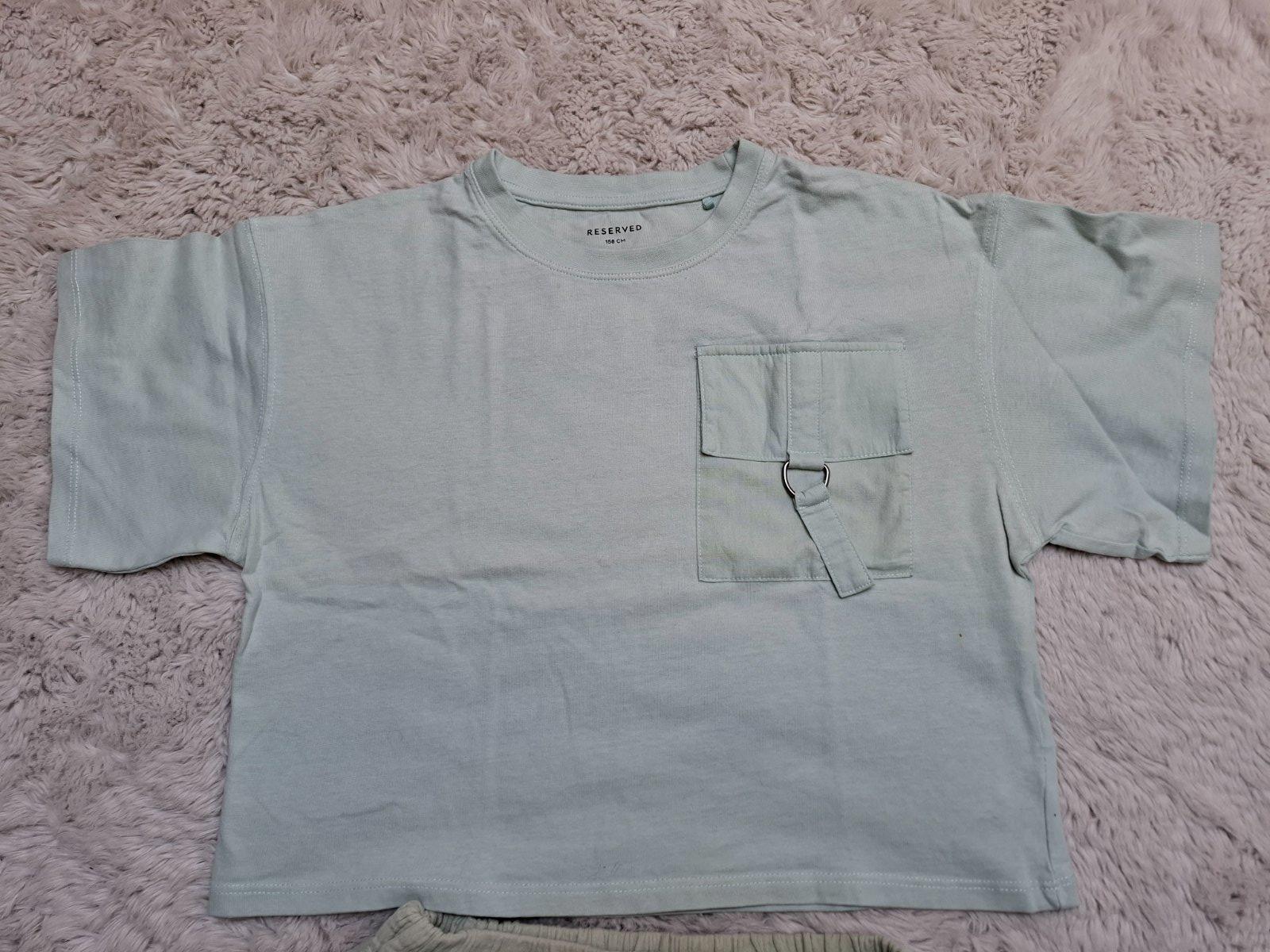 Minimálne nosené, zn. Reserved, šortky veľkosť 146, tričko veľkosť 158. Tričko je skor krátkeho strihu, takže pri veľkosti 146 bolo akurát. Da sa aj samostatne, šortky 2 Eur, tričko 2,50 Eur, cena spolu 4,50 Eur