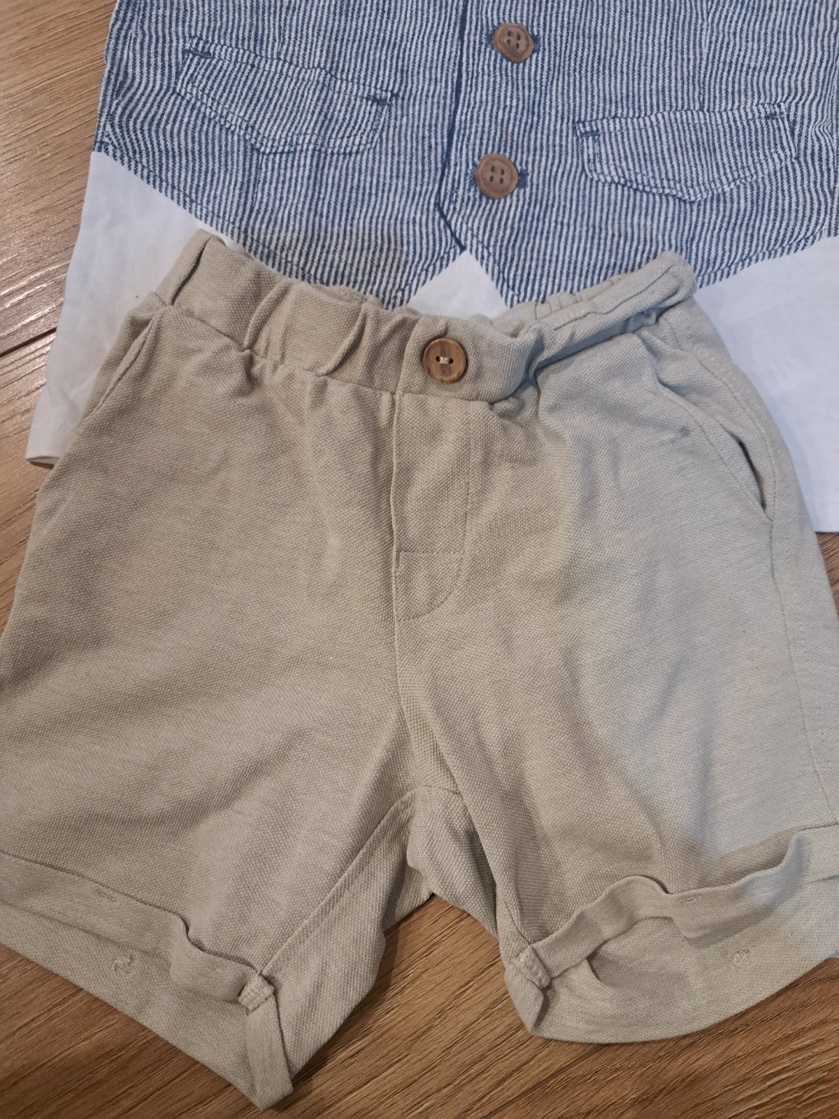 Tento kompletik som nakombinovala ja,pre môjho syna,išli sme vtedy na svadbu.Vsetko v super stave,plus šiltovka.kratasy sú č.92,ale podľa mňa sú väčšie,kupovala som to ku tej košeli.