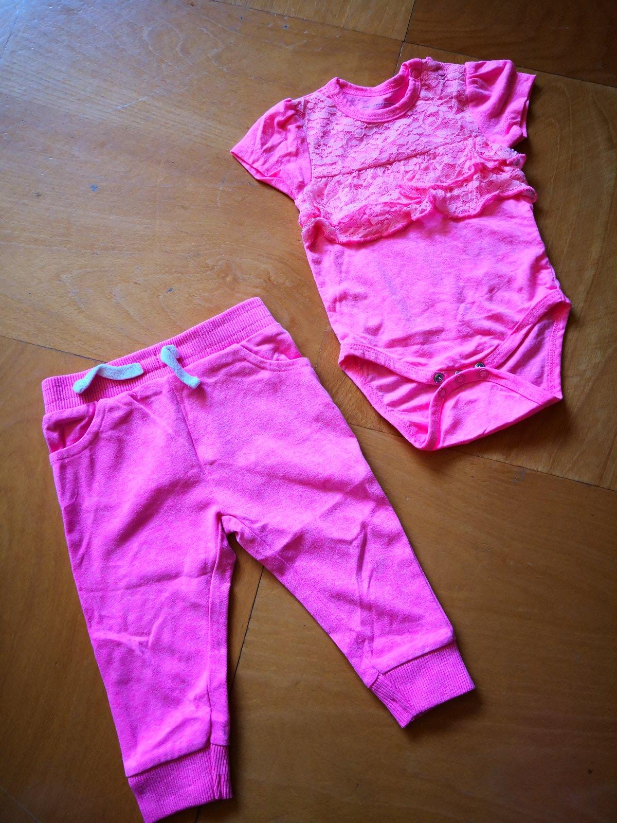 Tričko so srdiečkom (vrch bavlna, zvnútra teplučké - poloflís) vhodná na jeseň, veľkosť 68, na 4-6 mes. zn. Kik/Okay, ružové nohavice so srdiečkami, podšité bavlnou, veľkosť 68, zn. Dopodopo (Takko...