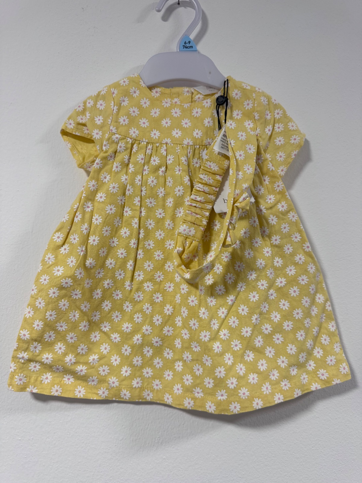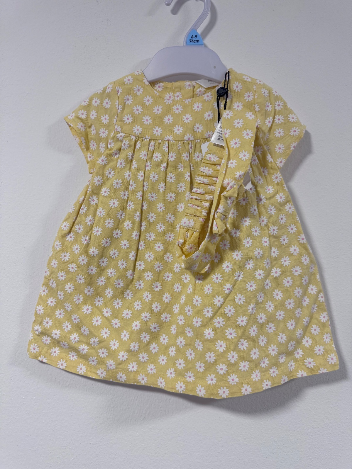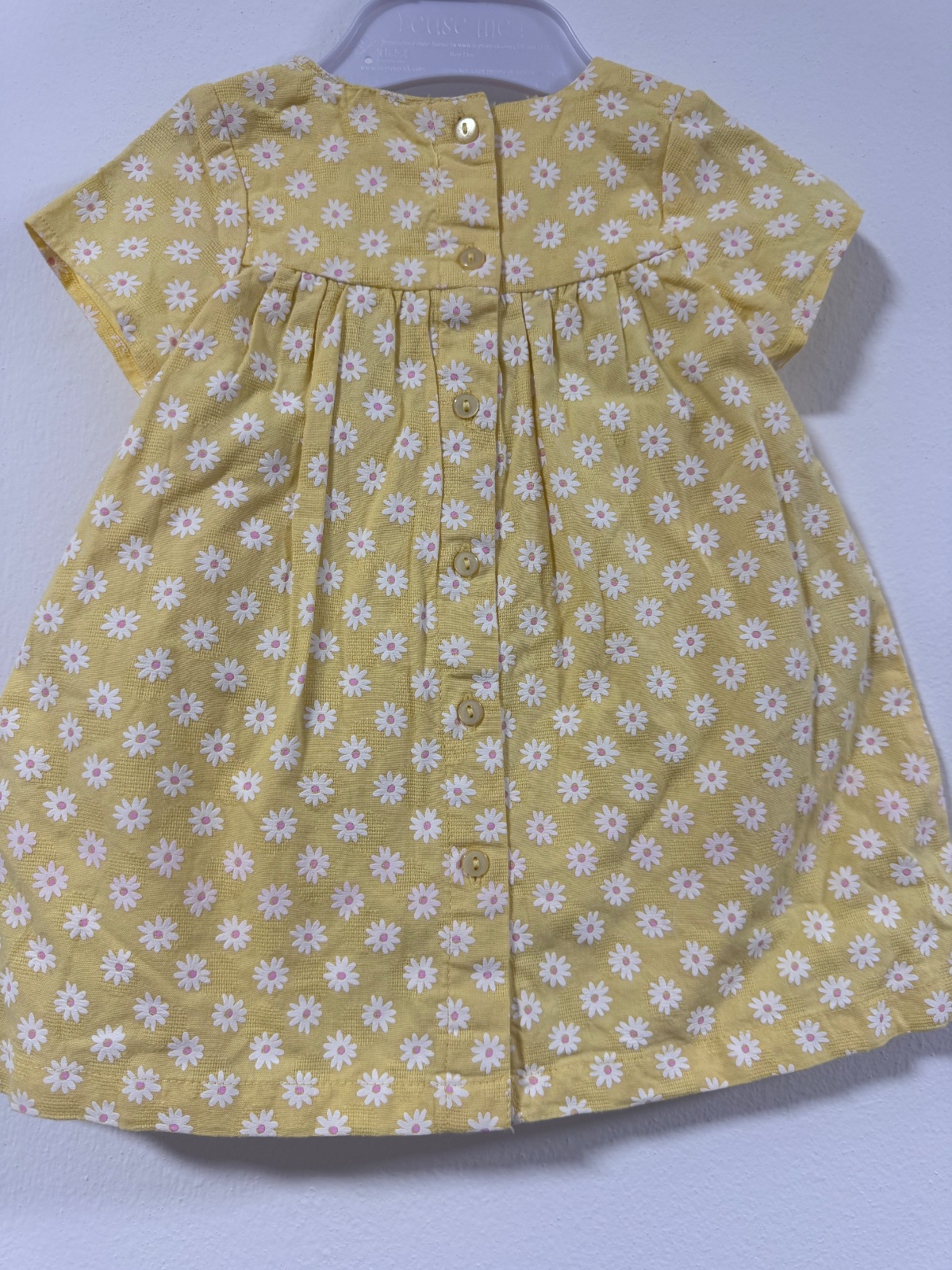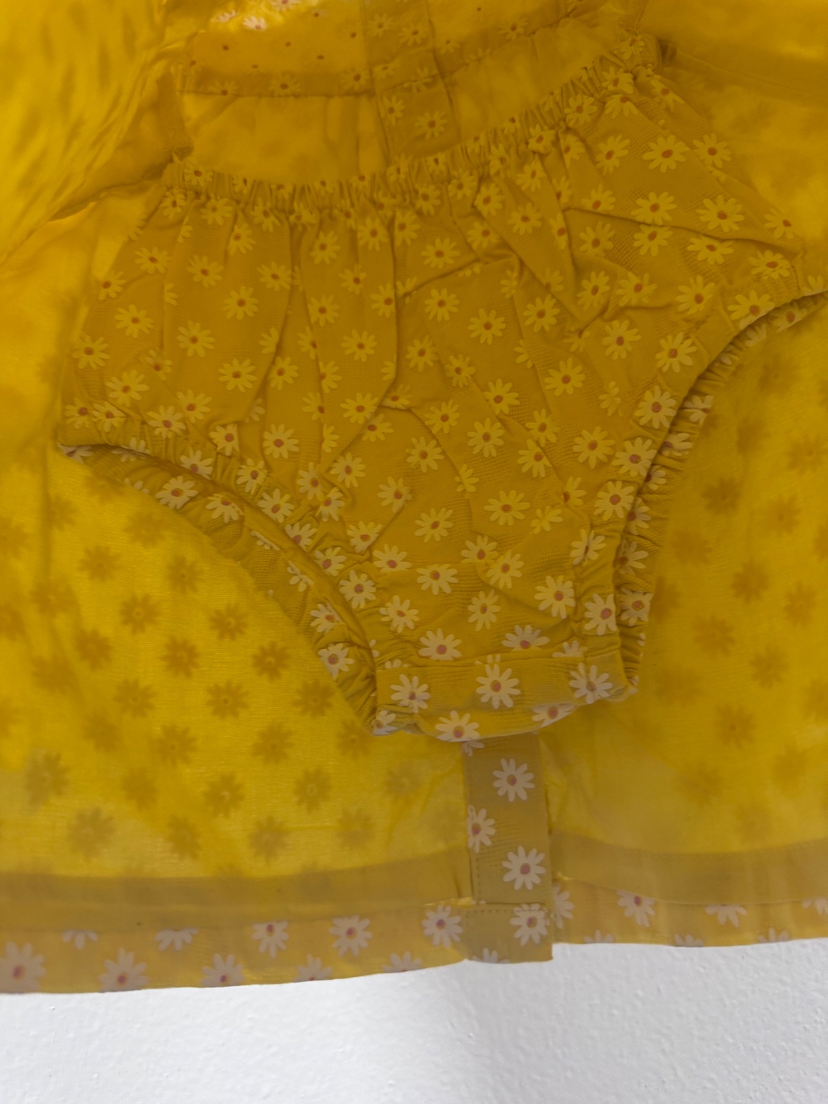 Krásny letný set pre bábätko: šaty, čelenka a nohavičky do plienky. Jemná žltá farba s drobnými kvietkami pôsobí veľmi nežne. Ideálne na leto, oslavy alebo fotenie.