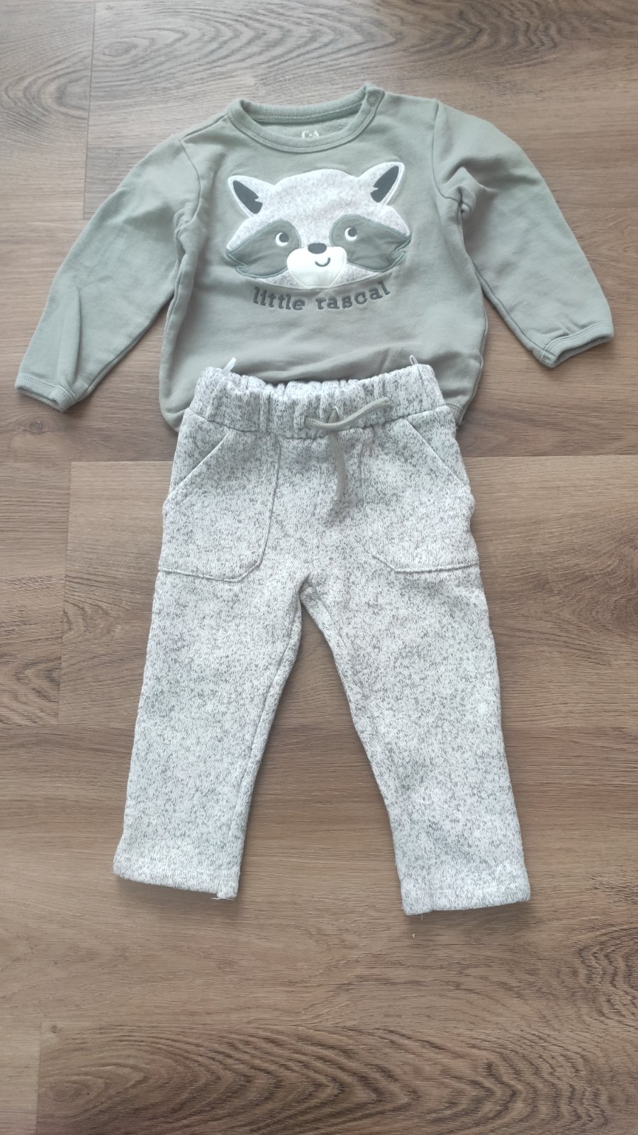 Teplakova suprava,v super stave. Mikina je tensia, nohavice hrube, mierne zateplene. Mikina je sivozelena, ma zapinanie na pukacky naboku.