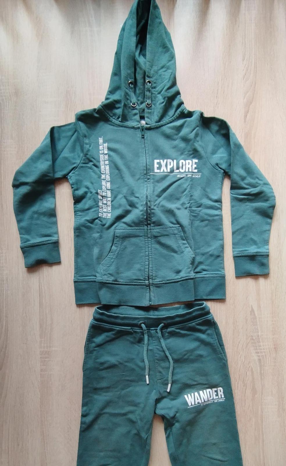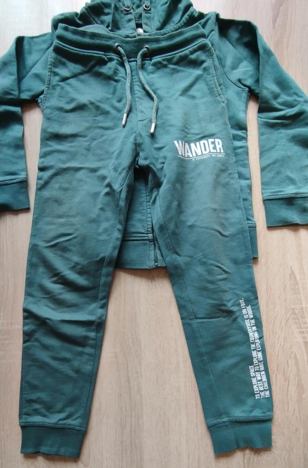 Perfektná tepláková súprava. Nosená na telocvik, nemá poškodenia. Trošinku popukané nažehľovačky. Trošku vidno pranie. Medzi nohami 2 malinké dieročky, ja som to už neriešila.