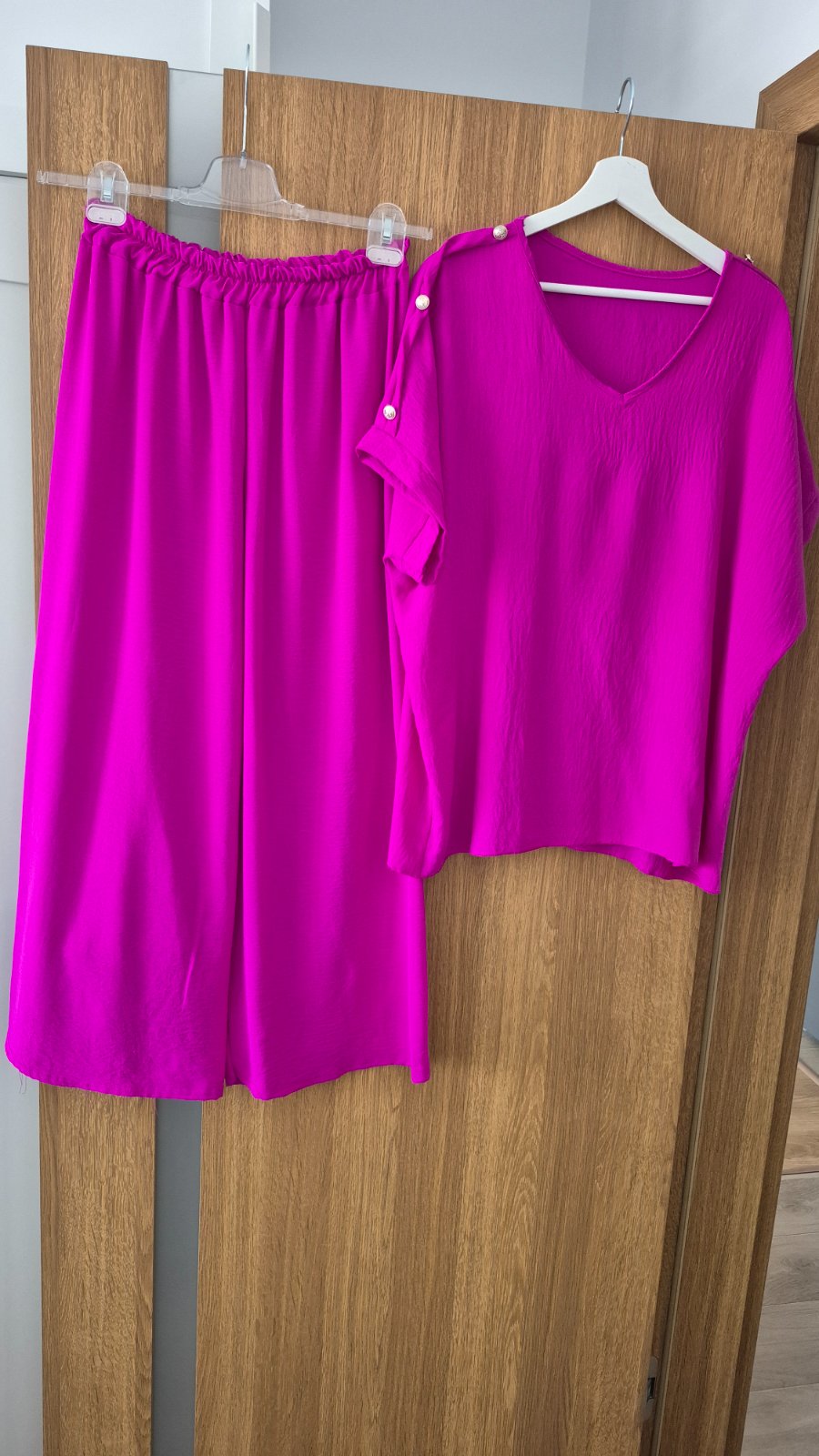 Predam pekny letny set,velmi pekne sedi na postave,je pohodlny ma super material viskoza,bluzka ma pekne gombiky na pleciach,set sa da nosit aj samostatne,pri mensich velkostiach sedi ako oversize strih,bluzka: dlzka 71cm sirka 136cm nohavice: dlzka 93cm sed 34cm pas v klude 70cm natiahnute 100cm,povodna cena 52 nova 14,5 vratane postovneho a balneho,platba vopred na ucet......talianska vyroba