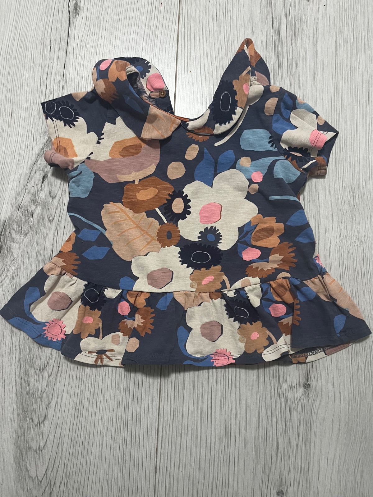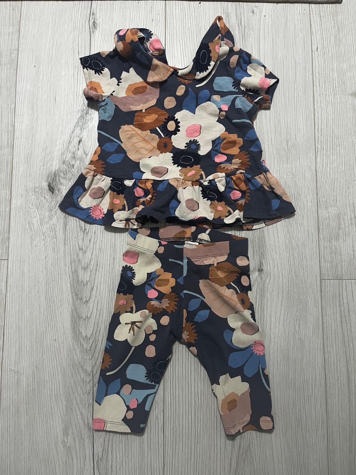 Predám vzorovany set kratkorukavoveho topu s golierom a volanom v spodnej časti a krátkych legín. Značka: Next, veľkosť: 98