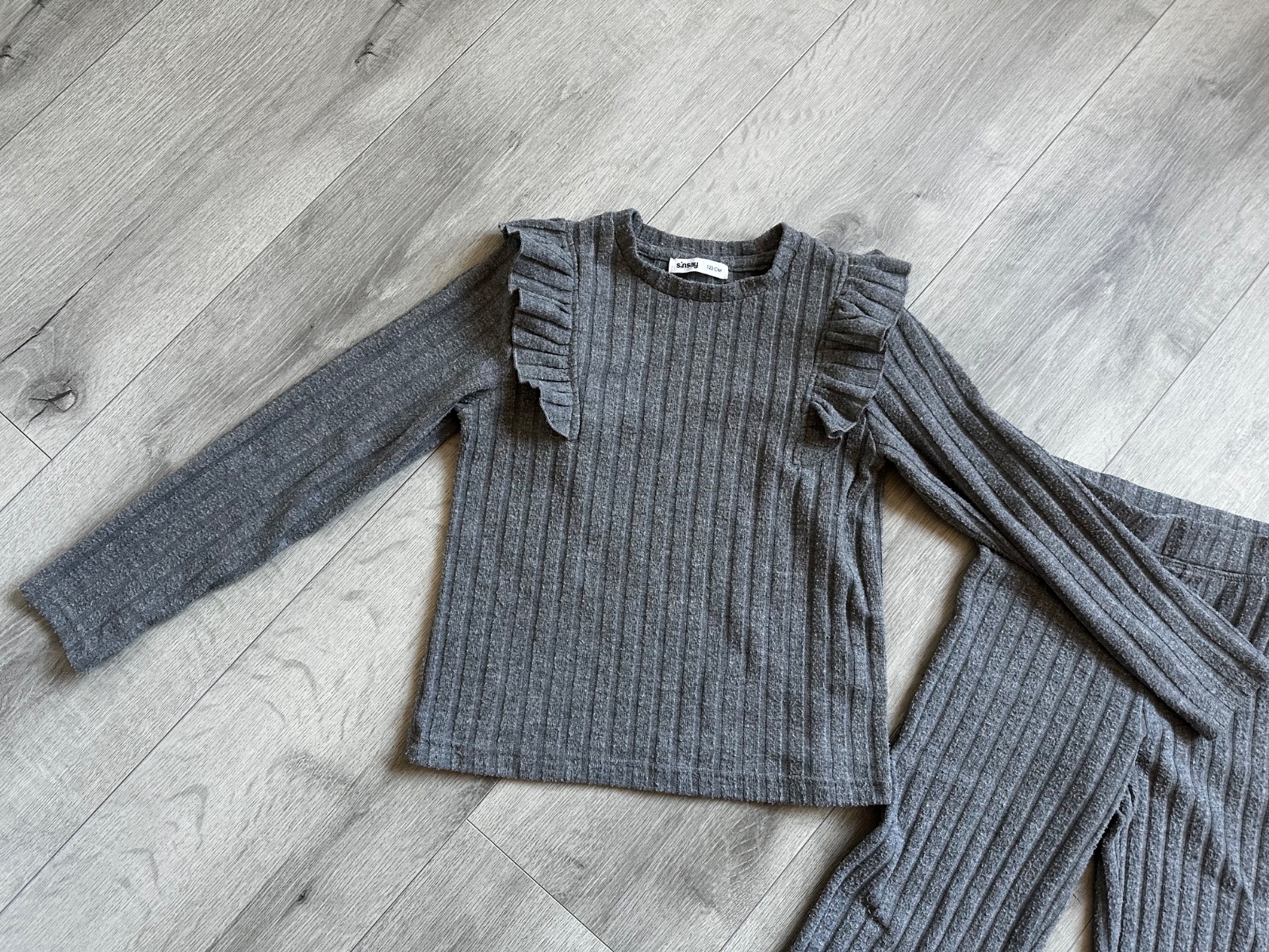 Štýlový komplet, svetríky s volanikmi, nohavice rozšírené, menšie zmolky z prania a nosenia, bez poškodenia