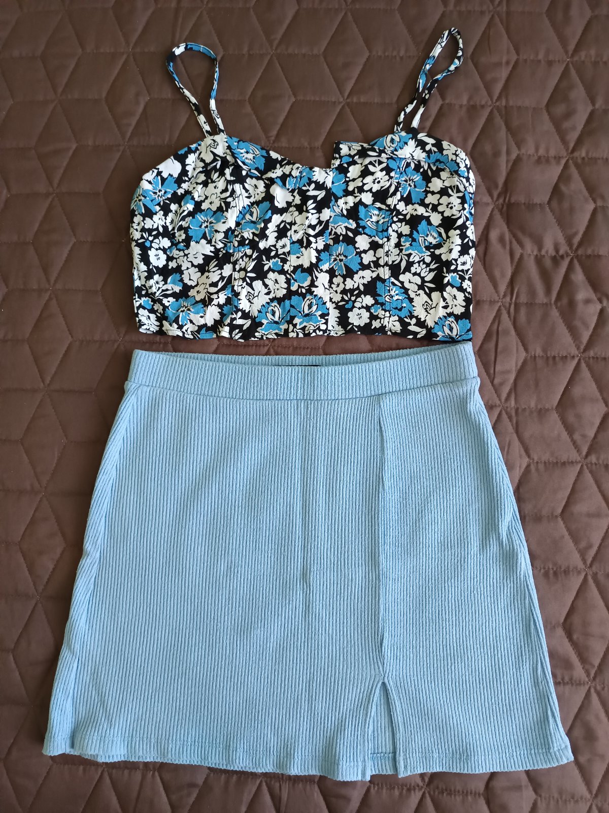 Predám krásny kvetinový crop top, veľkosť S a sukňu s výrezom, veľkosť M. Predávam spolu. Cena spolu 6 eur + pošta.