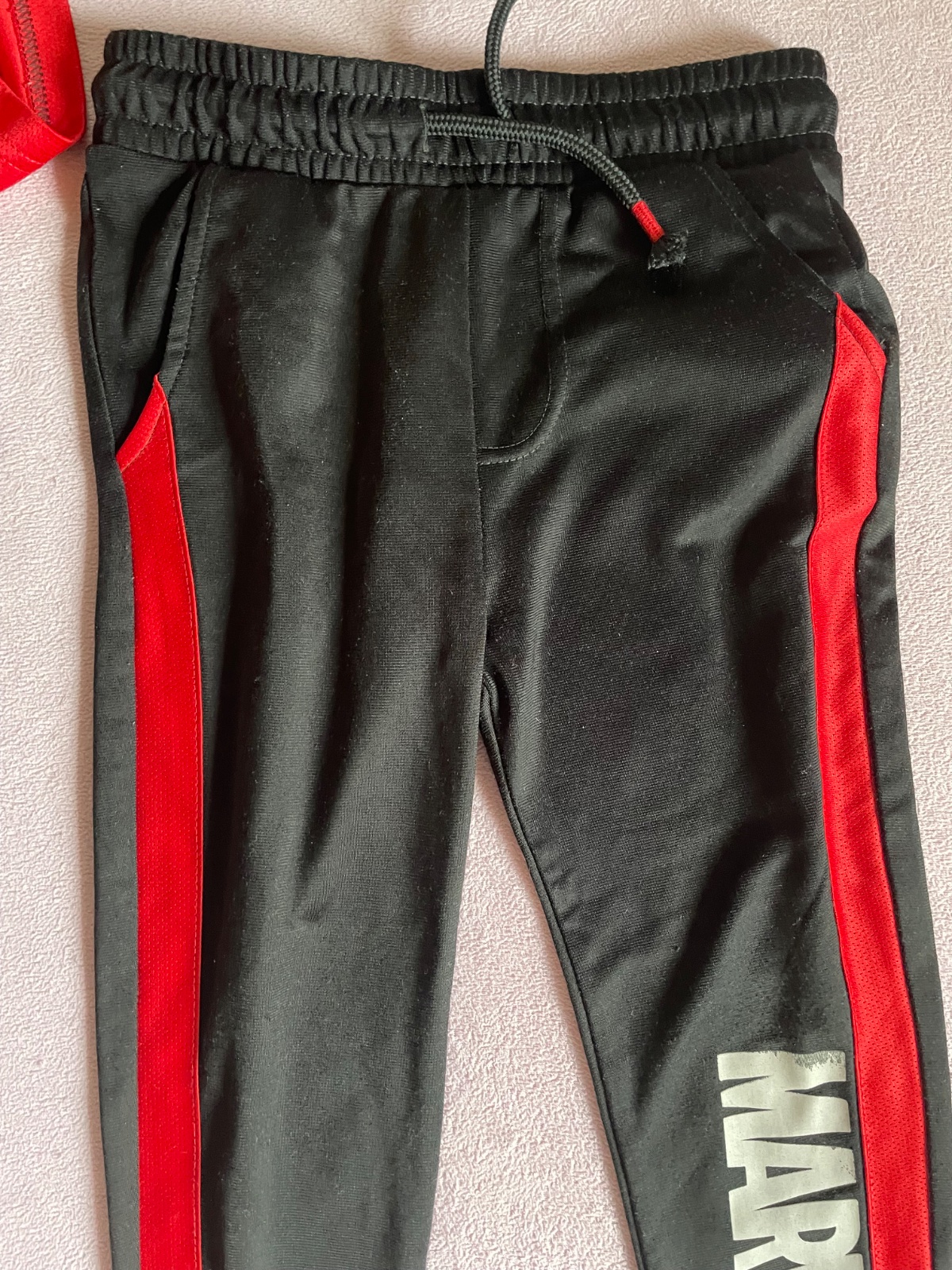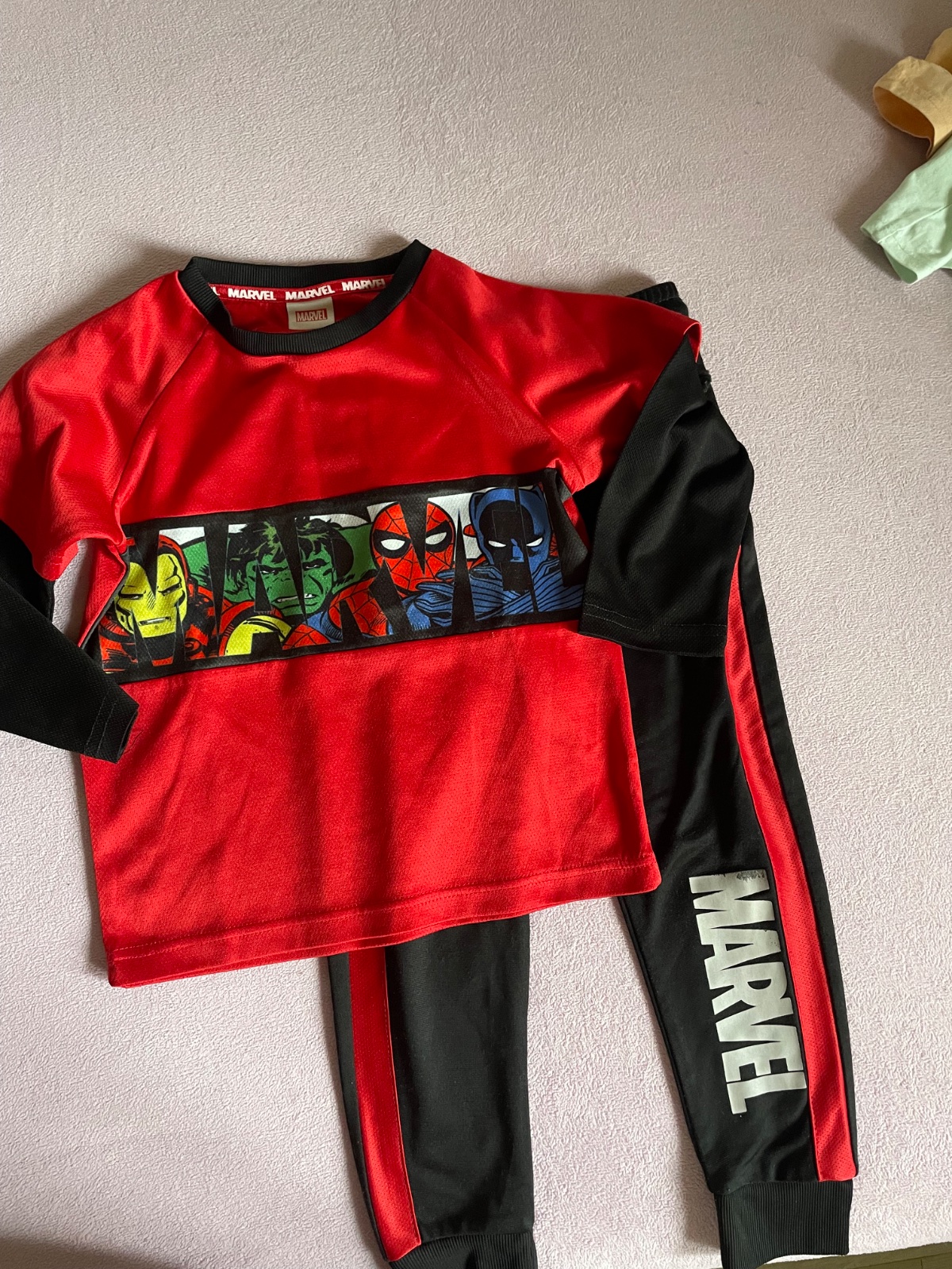 Predám krásny komplet pre milovníkov Marvel. Je teplejšie z vnútra. Zvonka je taký šmykľavý materiál, aké sú futbalové dresy. Jediná vada je na teplákoch, nápis Marvel začal sa trošku ošúchať ale nič strašné, viď fotky. Cena 7€ + doprava (radšej Packeta)