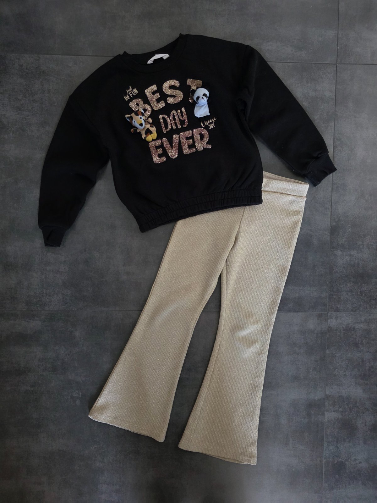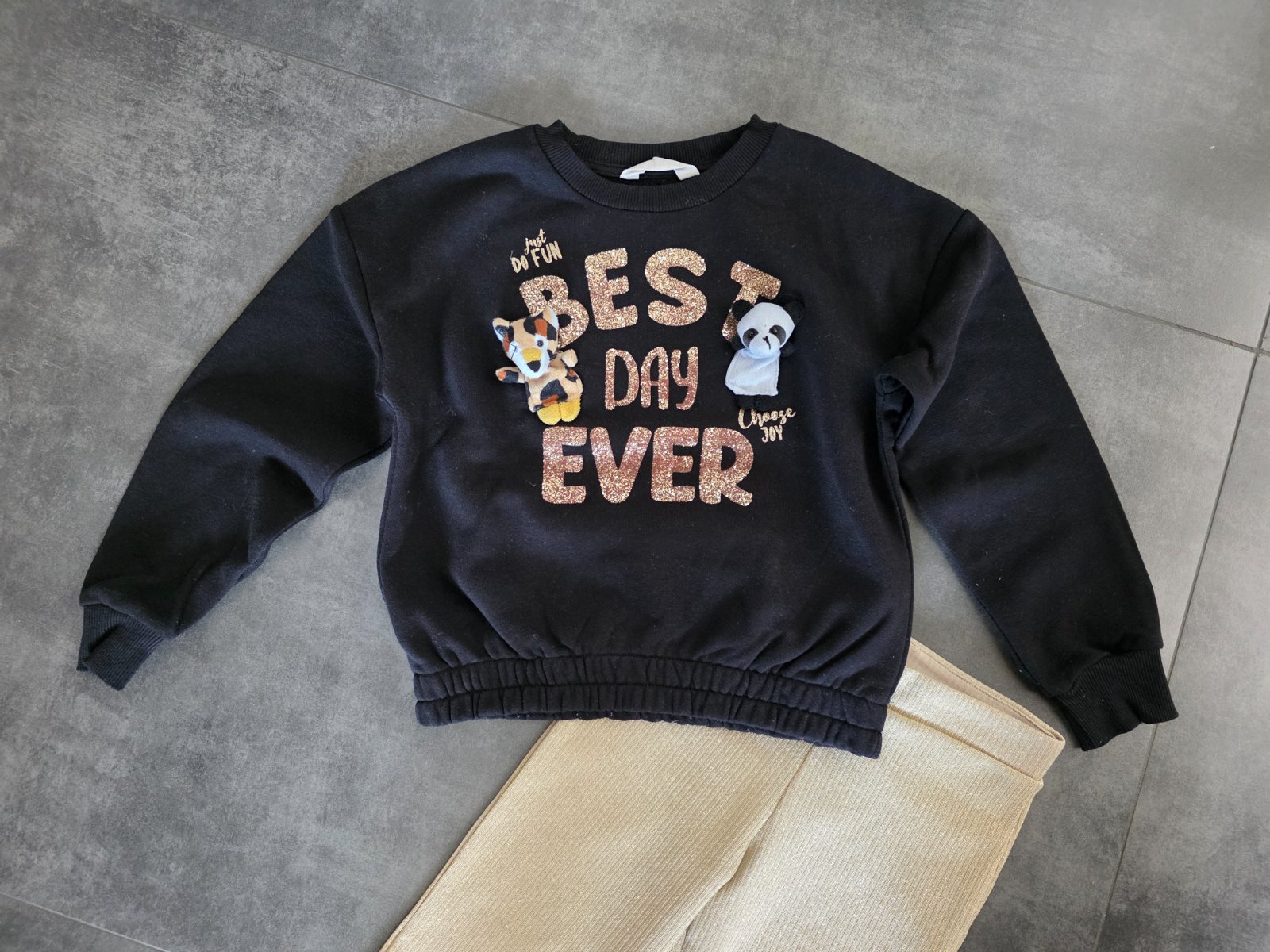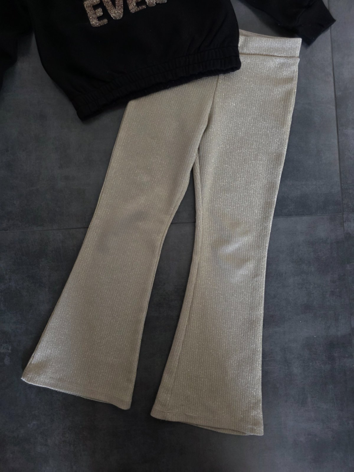 Nohavice zlaté trblietavé. Pôvodná cena mikiny 25€ a nohavice 22€.