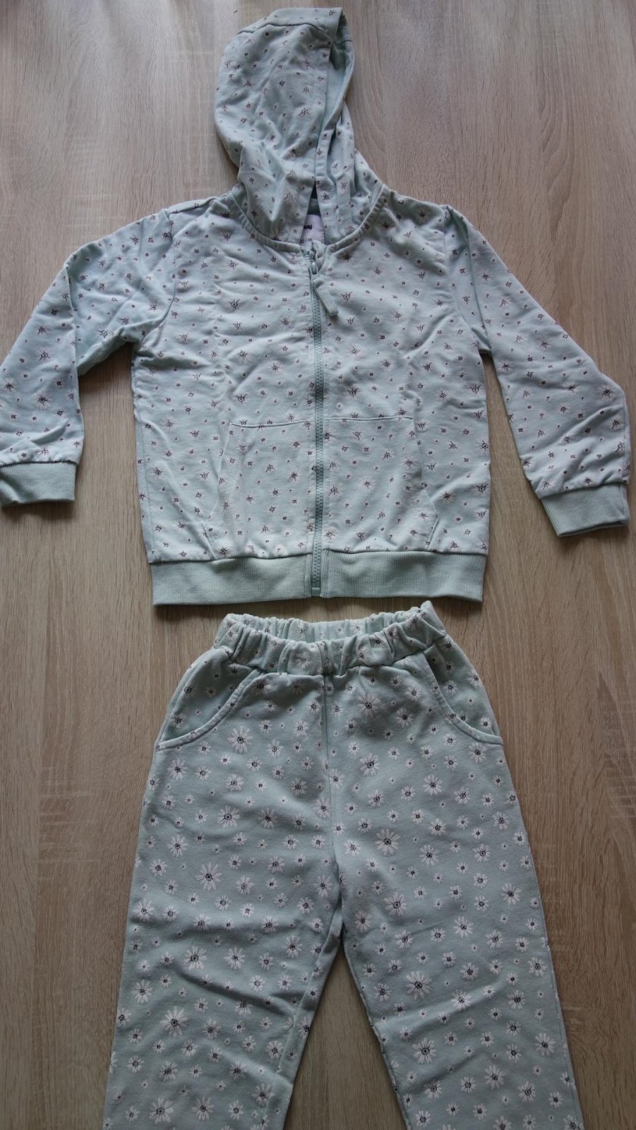 Krásna kvetinková tepláková súprava. Nosená len na telesnú výchovu dcérkou. Na foto neukáže pekne, ale v skutočnosti jemná, pekná mätová farba s bielymi kvetinkami. Nemá žiadne poškodenia.