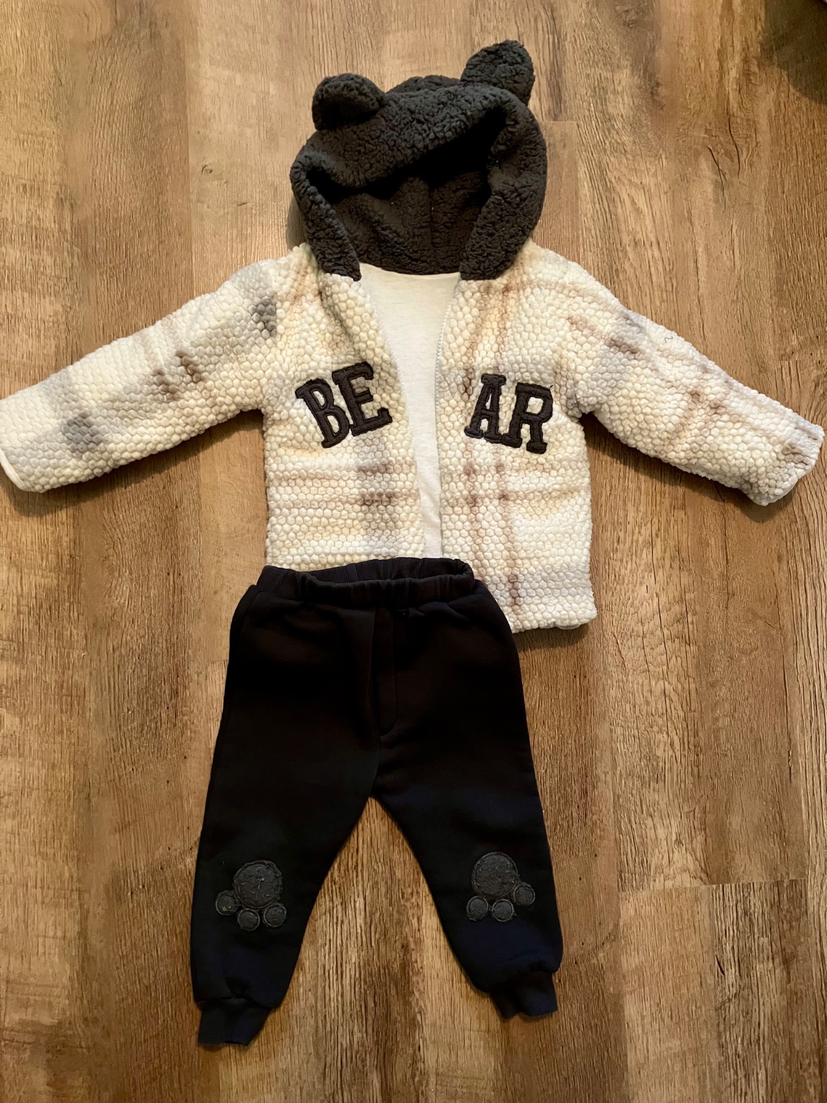 Suprava značky Hippil. Bavlna. Oblečená 2x. Top stav (labky na kolenách majú vyšúchaný efekt, nie opotrebovaním). Veľkosť písaná na 12-18 mesiacov. Dĺžka nohavív viď foto.