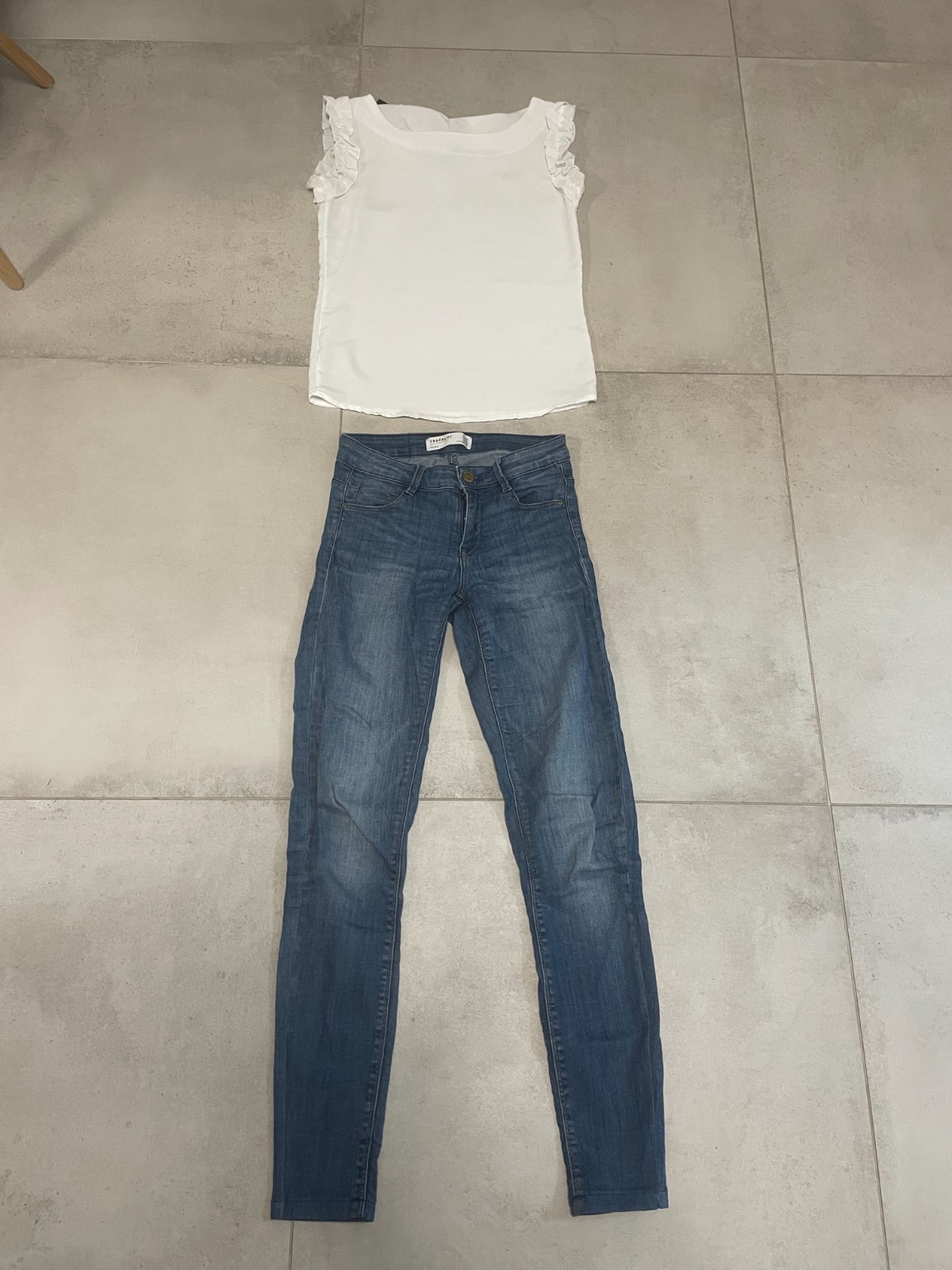 predám ľahké letné rifle zn. ZARA vel. XS a krasnu lahku bielu bluzku s viazanim zo zadu na krku obe vel. XS, nepoškodené