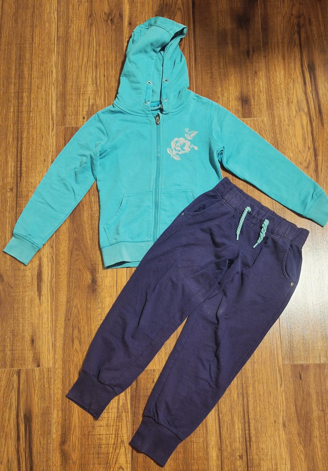 Teplakova suprava vel.122/128.Mikina s kapucnou, na zips CD 46 cm.Teplaky CD 72 cm s patentom.Teplaky su viac nosene -vyprata farba.