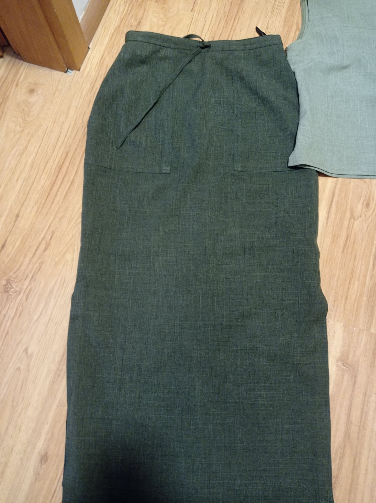 Sita suprava sukna a top. Lahky material. Dlzka sukne:91, pas na stahovanie 35cm, boky 46,5 cm. Sukna podsita. Velke vrecka vpredu, vzadu vsity zips. Top: dlzka:50, sirka:42,5 cm.