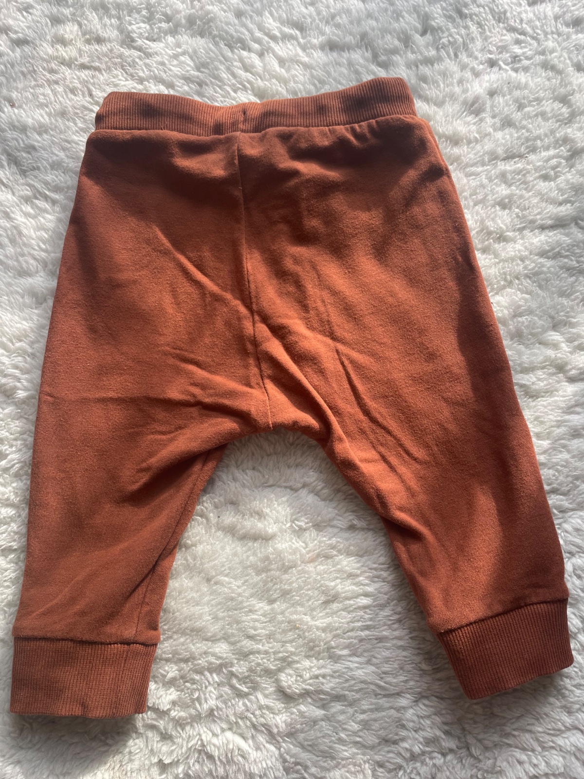 Hnede teplaky Lindex s gumou a snurkou v pase a bielo modre pasikave tricko s dlhym rukavom H&M, cvocky pri krku pre lepsie zapinanie, predne vrecko. Neposkodene, bez dier a flakov, velkost 68