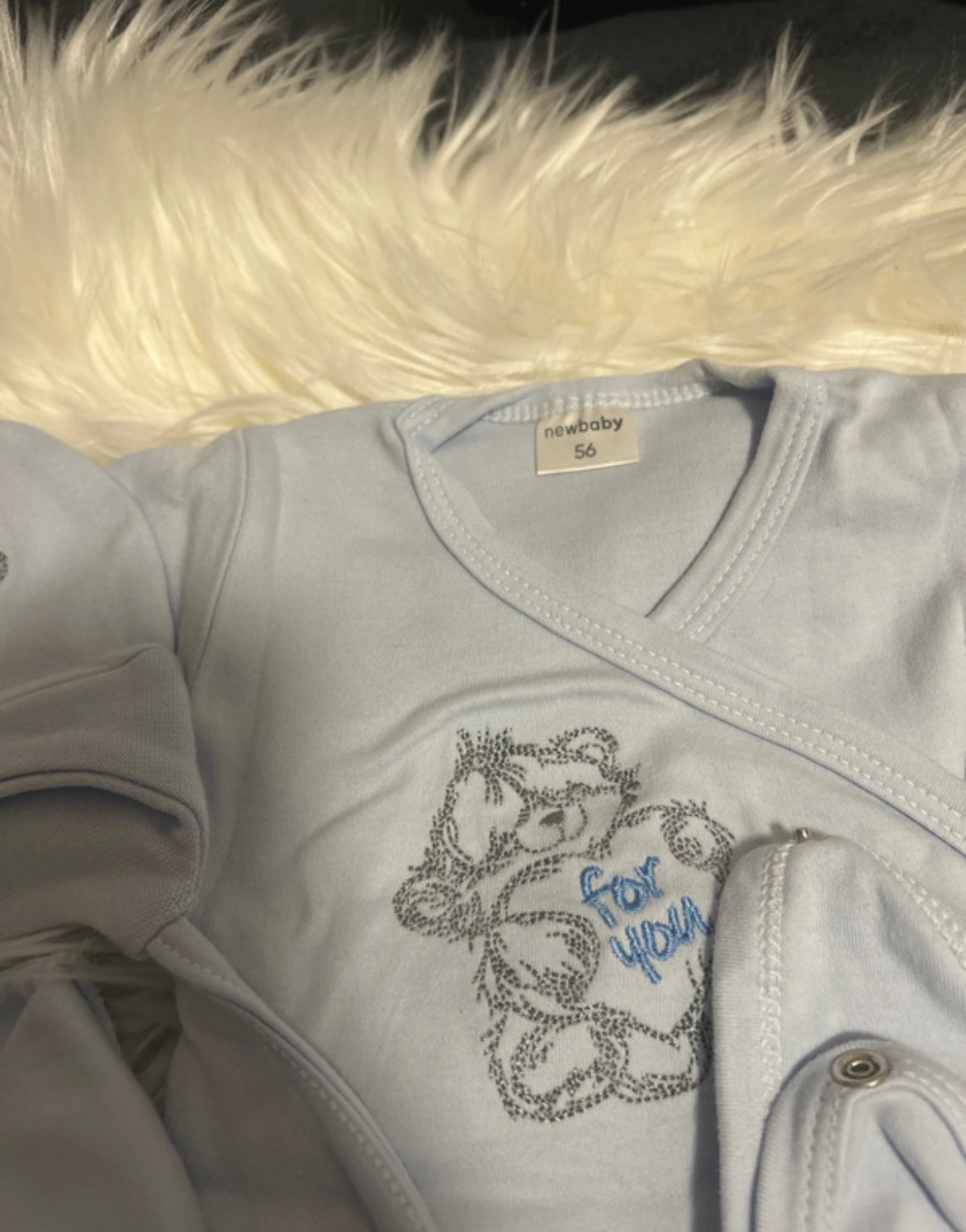 Pre novorodeniatko alebo aj nedonosené bábätko. Veľkosť oblečenia je skôr 50 (uvádzaná 56). Náš chlapček mal 53 cm a sadlo mu pekne. Oblečené raz a to na cestu z nemocnice. Obsah: svetlomodrá čiap...