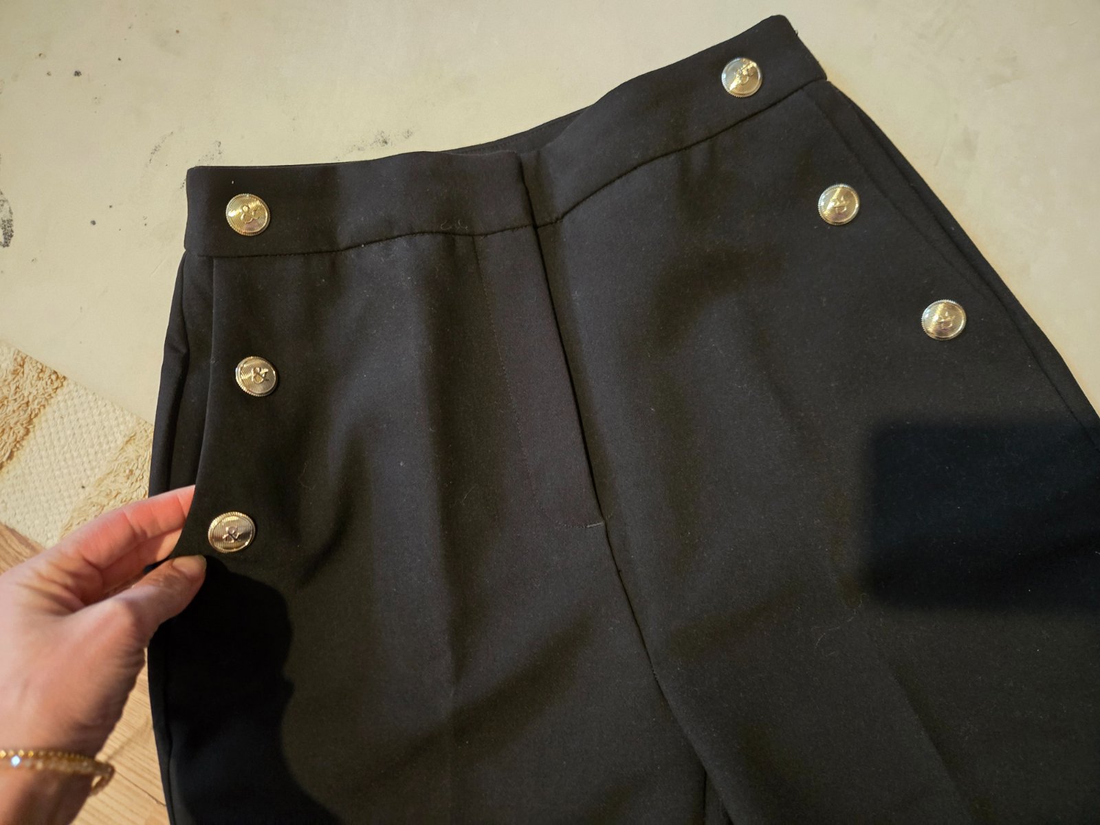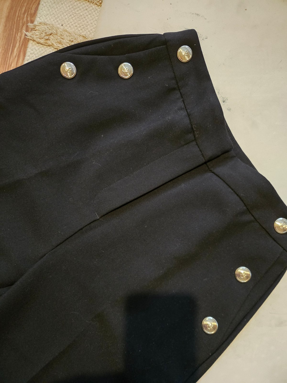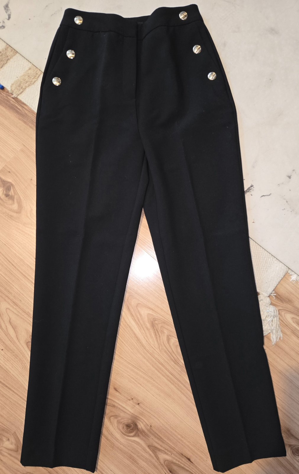 Ponúkam na predaj v top stave čierne nohavice sedia na 36 (vel.S) na boku maju vrecká, a ozdobné zlaté gombíky. Cena je 8eur + poštovné prevodom 3,50e doporučene, na predaj aj svetrik H&M Xs/S za 4e + poštovné