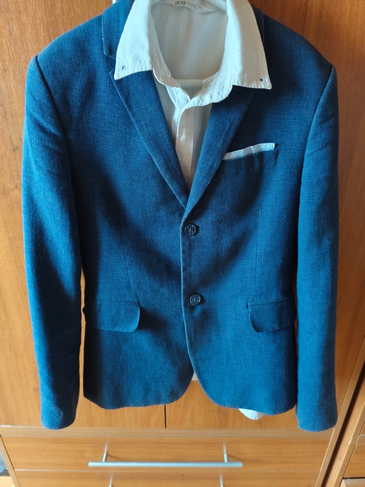 Ponúkam na predaj vrchný komplet. Sako H&M - 146/152, biela košeľa H&M 164/152, druhá košeľa bledo modrá/belasá 152 - Synsay.