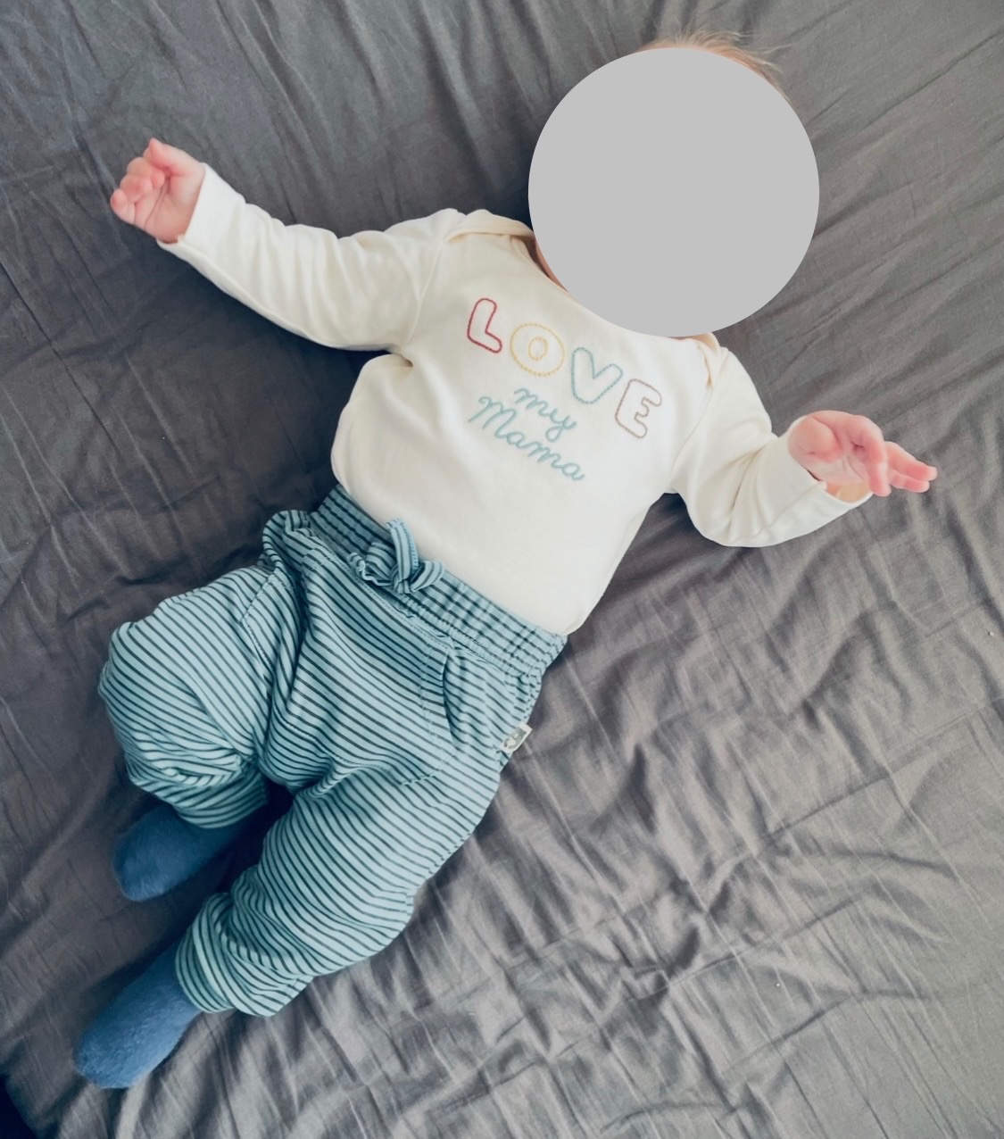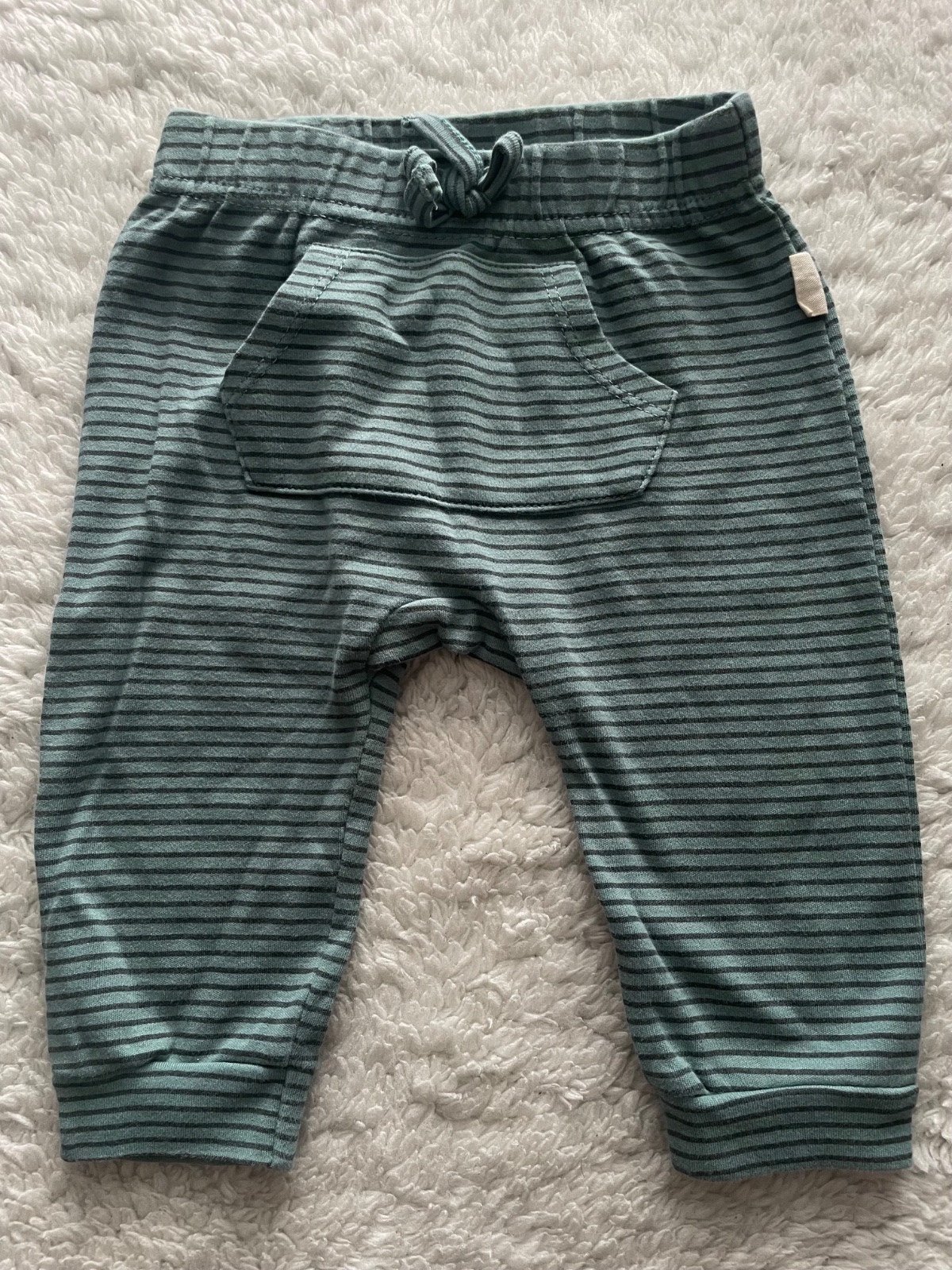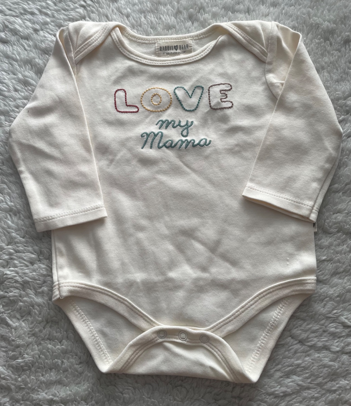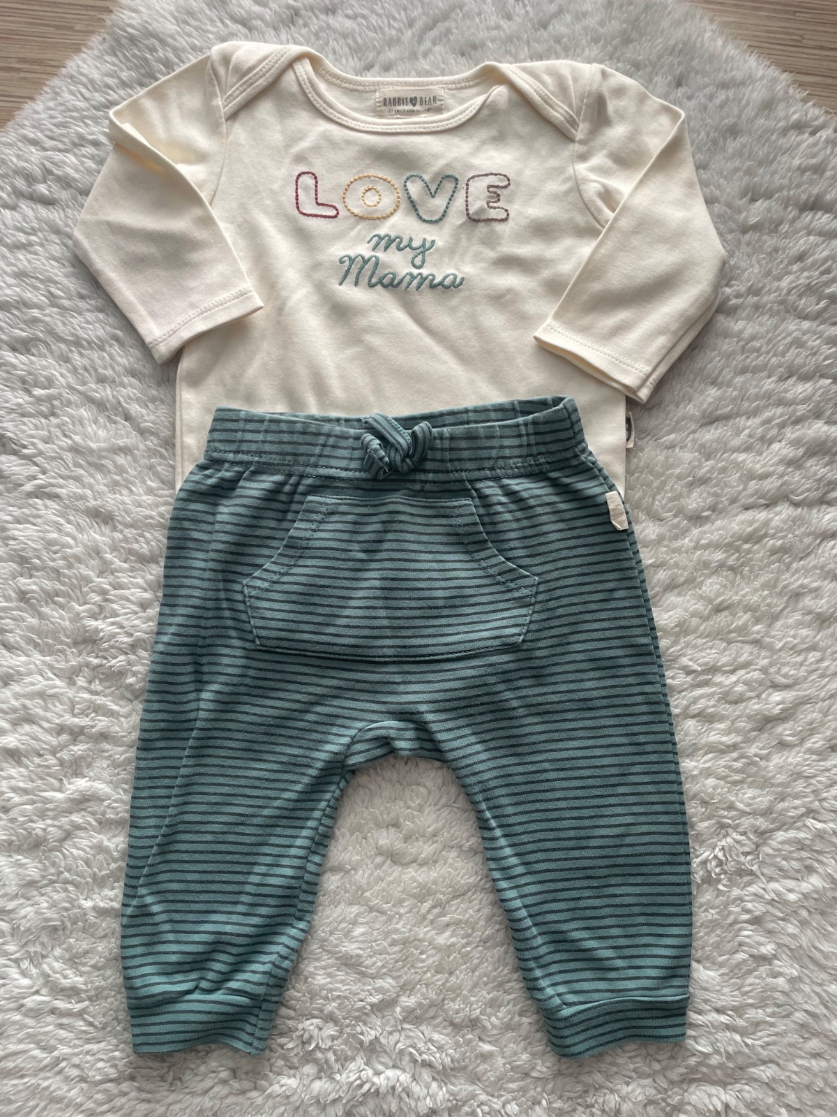 Bavlnena suprava kremoveho body s vysivanim love my mama a pasikavych zelenkavych teplakov na gumu v pase s klokanim vreckom napredu, velmi prijemny material, neposkodene, velkost 74, zn. Rabit Bear