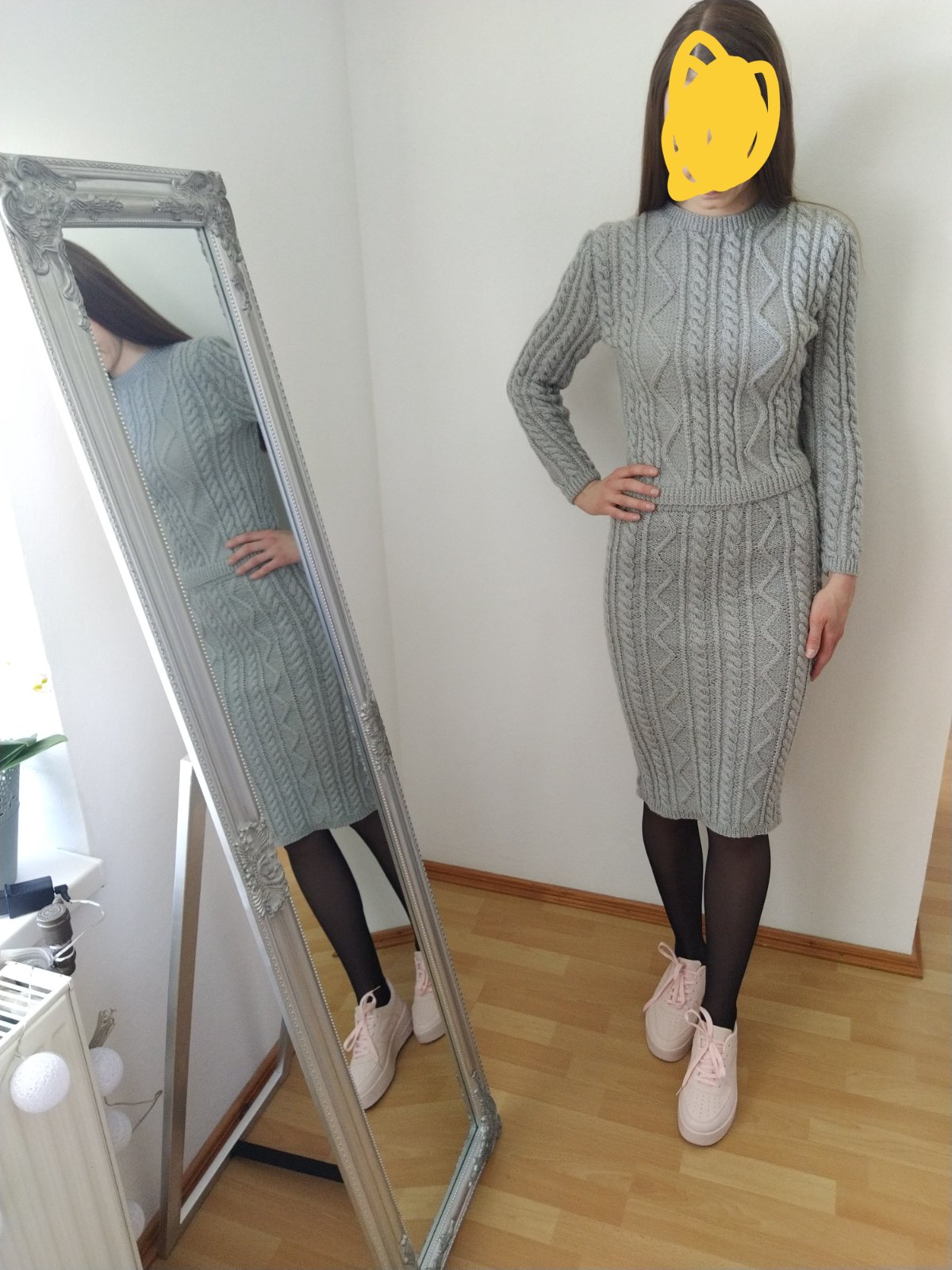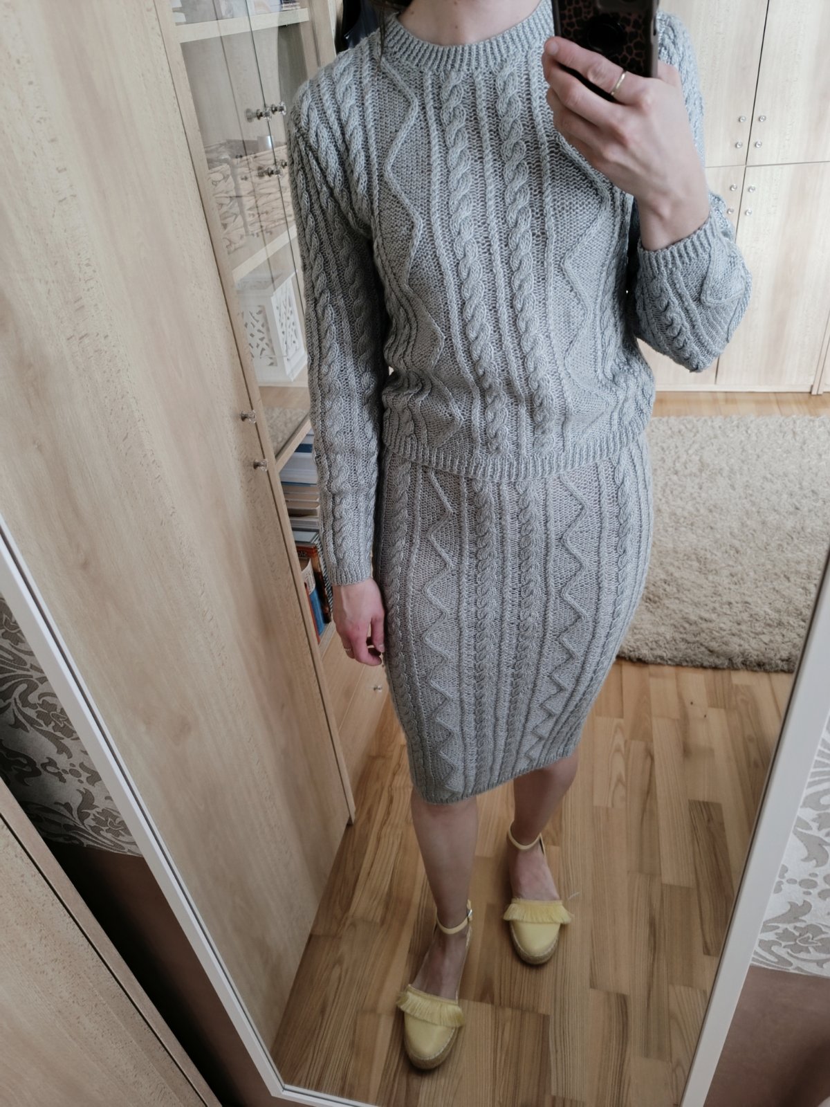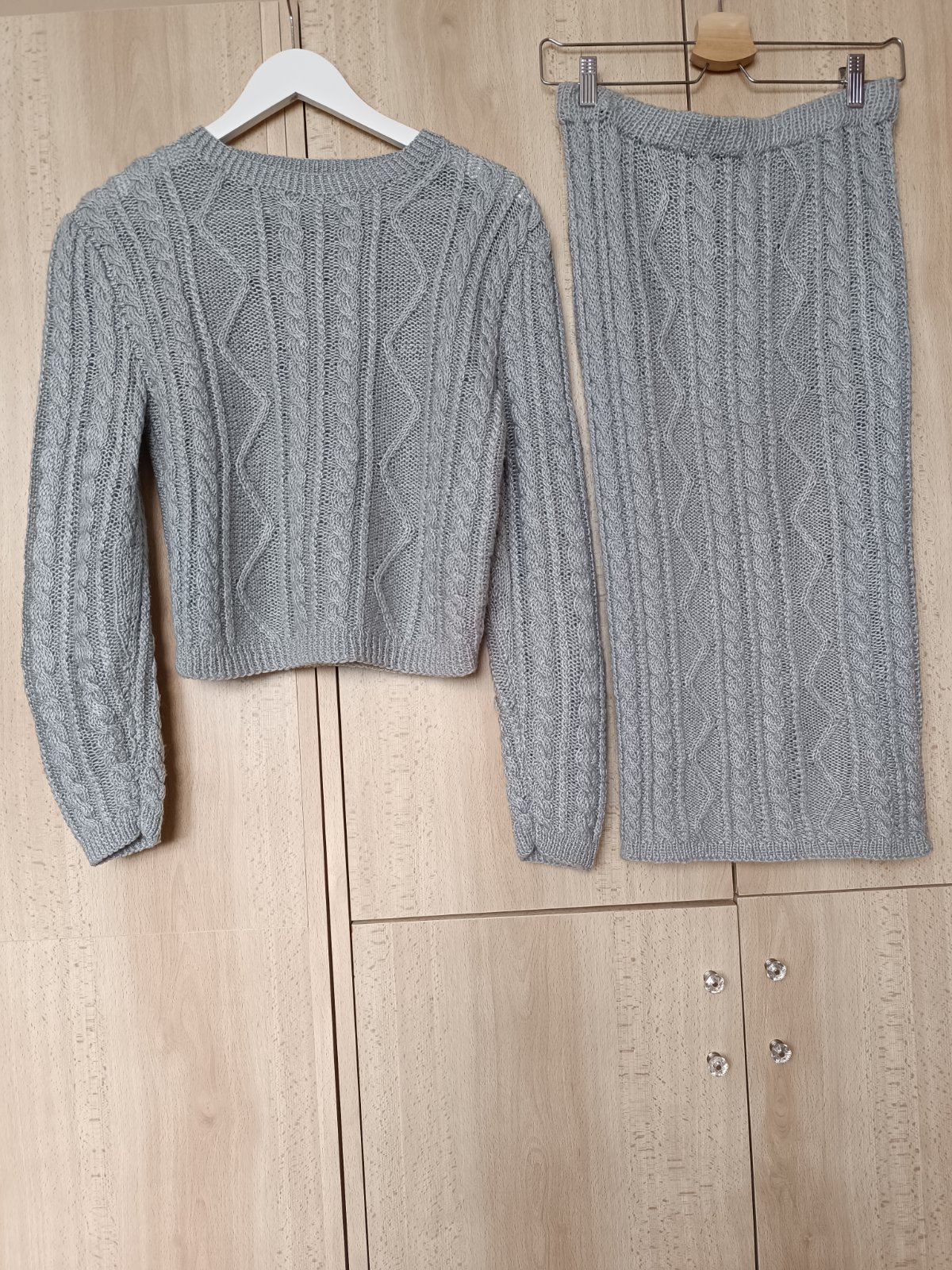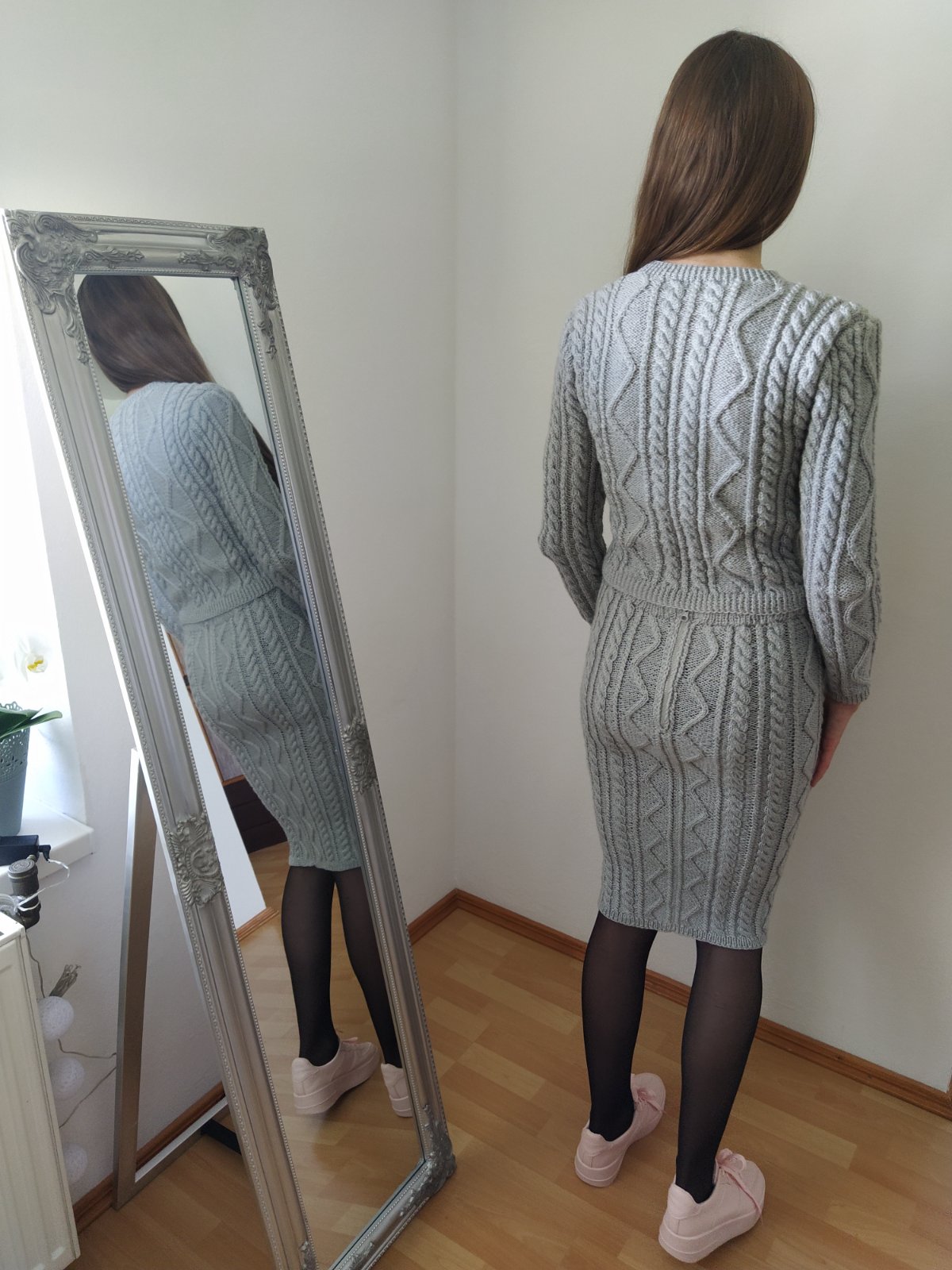 Sivý pletený komplet sveter a sukňa