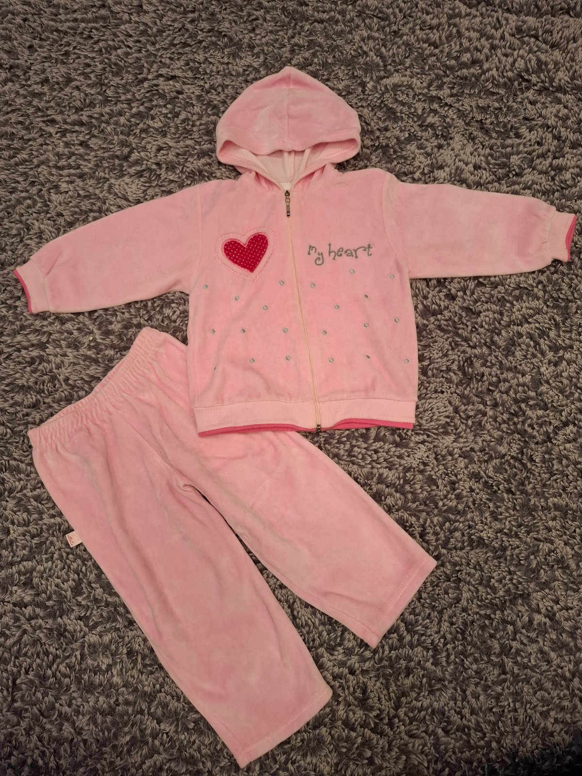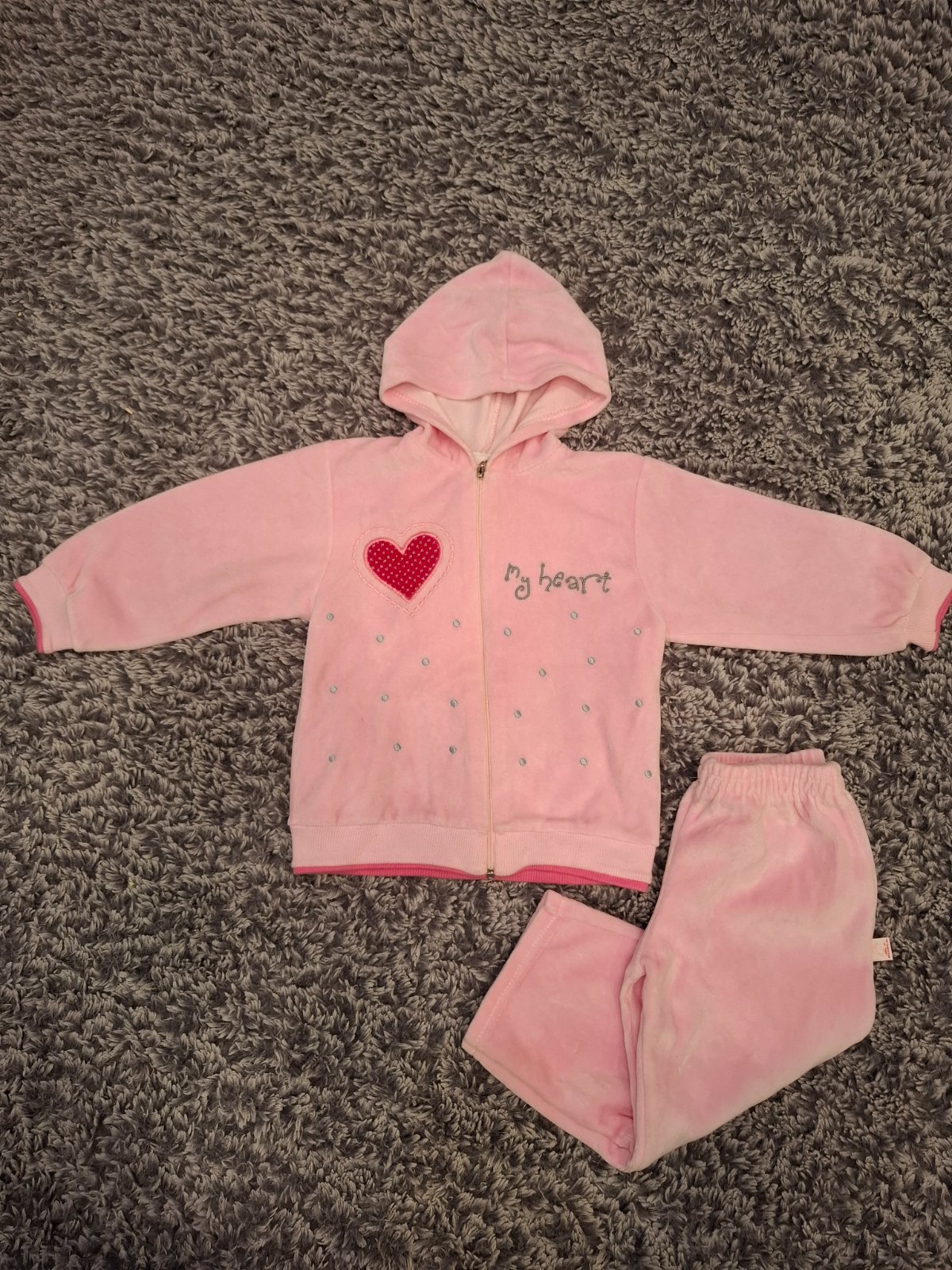 Mäkká flísová tepláková súprava. Bundička s kapucňou sa zapína na zips. Tepláky sú v páse na gumu. Málo nosené, v bezchybnom stave.
