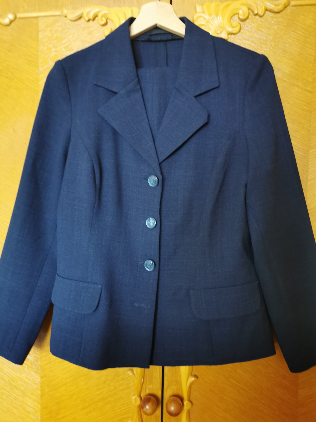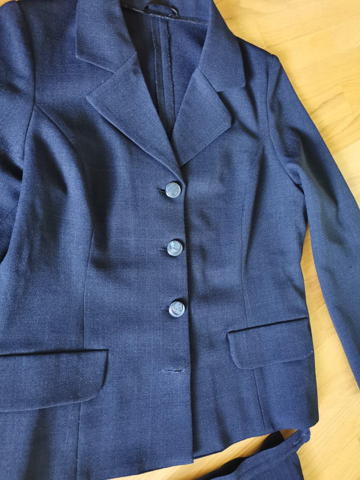 Minimálne nosený, veľkosť 42, ale podľa rozmerov menej. Sukňa pás od 38 do 42 cm (po bokoch je gumka), dĺžka 80 cm. Sako hrudník 52 cm, dĺžka 70 cm. Tmavšia modrá s bielym lemom. Cena 10 eur plus p...