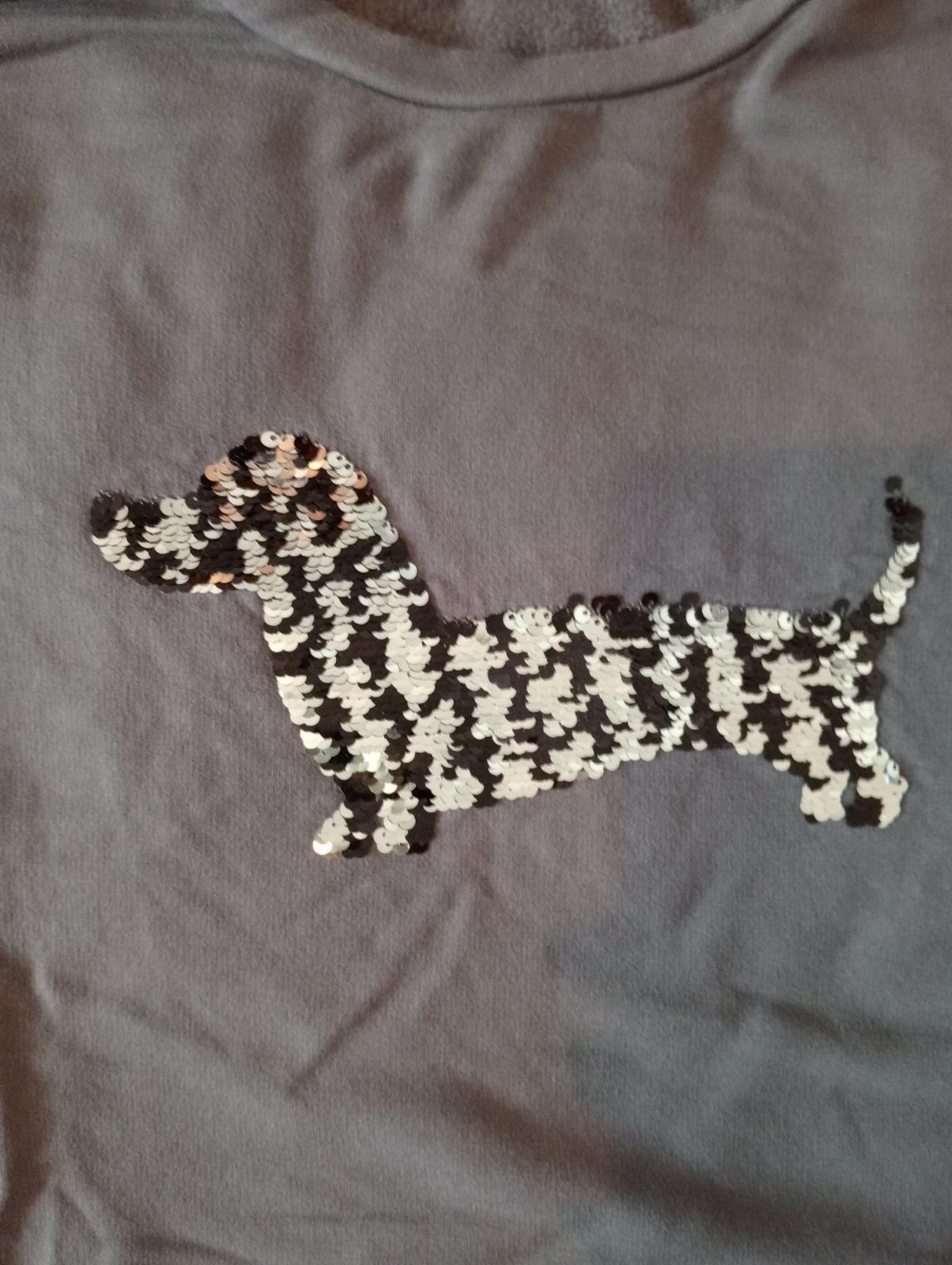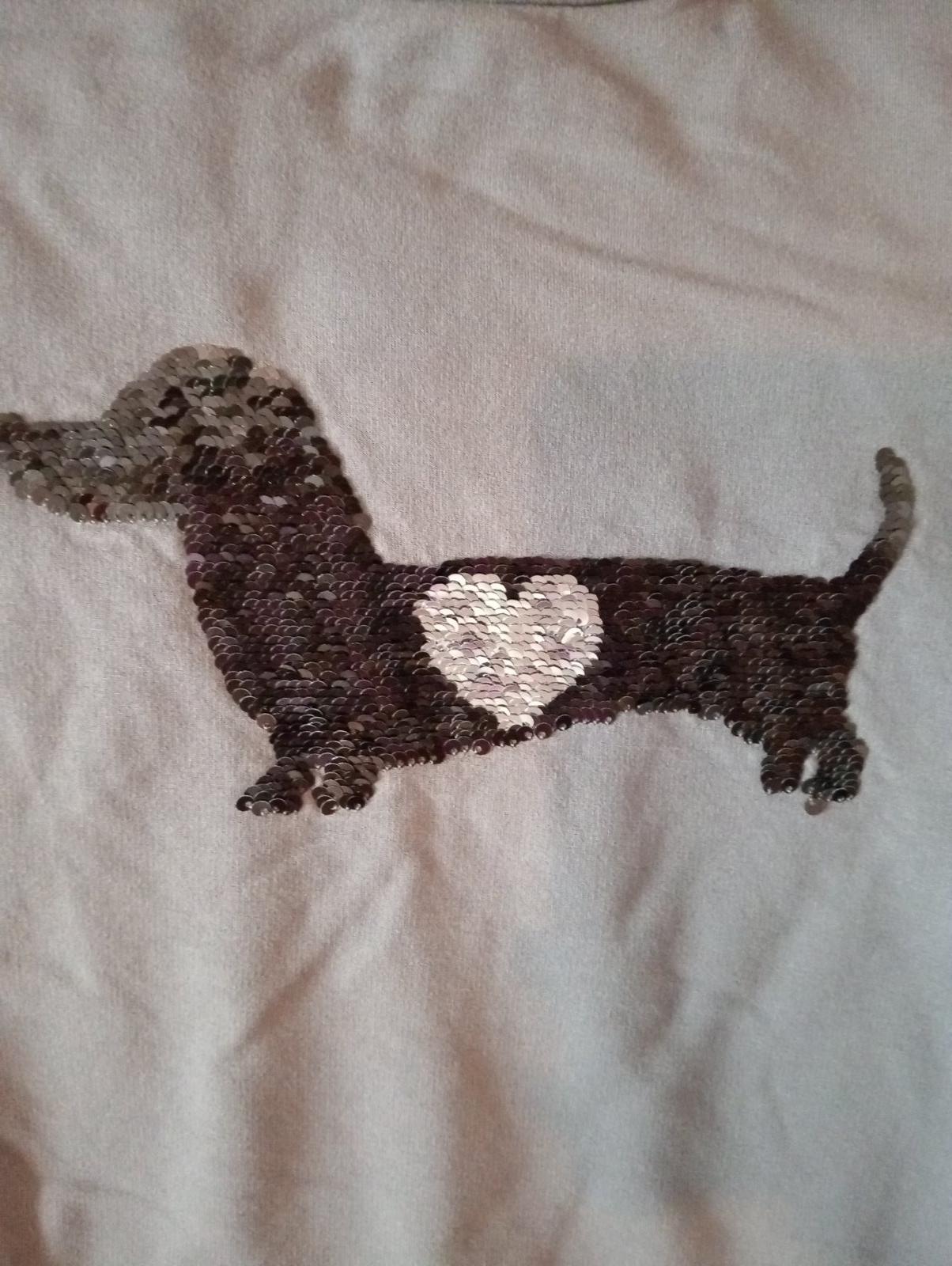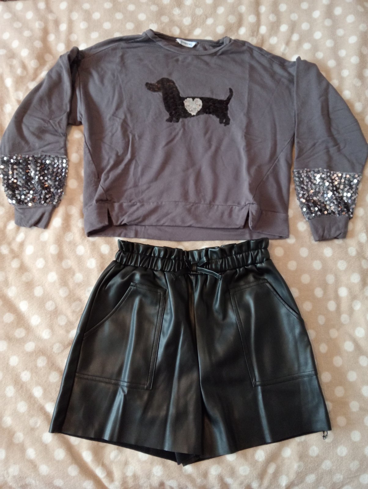 Predám štýlový šortkový komplet vhodný na prechodné obdobie. Elegantná mikina má na hrudi obojstrannú flitrovú aplikáciu jazvečíka, na rukávoch flitrovú aplikáciu. Vnútorná strana je z jemného fleecu. Má voľný strih v štýle crop top. Dĺžka 45 CM, šírka pod pazuchami 45 CM, rukáv od krku 60 CM.