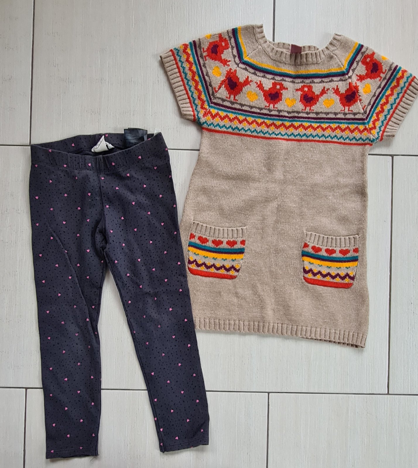 Perfektne svetrikove šaty, velkost 116, nosili sme skôr. Leginy 110. Obe bez vad. Leginky teplejšie