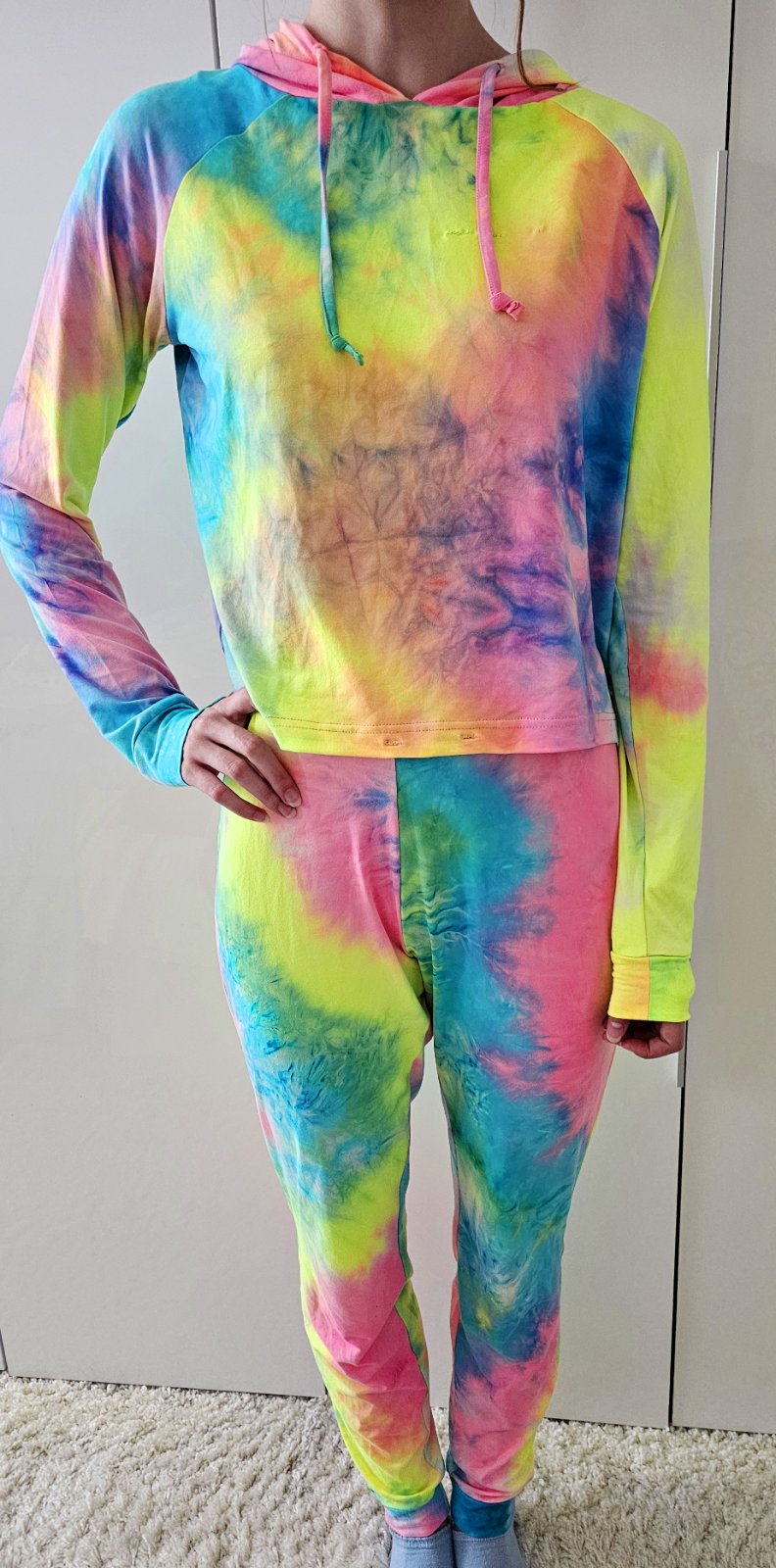 Bunda - dĺžka 50 cm, dĺžka rukáva 71 cm. Nohavice - dĺžka 101 cm. Na prednom diely malé poškodenie, zošité. Zn. Fisherfield.