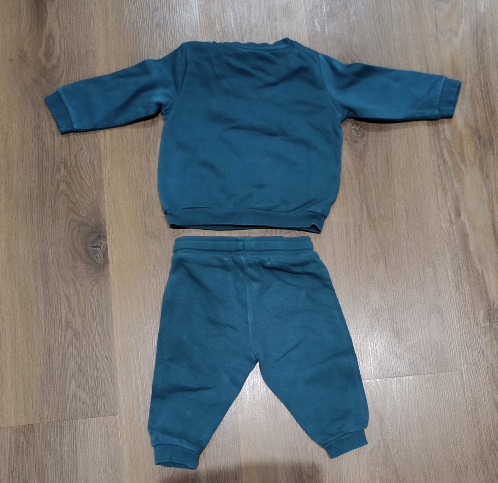 Tepláková súprava mierne zateplená flisom...mikina veľkosť 68 (3-6 mesiacov) a tepláky 74 (6-9 mesiacov)..nosili sme spolu Tepláky majú mierne známky nosenia (minižmolky), ale noseniu to nebráni 😊