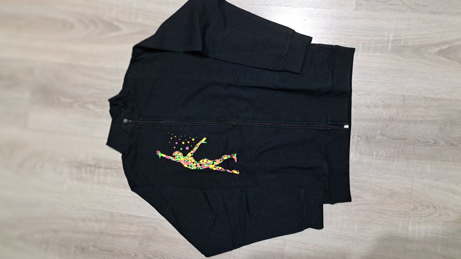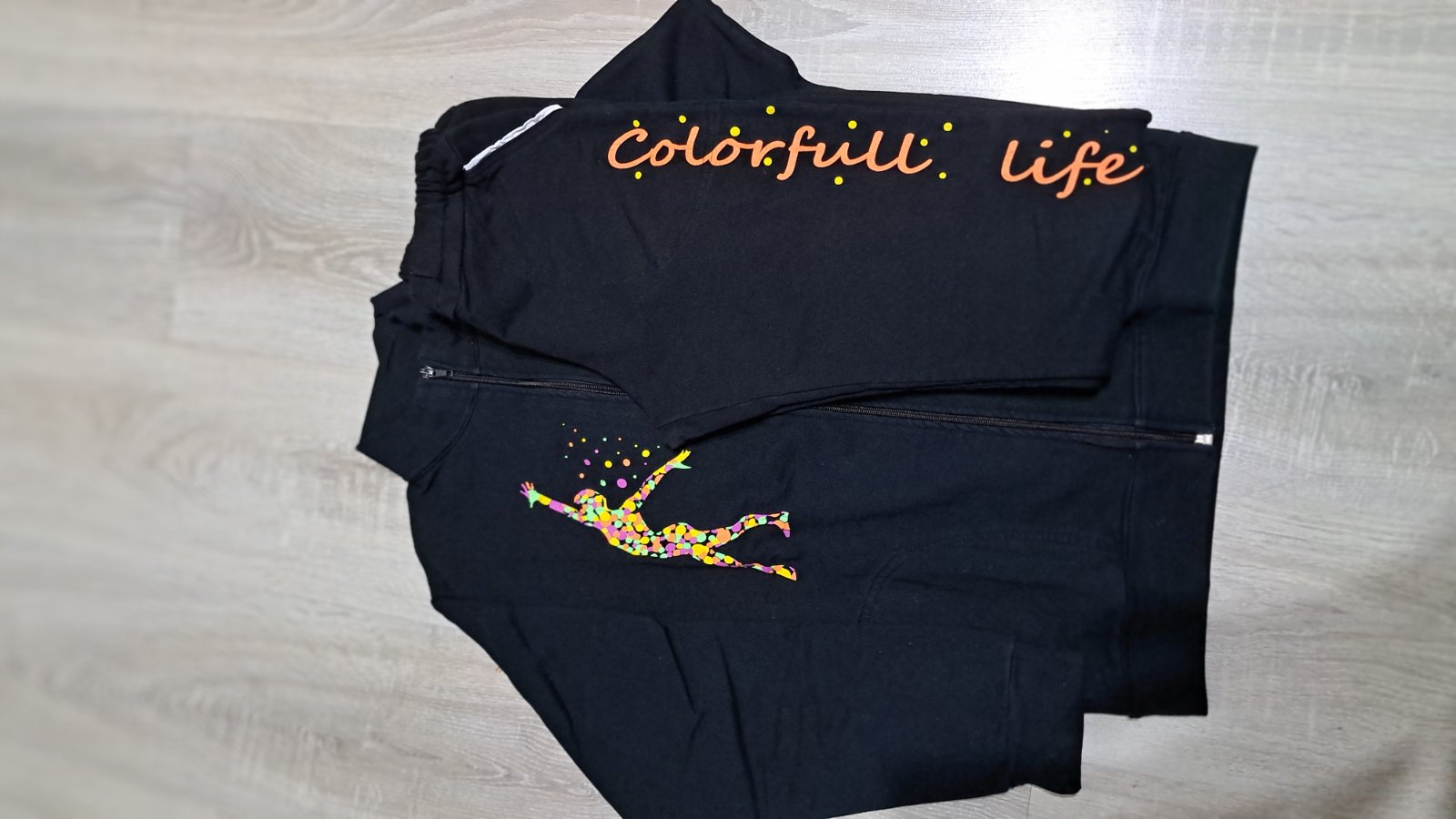 Predám dievčenskú teplákovú súpravu, slovenskej zn.Happy, čiernej farby s farebným nápisom na ľavej nohavici a postavou na pravej strane hrudníka, bunda na zips, bez kapucne, so stojačikom ( mali sme na telocvik), vrecká v oboch častiach, príjemná bavlna aj zvnútra, v peknom stave.