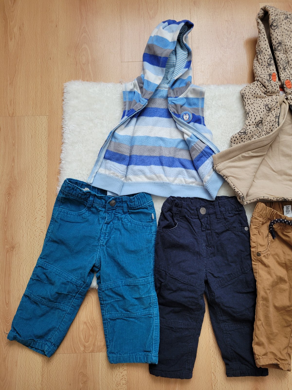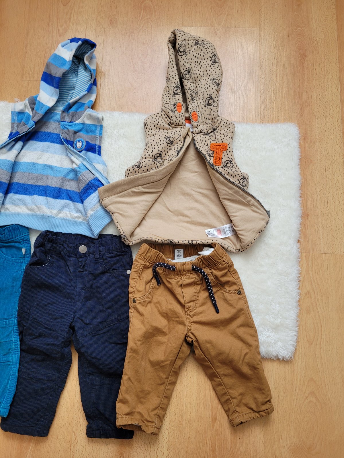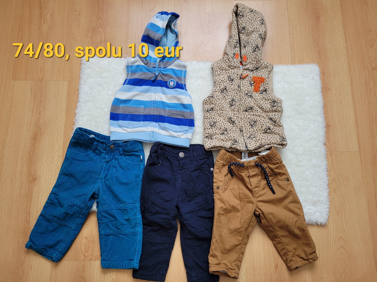 Predám pekne zachovalé nohavice 3ks a 2 vesty, jedna hrubšia, druhá tenšia, veľkosť 74/80, cena spolu 10 eur