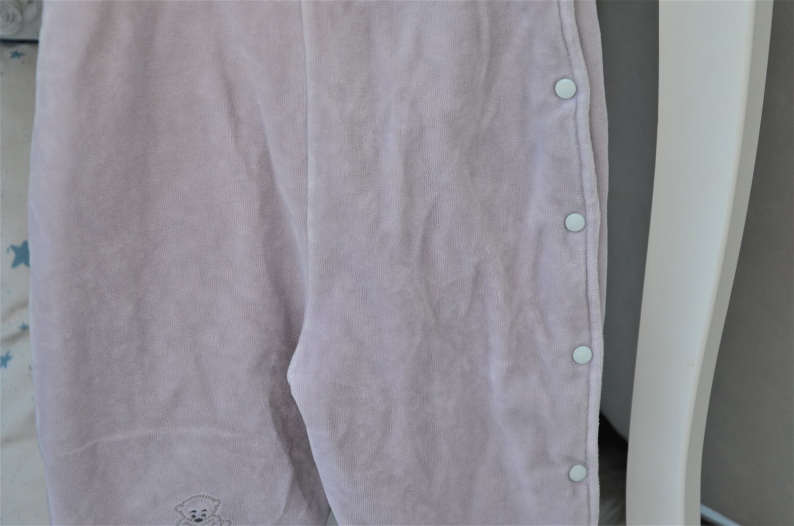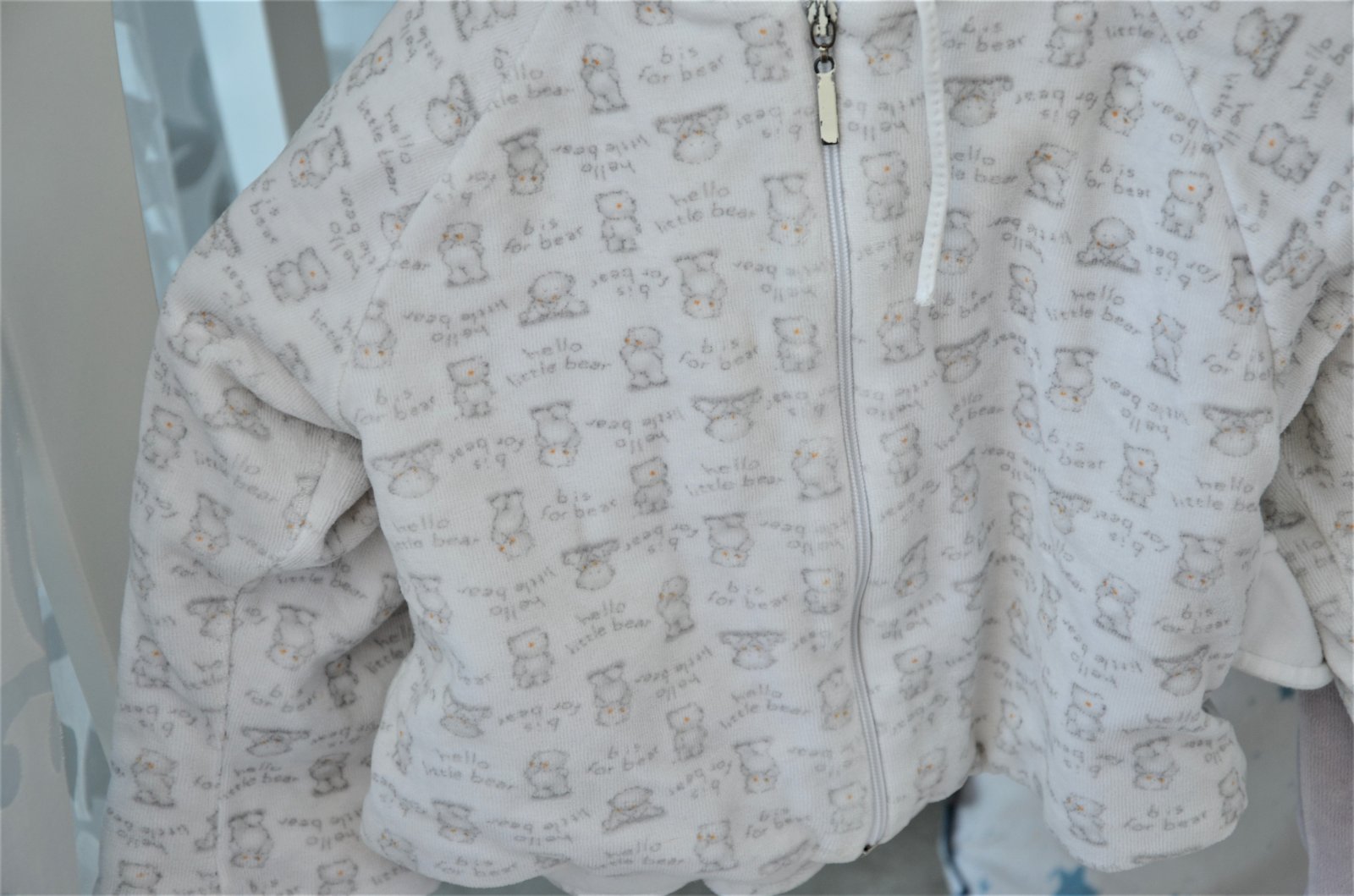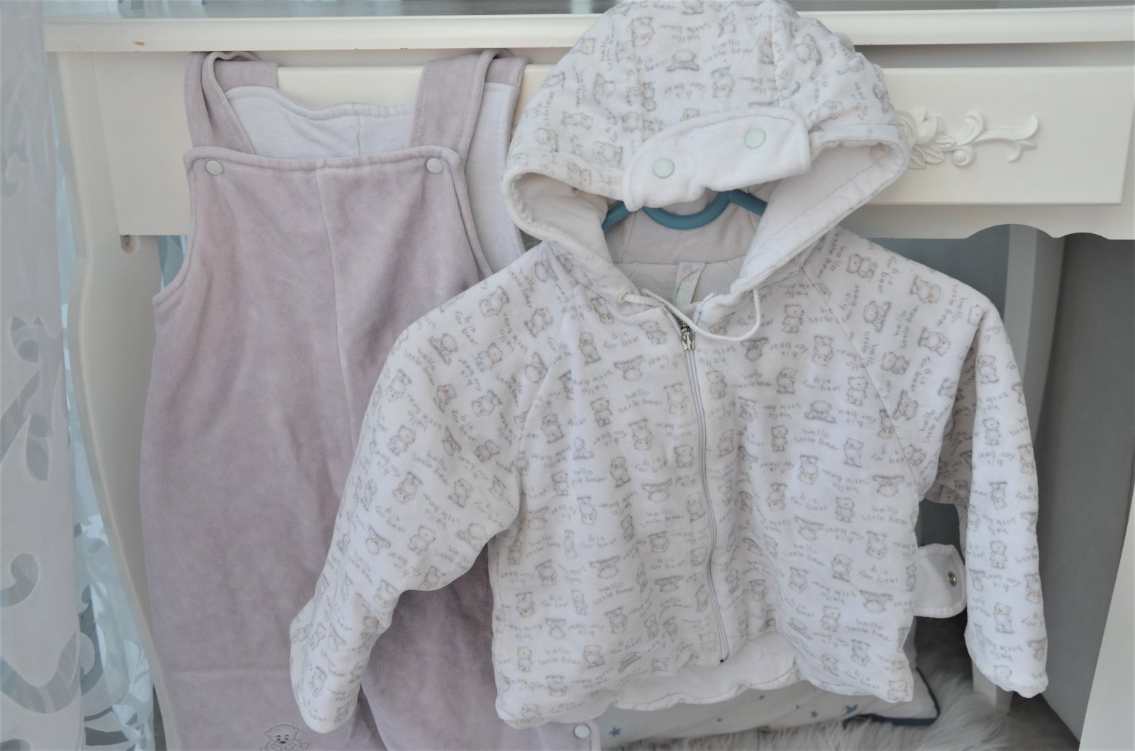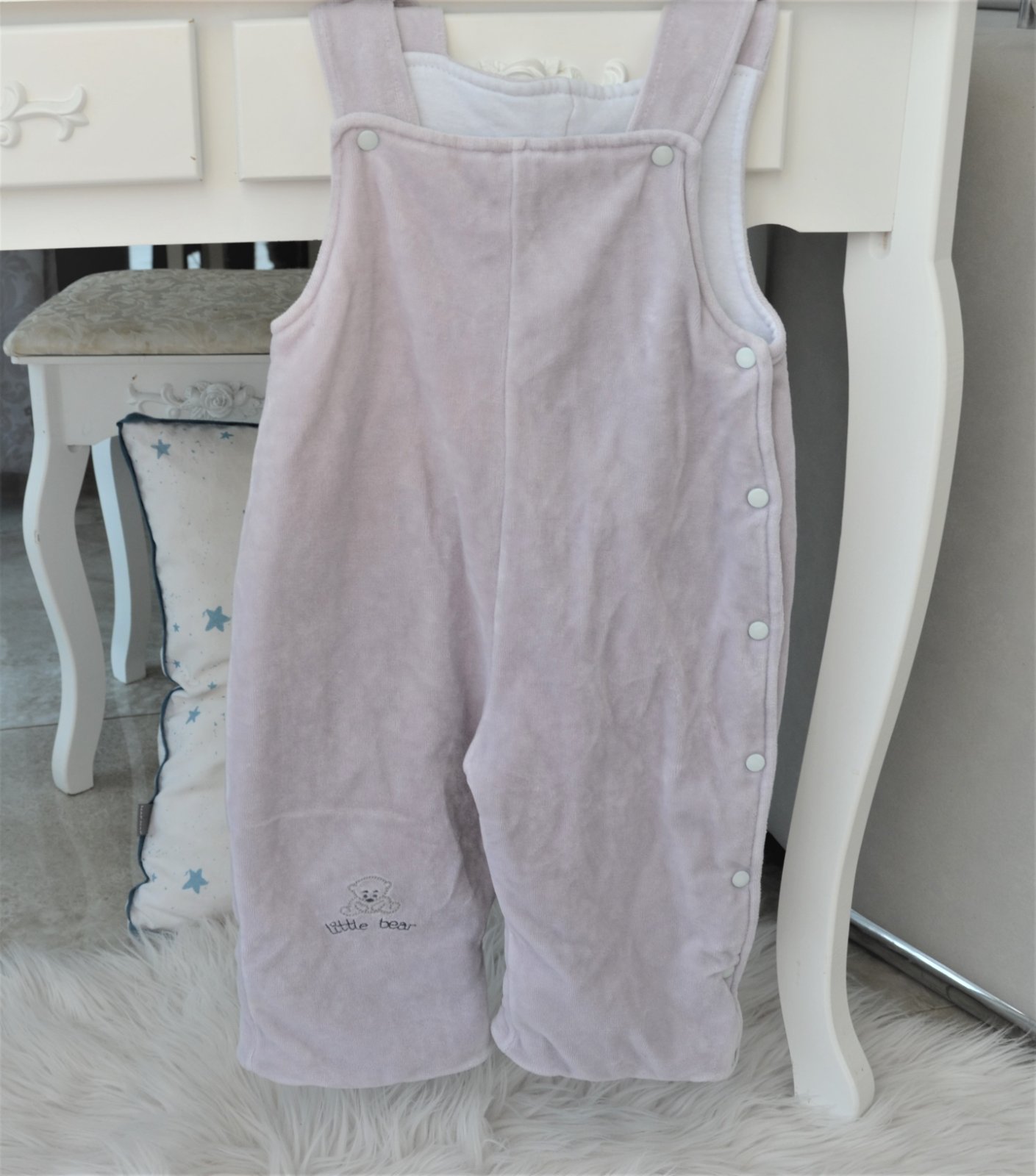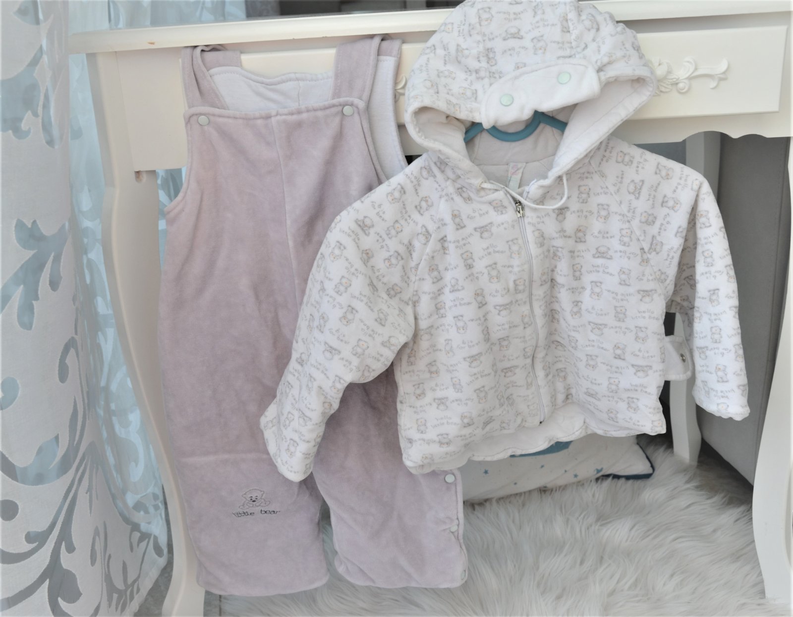 nevymieňam!!súprava bola použitá asi 3 x,í,hrubá,velúrová,teplá,bundička je bielej farby s macíkmi,zapínanie na zips,dĺžka bundičky 32cm,šírka 30cm,rukáv od krku 31cm,s kapucňou,nohavice sú takej svetlo šedej farby,dajú sa rozopnúť na boku po celej dĺžke,sú akoby na traky,taktiež hrubé,teplé,celková dĺžka 60cm,šírka 2 x32cm,merané je to cez stred,na nožičke vyšitý macko s nápisom little bear,pc bola okolo 40 eur,dostali sme,len sme nestihli nejako vynosiť,..kuk aj na iné moje inzeráty