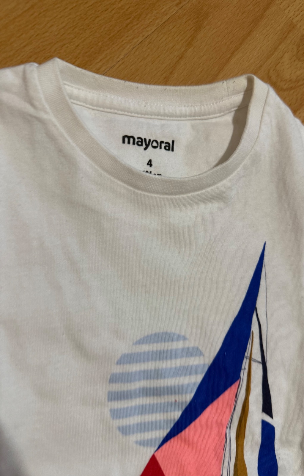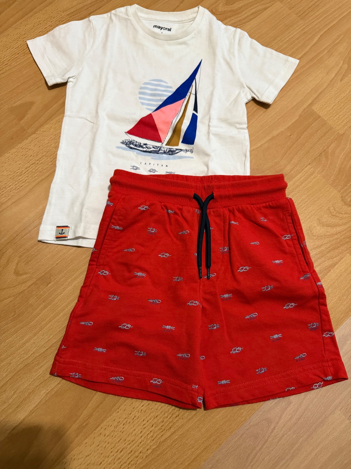 Kraťasy Mayoral 2x vzaté, na jednej nohe bodky od fixky (neskúšala som špeciálne oprať), pri nosení nevidno, košela little kids nová bez visačky.