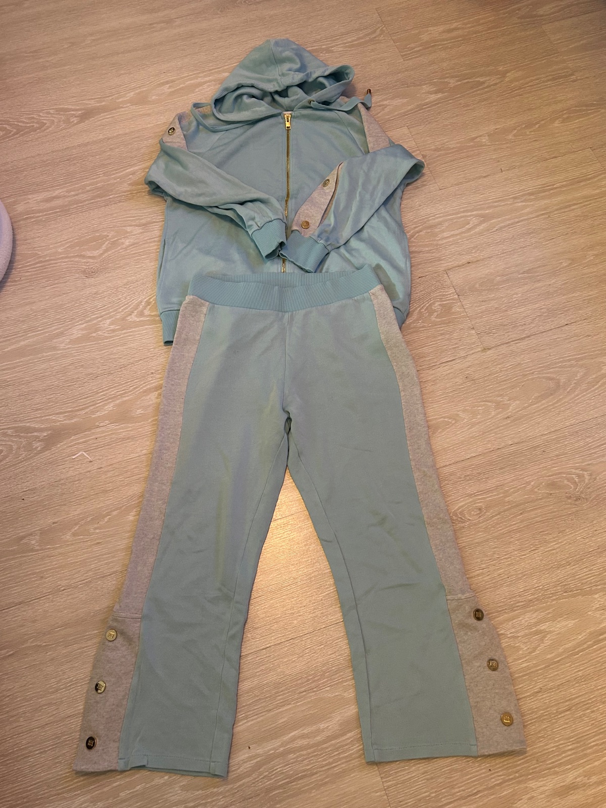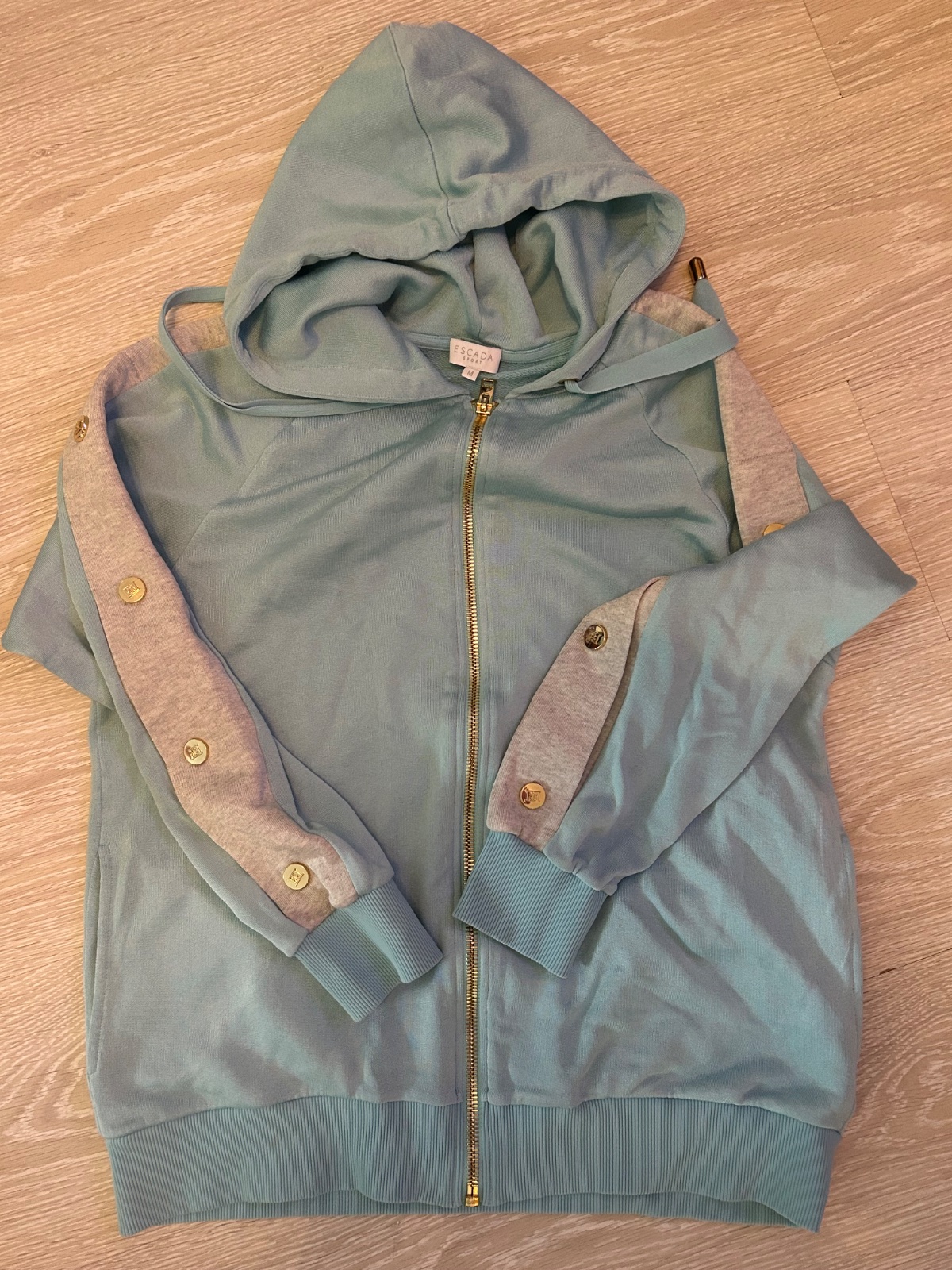 Krásna a pohodlná teplakova súprava ESCADA , ľahký a padavy materiál, bez poškodení . Tepláky 3/4 voľný strih dĺžka 89cm , voľne . Sadne na L aj XL