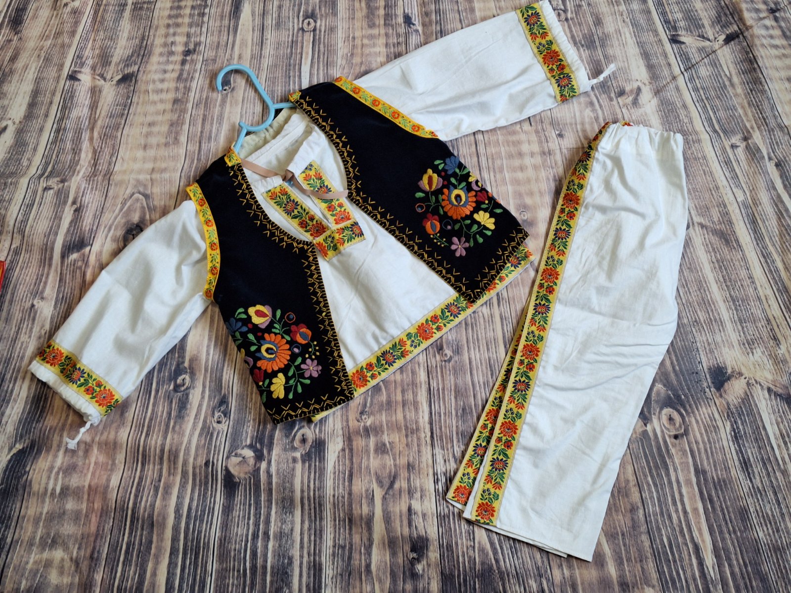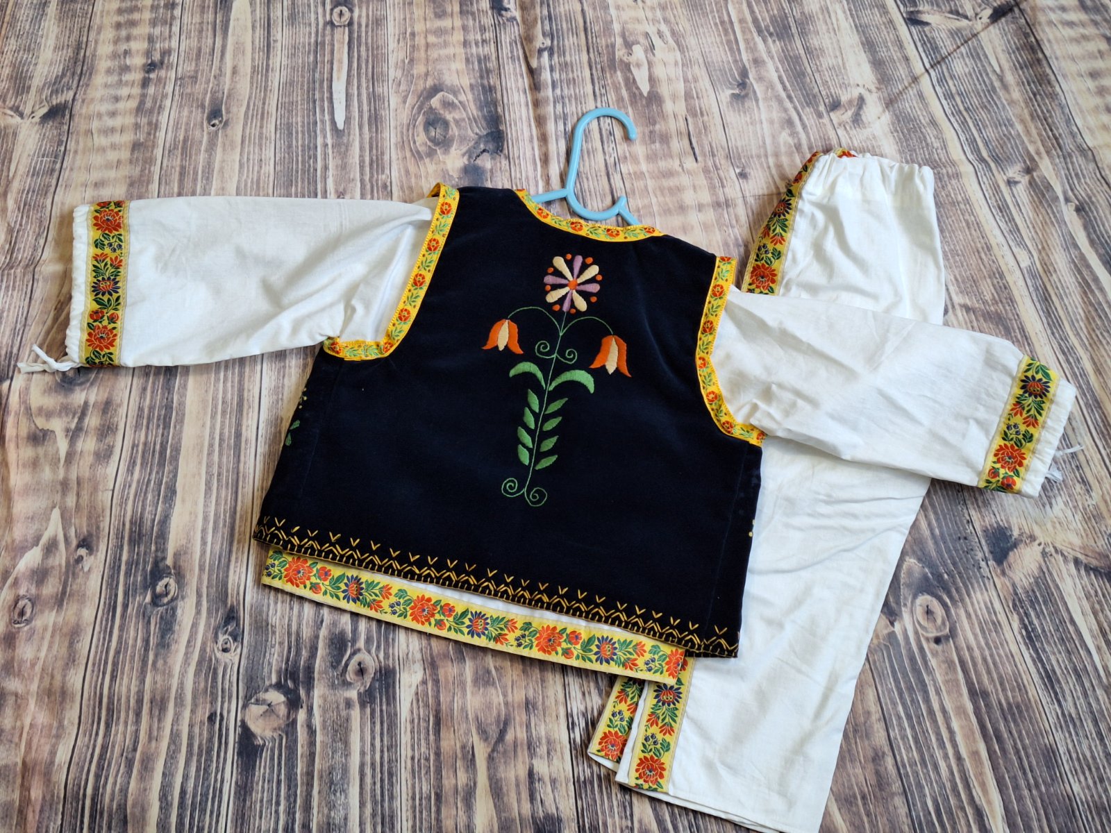 Predám krásny detský ľudový odev cca veľ 104/110 /rada premeriam/. Košieľka a nohavice boli šité na zákazku ku vestičke. Vesta je veľmi stará, originál, ručne šitá. Vidno už známky, že je stará.
