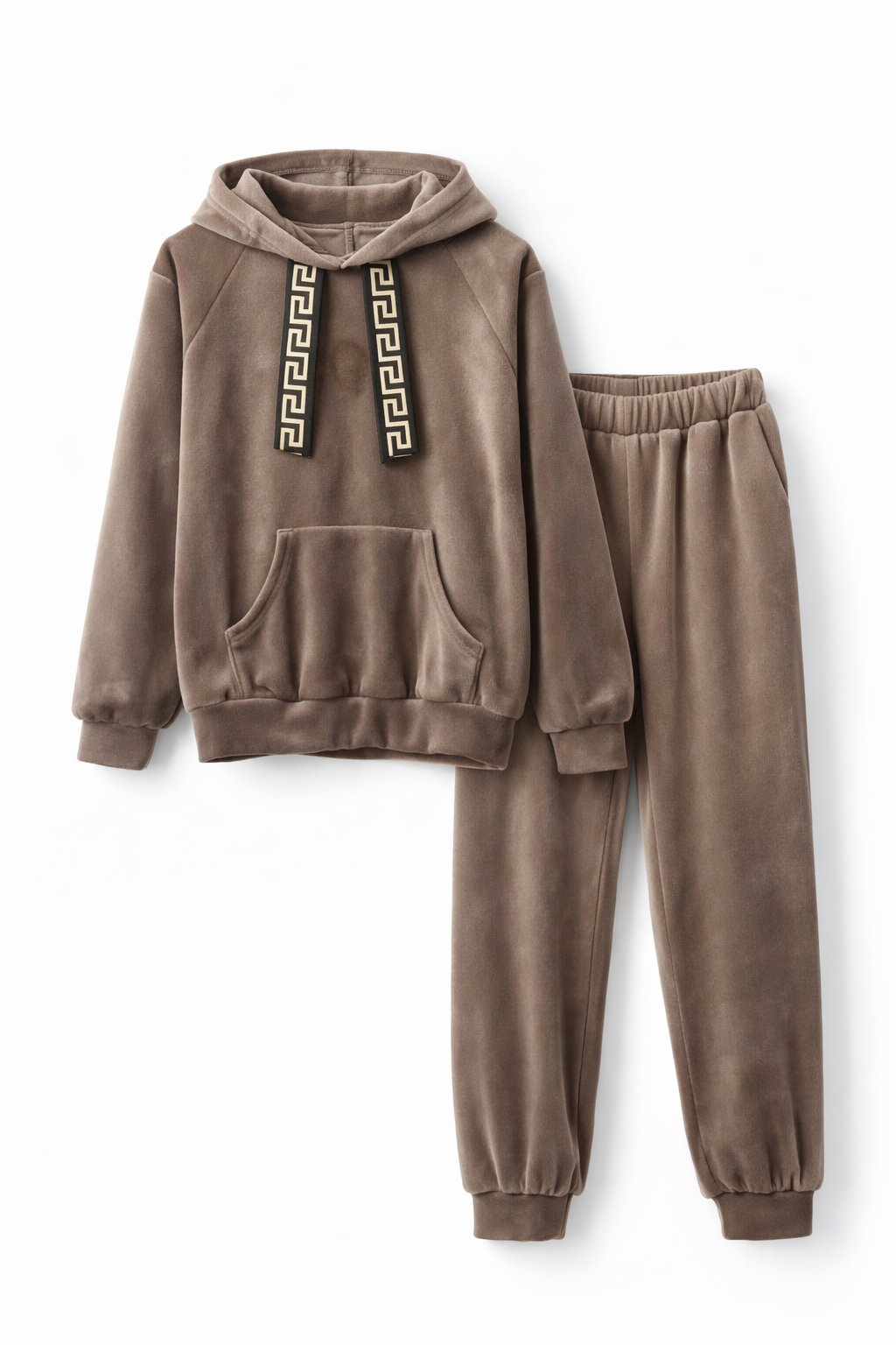 Mäkký velúr je príjemný na dotyk, hrejivý a vhodný na nosenie počas chladnejších dní. Mikina má moderný strih a ozdobné šnúrky na kapucni, ktoré dodávajú kompletu trendy vzhľad. Nohavice na gumu sa ľahko obliekajú a prispôsobia detskej postave.