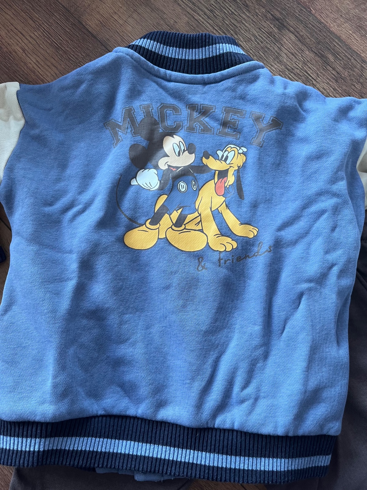 Nový tenký set modrých teplákov a mikinky s Mickey Mouse. Veľkostne 86/92 žiaľ nesadla nám veľkosť.