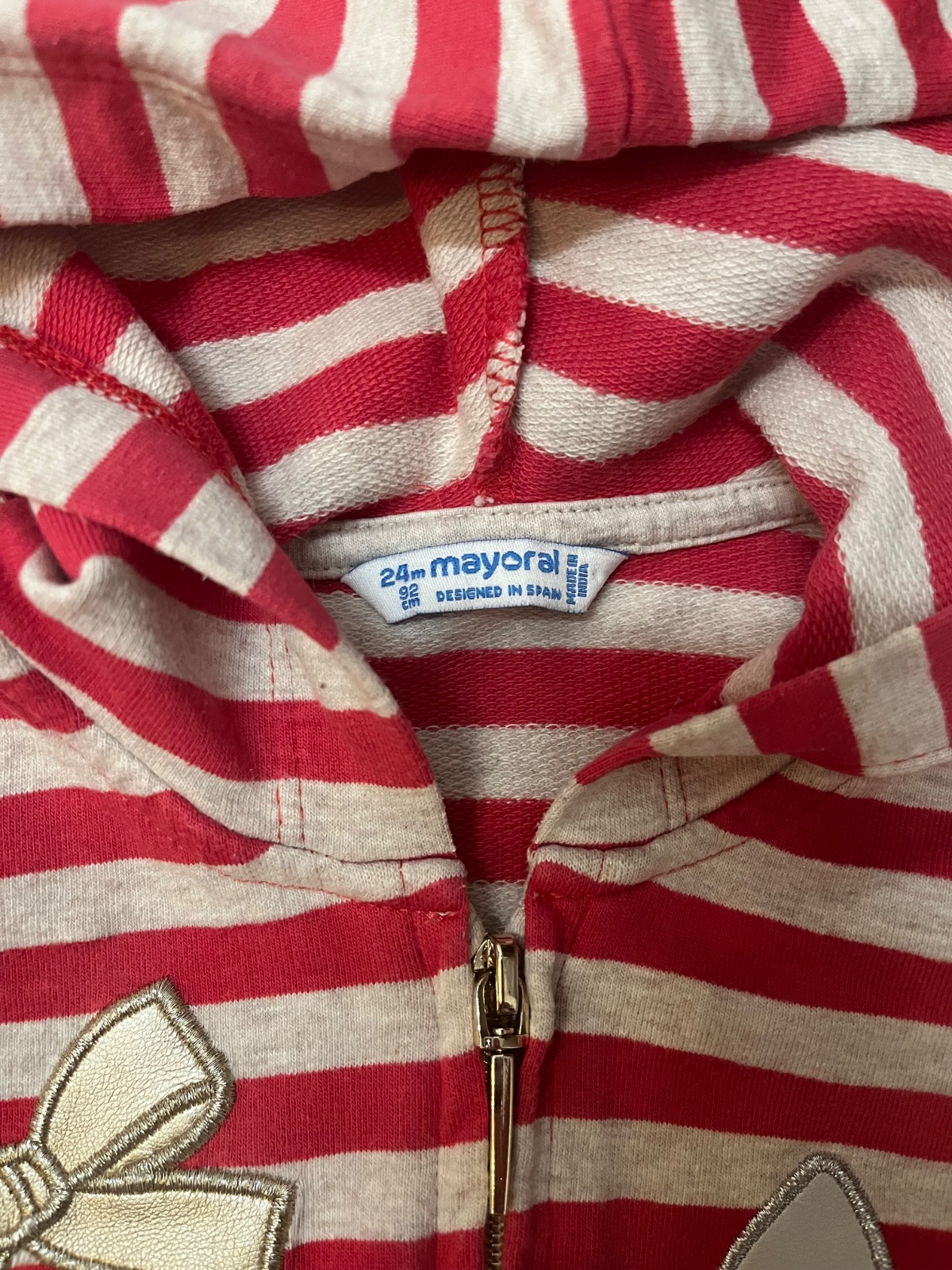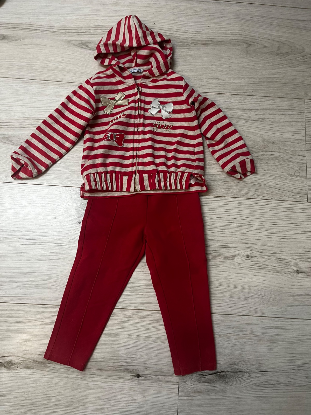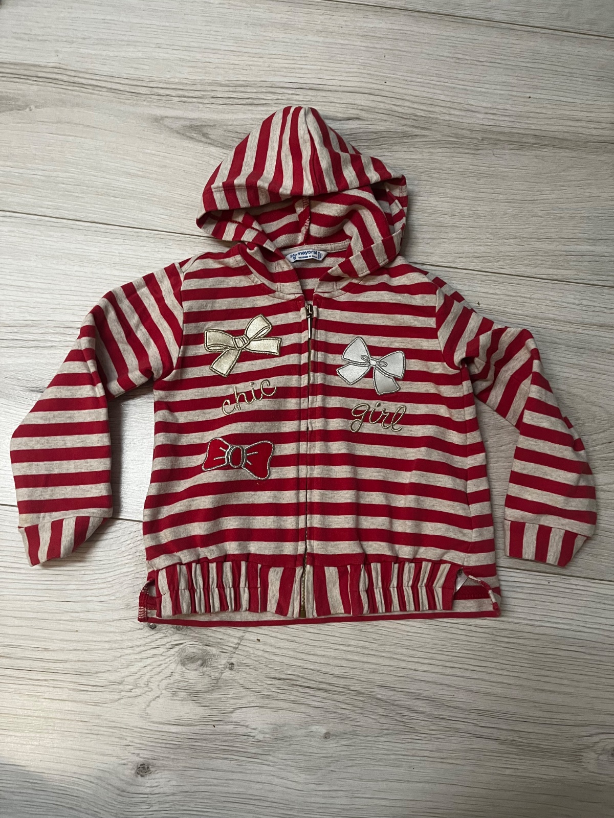 Predám teplakovu súpravu značky Mayoral, veľkosť: 92. Pásikava (červeno/bezova) mikina ma kapucňu a zapína sa na zips.