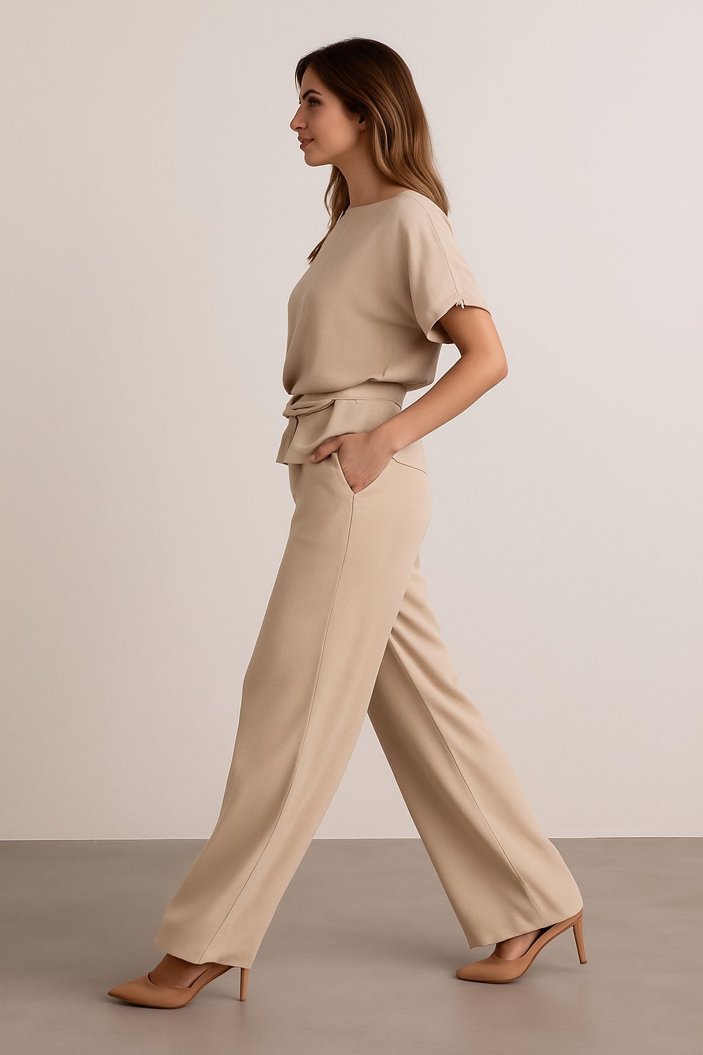 Elegantný dvojdielny komplet v béžovej farbe s viazaním v páse a širokými nohavicami. Ideálny na oslavy, pracovné stretnutia aj bežné nosenie.