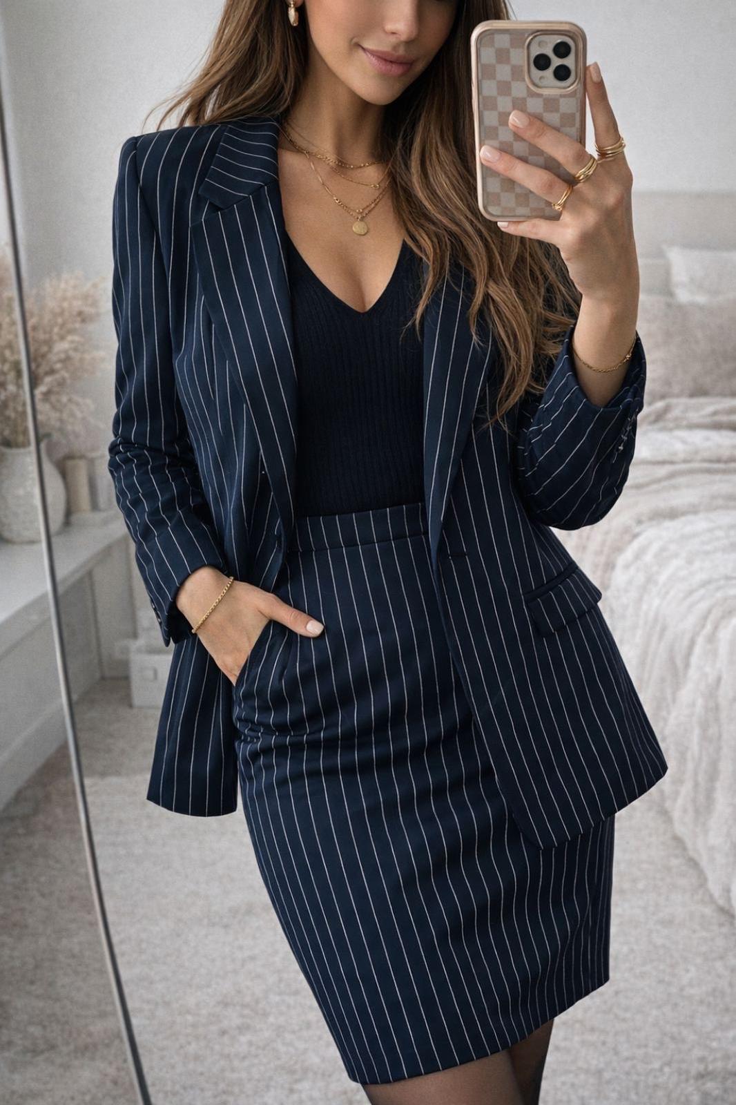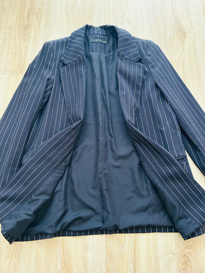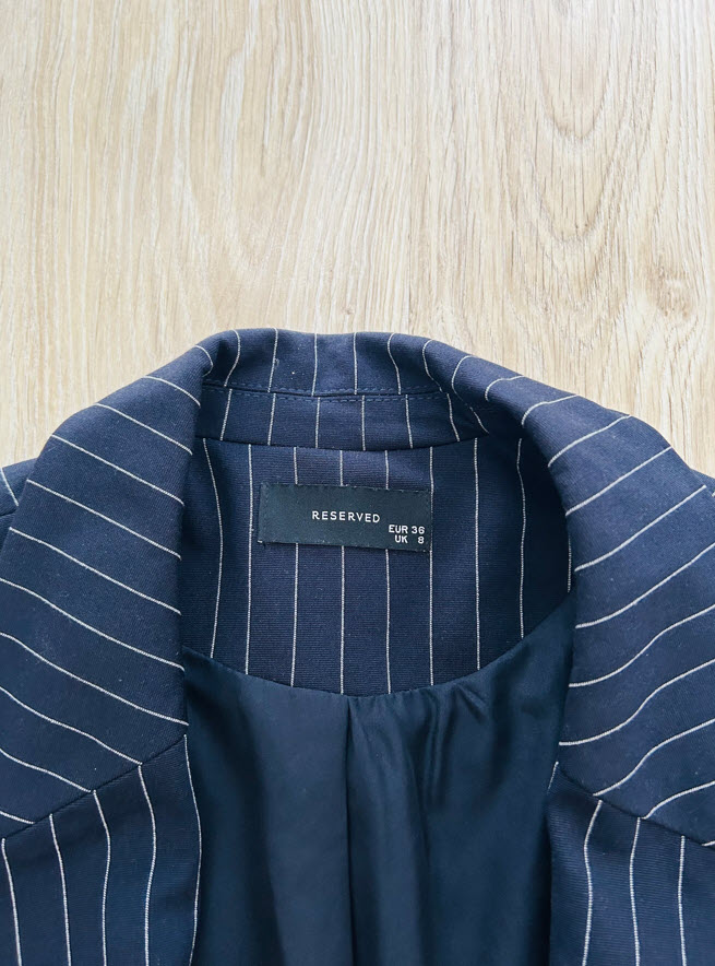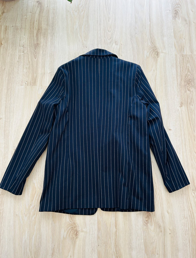 Sako je vo veľkosti S, ale sedí aj na M. Je tmavomodrej farby s bielymi prúžkami, vpredu má dve vrecká. Je to nadčasový kúsok, ktorý sa dá použiť do elegantných, ale aj športovejších outfitov.