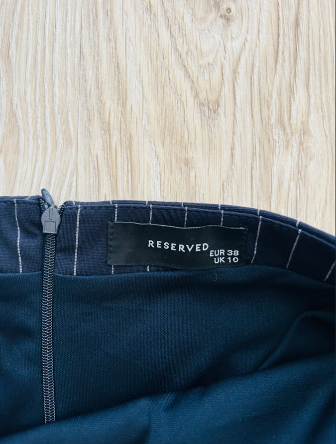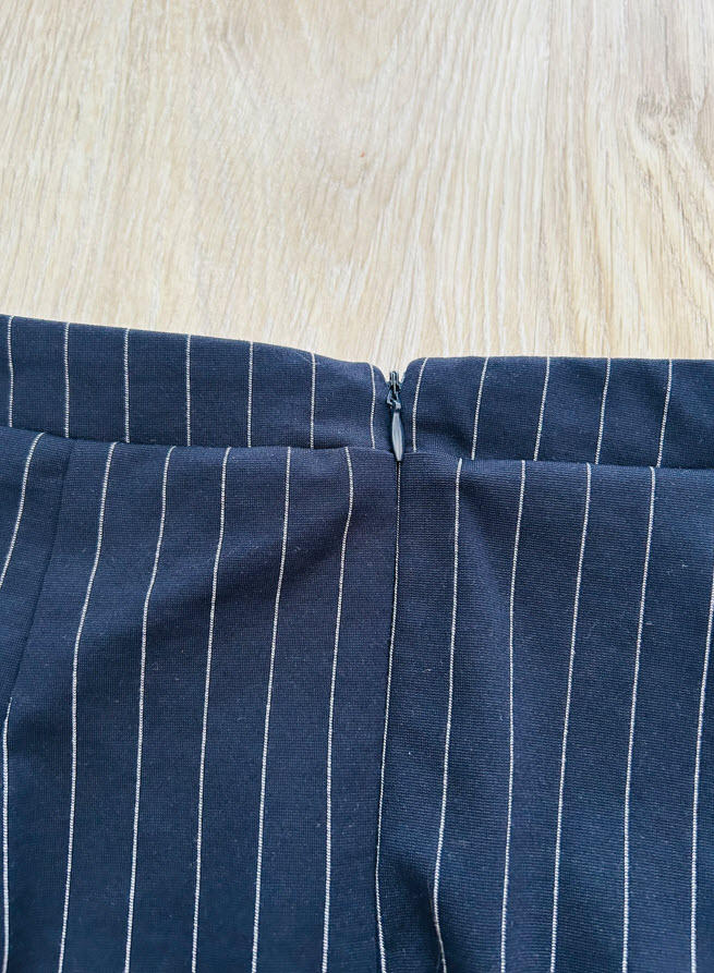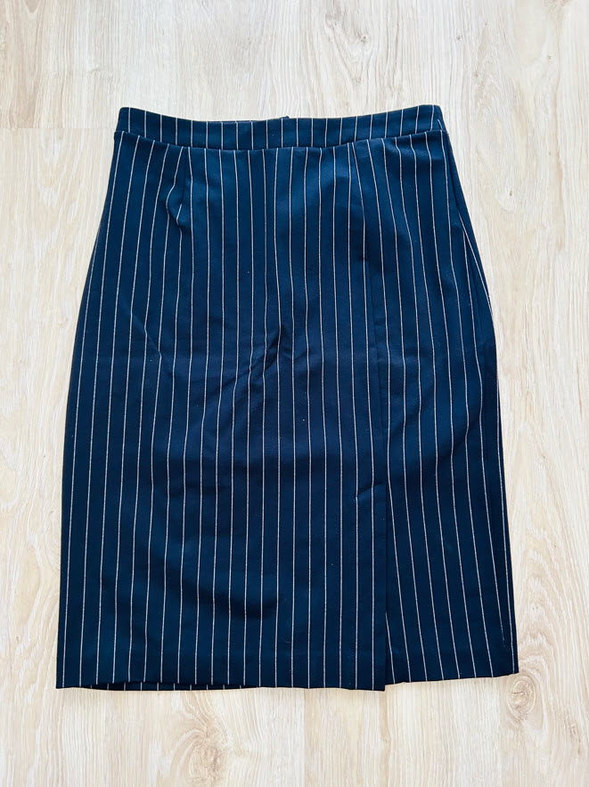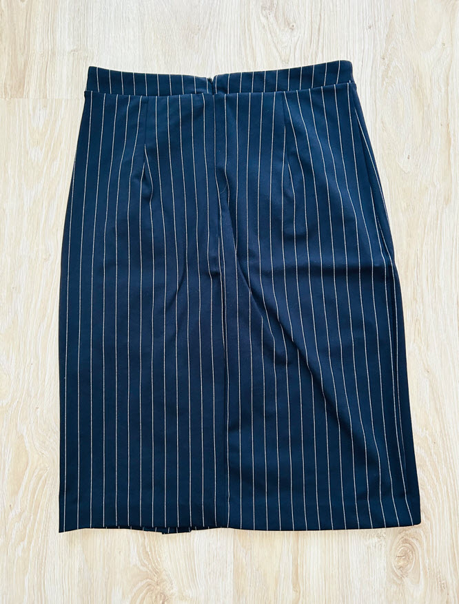 Puzdrová sukňa je vo veľkosti M. Sukňa je tmavomodrej farby s bielymi pruhmi, vpredu na boku má rozparok, vzadu sa zapína na skrytý zips.