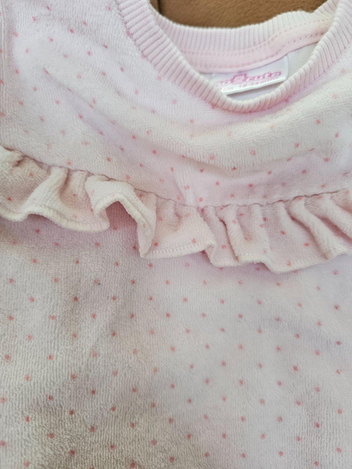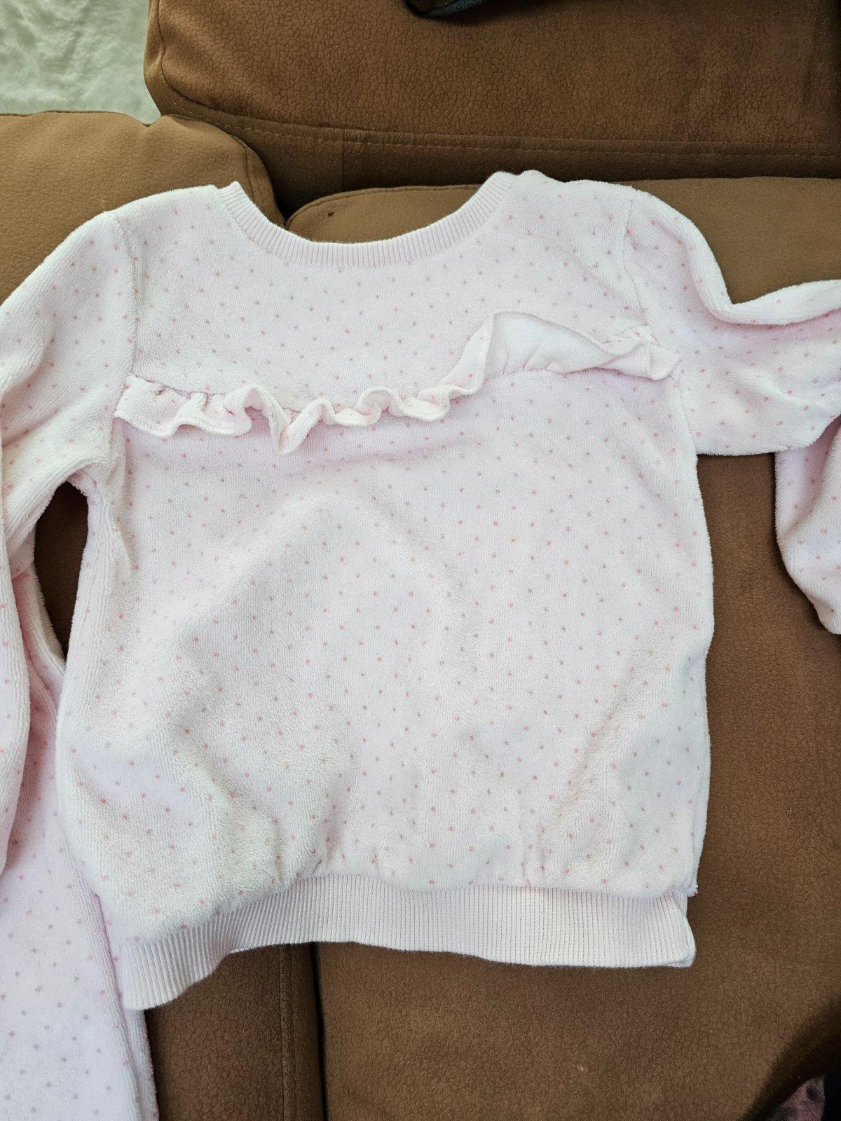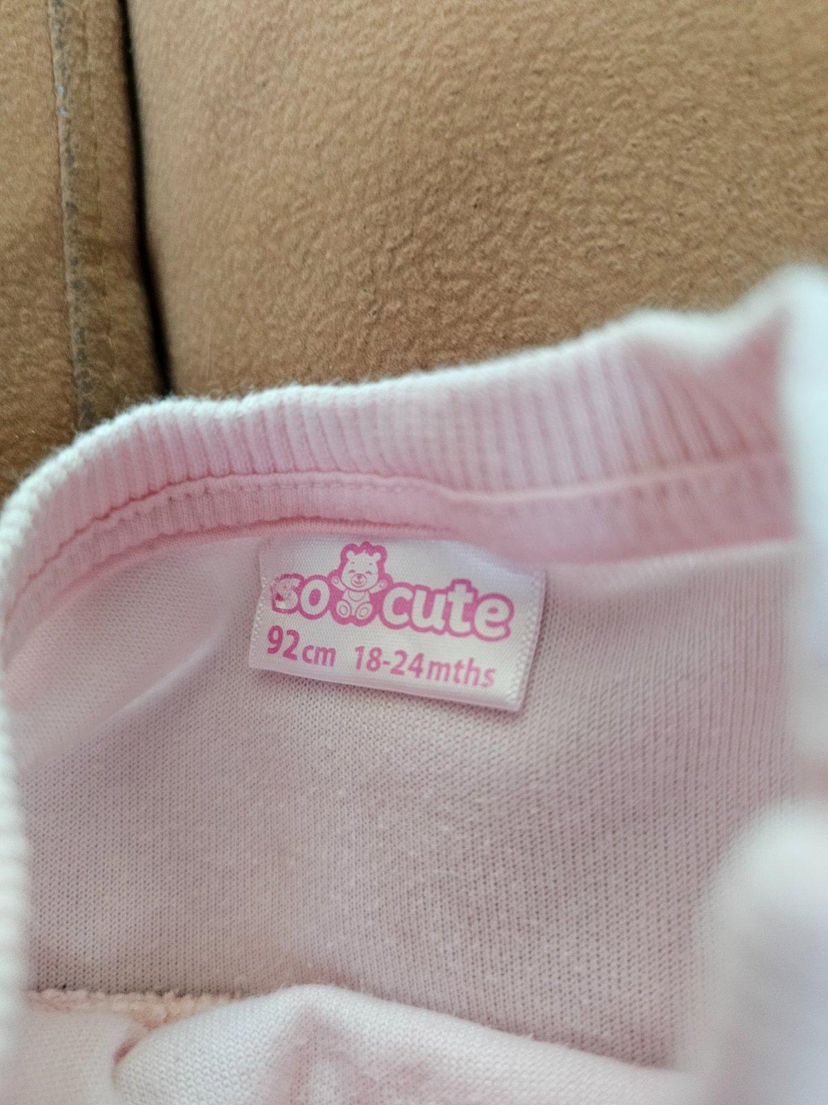 Krásna supravicka, mikinka aj tepláčiky 92, mikinka ma zapinanie na ramienku, aby bolo vacsi otvor na hlavicku a vprefu volanik. Teplsciky v pase guma snurka, na zadocku volanik.