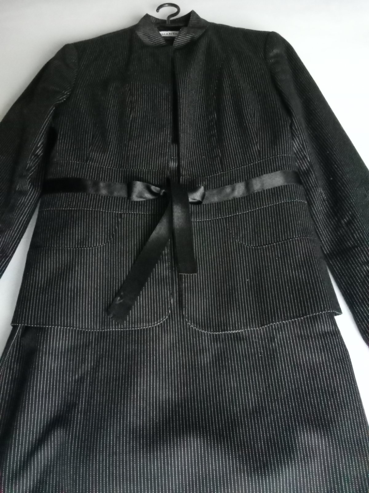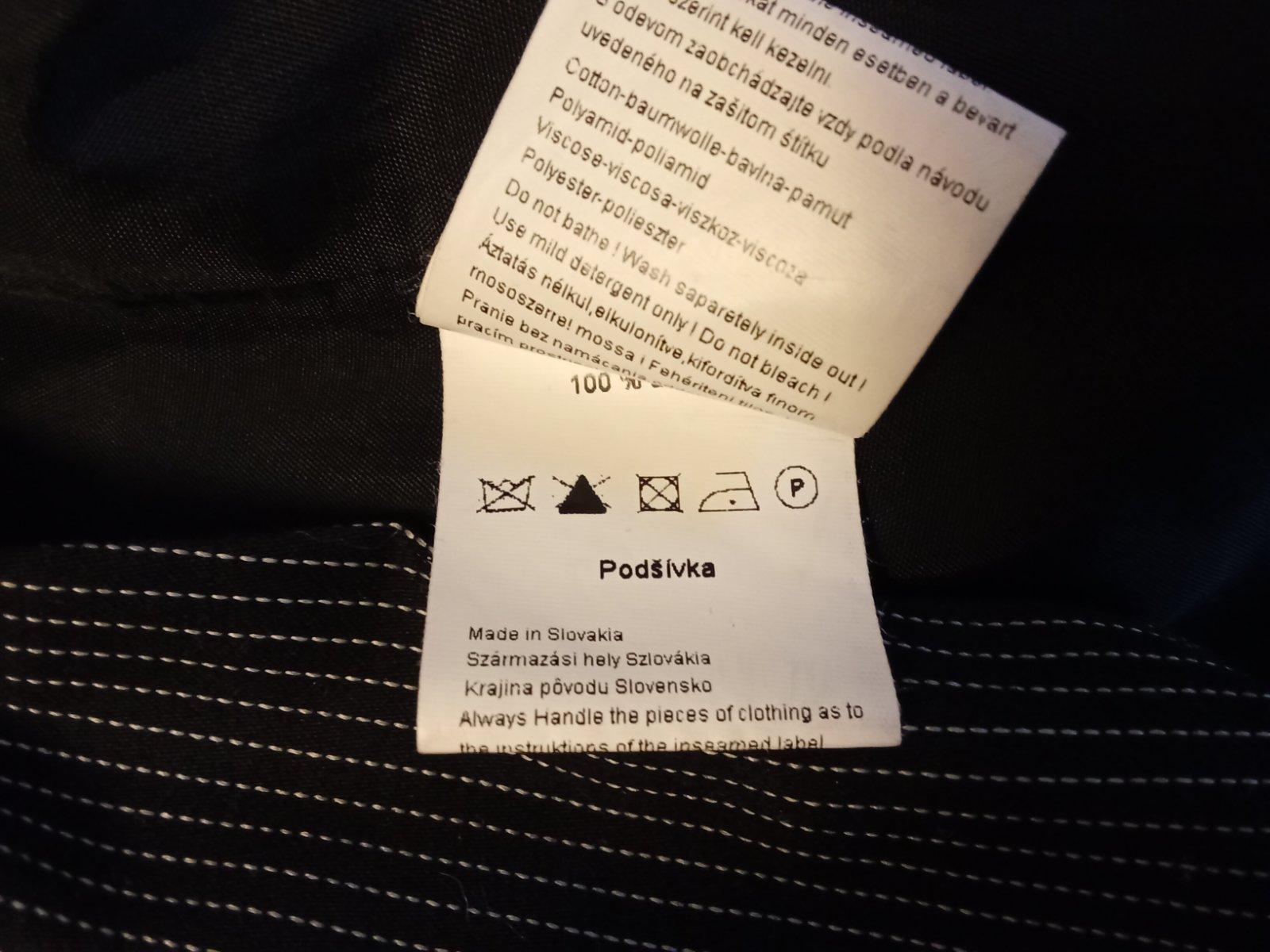 Kvalitný elegantný kostým zn. Hankin mode, slovenský výrobok. Podšité sako, pekná fazónka, zapínanie na 2 gombíky, dl. 60 cm, vrecká, cez prsia 41 cm, vypasovaný pás 36 cm, spodok 46 cm, dl. rukáva...